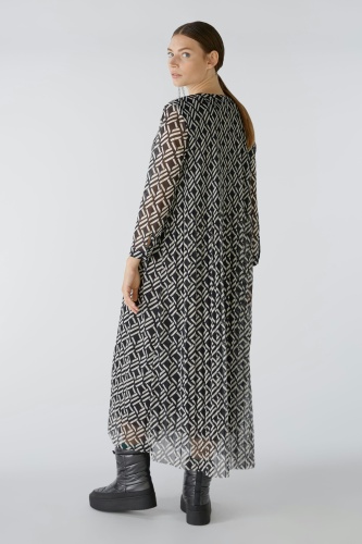 Струящееся платье из сетки со складками и принтом по всей поверхности. Свободный крой, длина миди. Круглая горловина с длинной планкой на пуговицах, легко надевается. Рукава длиной 3/4 с манжетами и маленькой пуговицей. Плотно прилегающие складки на верхней части тела, свободные и струящиеся в области юбки. Длина для размера 42: 126 см.