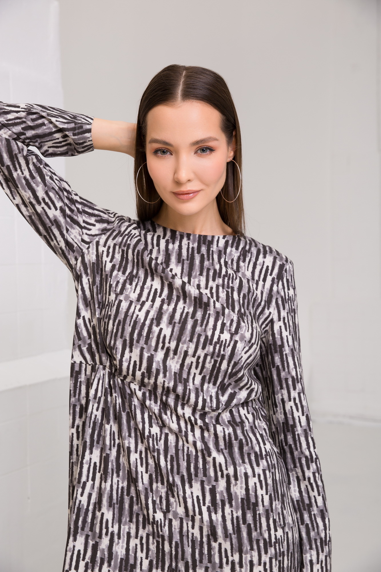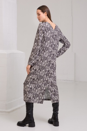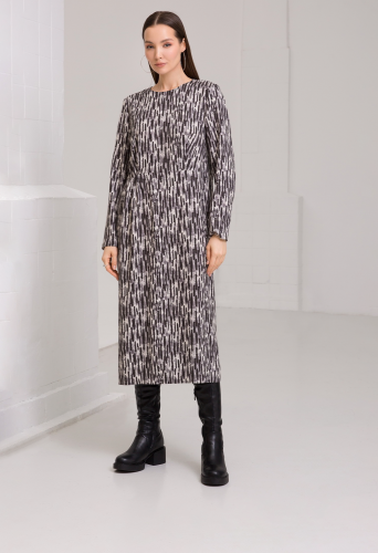 Игривое платье с принтом. Полуприталенная модель с декоративными сборками по линии пояса.