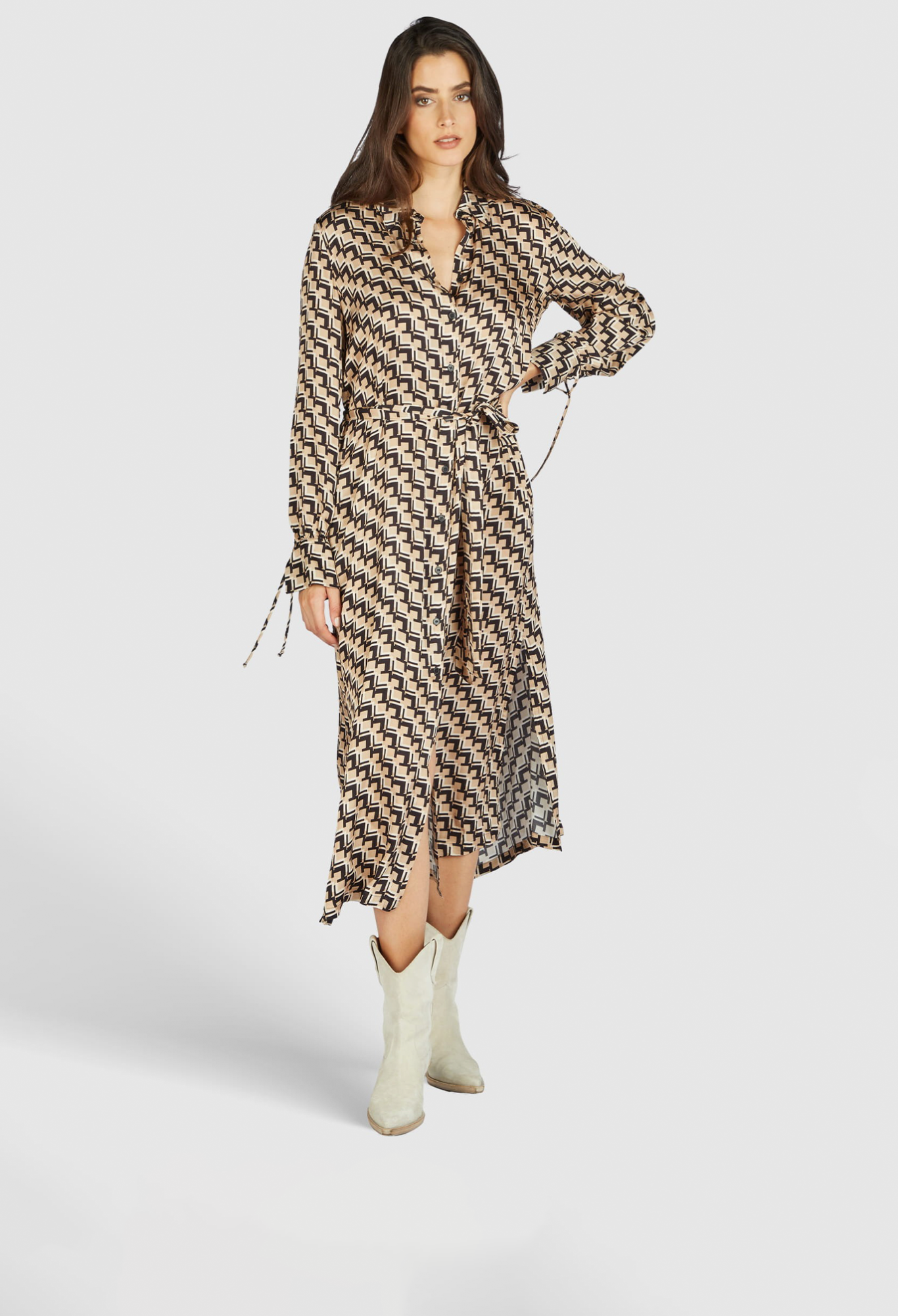 Платье-макси из вискозного атласа впечатляет четкой структурой, рубашечным воротником и заметной планкой на пуговицах. Манжеты с завязками и пояс из внешней ткани расставляют акценты. Модный геометрический принт делает это платье настоящей изюминкой.