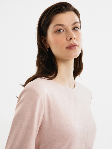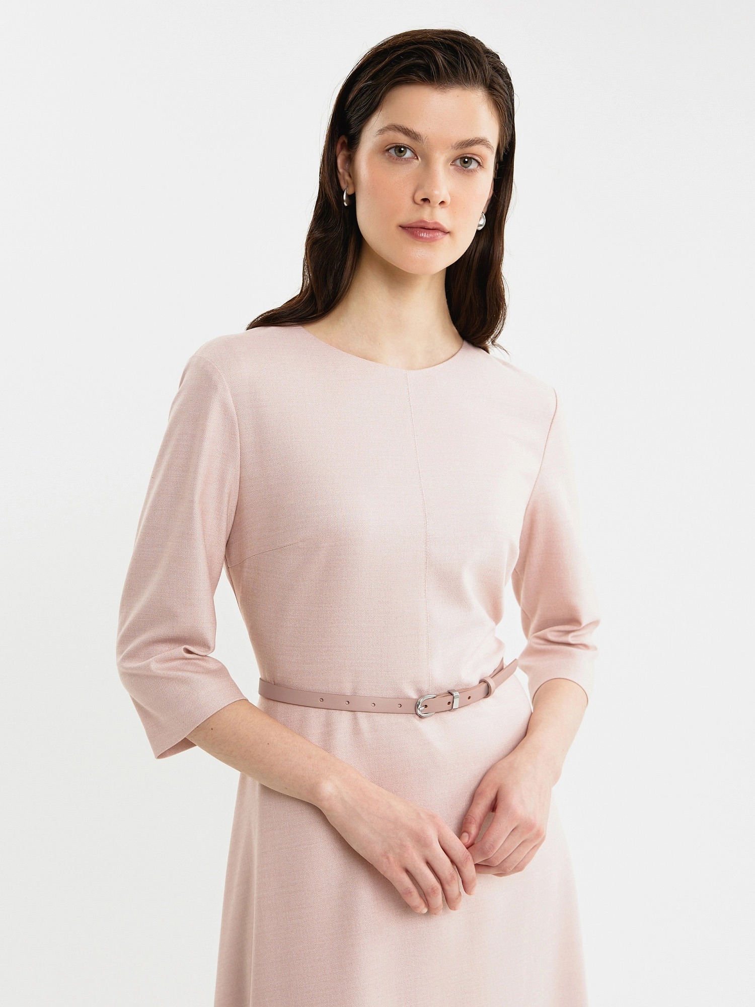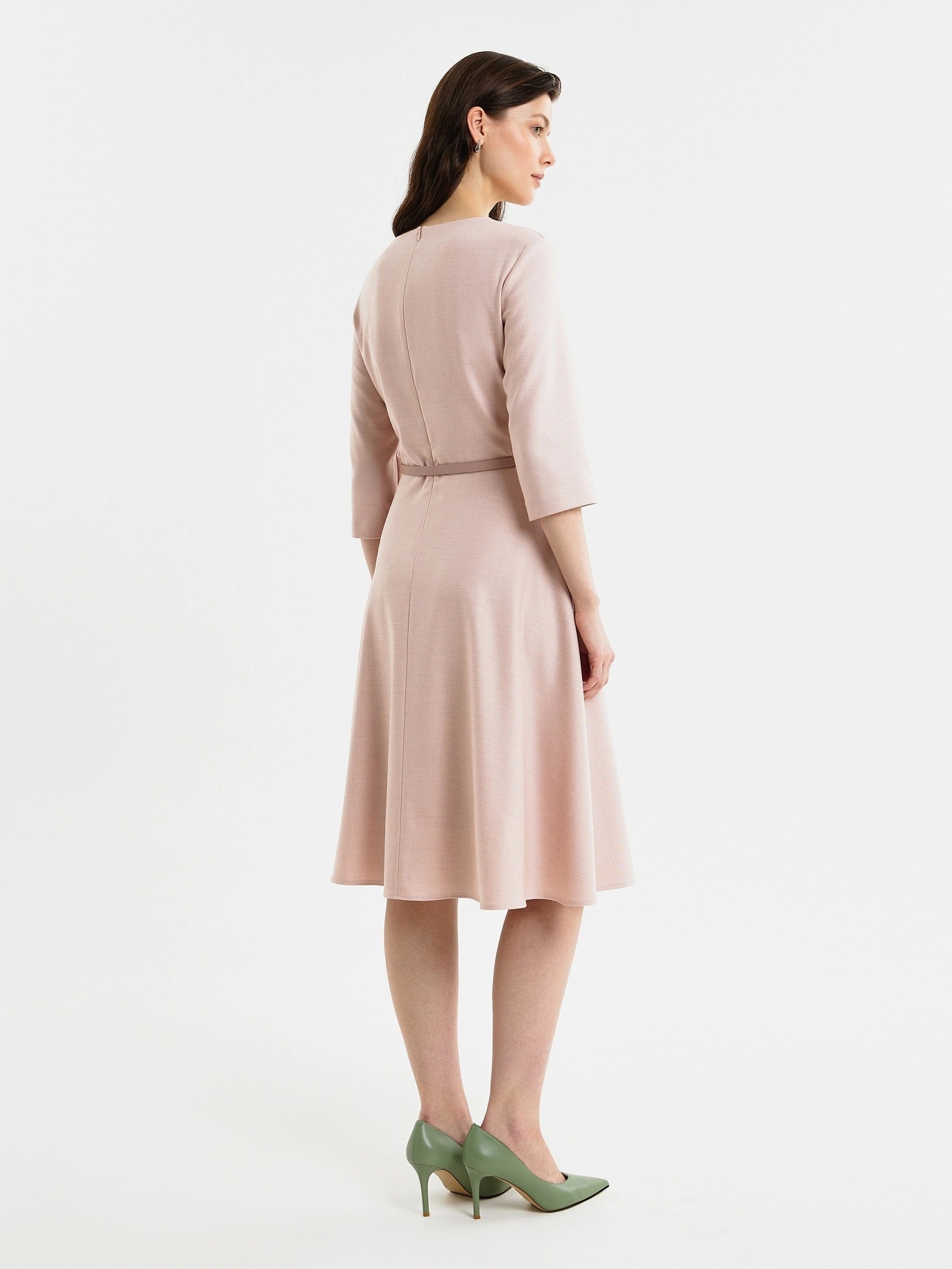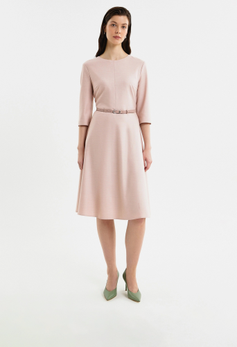 Полуприлегающее платье с отрезной линией по талии и юбкой полусолнце, вырез горловины круглый, по центру шов. Рукав втачной. На спинке потайная молния. В комплект входит тонкий ремень из экокожи пыльно-розового цвета.