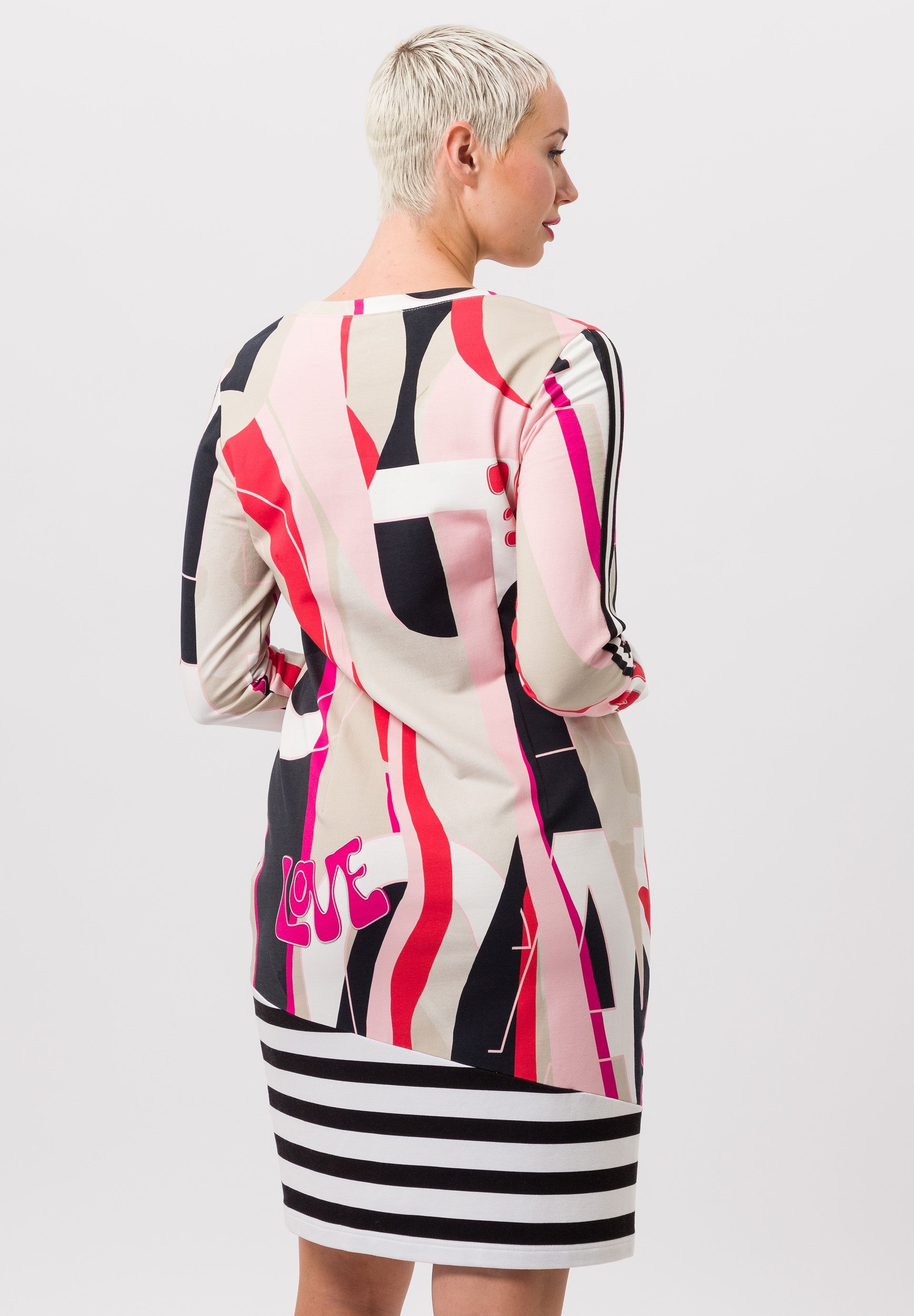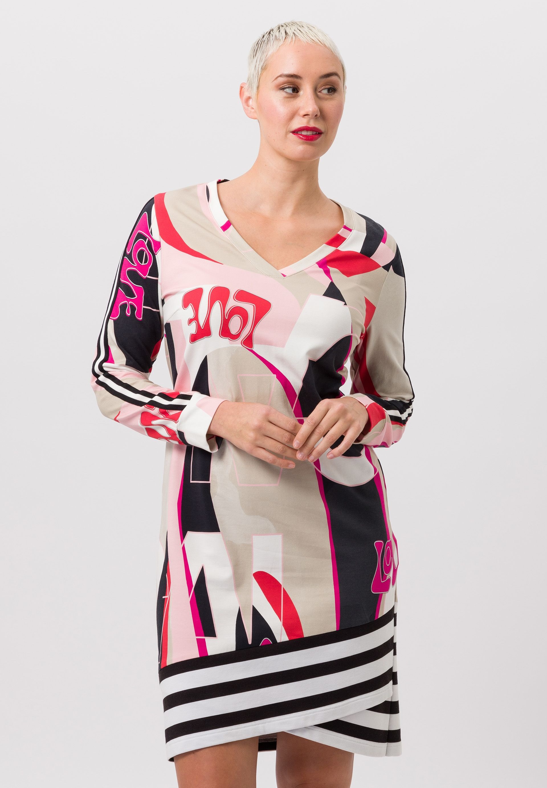Платье женское с принтом по всей поверхности и контрастными полосками. Контрастные полосы вдоль рукавов дополняют привлекательный принт и в то же время придают платью слегка спортивный вид. Эластичная хлопчатобумажная ткань также оказывает динамичный эффект, обеспечивая идеальную посадку и свободу движений. Помимо изысканного принта и полосок, подол платья имеет женственный вид с запахом.