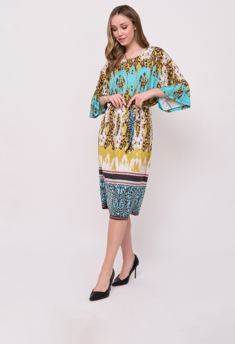 Детали: без застежки, вырез горловины округлый, рукава 3/4, покрой прямой, рисунок орнамент, без карманов, конструктивные элементы пояс, длина платья миди, нижний слой. Длина по спинке: 115 см.