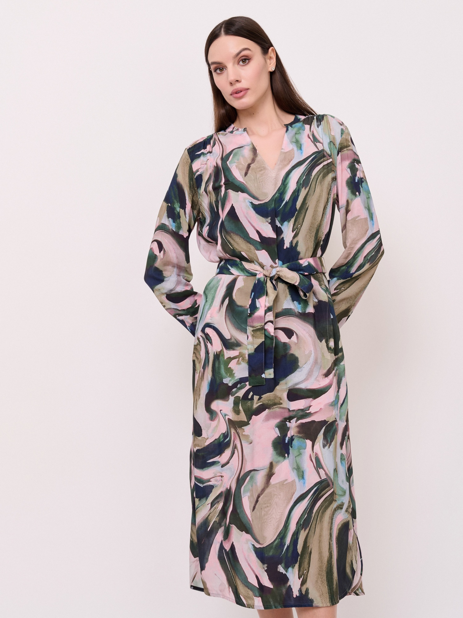 Детали: без застежки, вырез горловины замочная скважина, рукава длинные, покрой прямой, рисунок абстракция, карманы в шве, конструктивные элементы боковые разрезы, длина платья миди, пояс из основной ткани. Длина по спинке: 117 см.