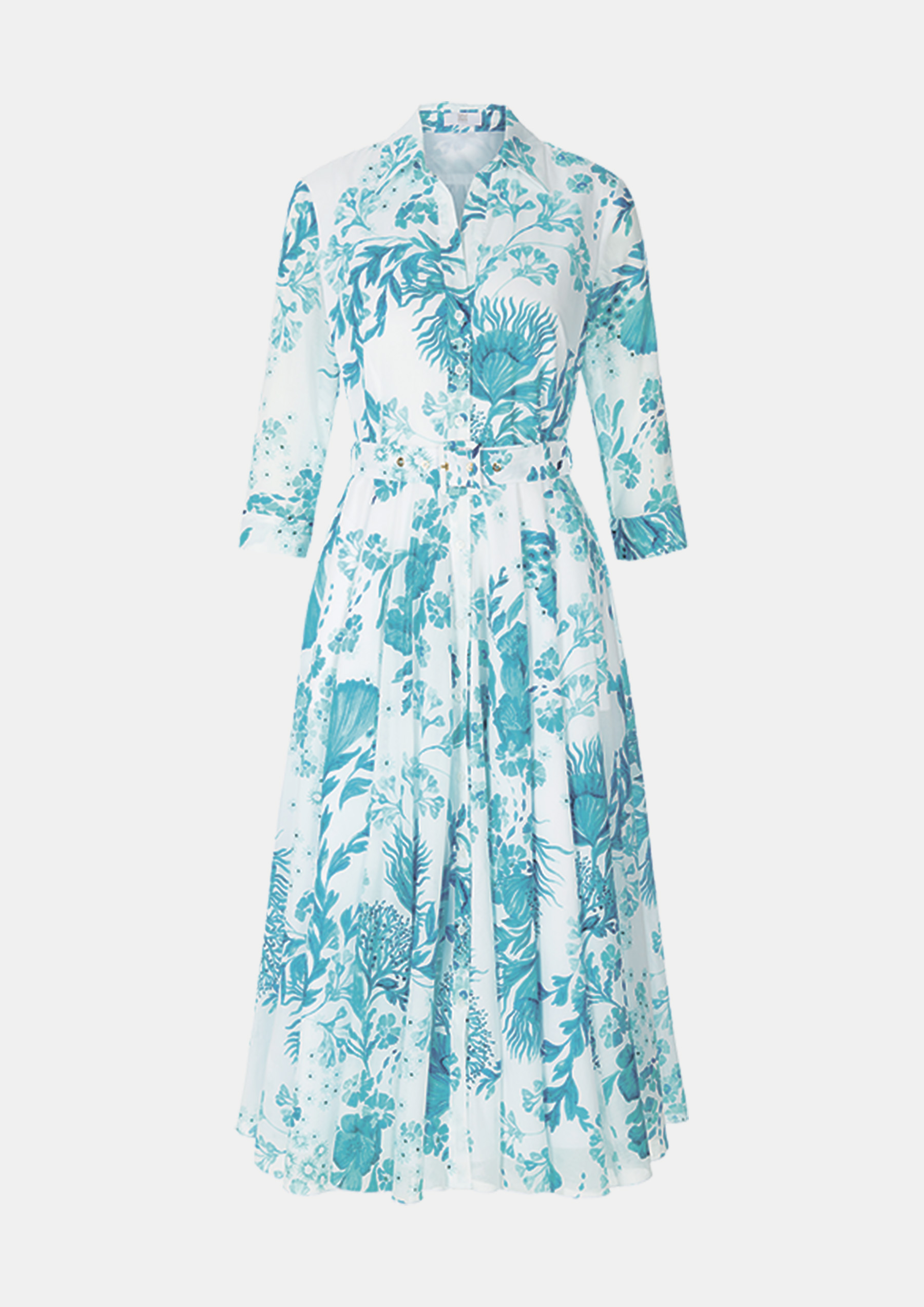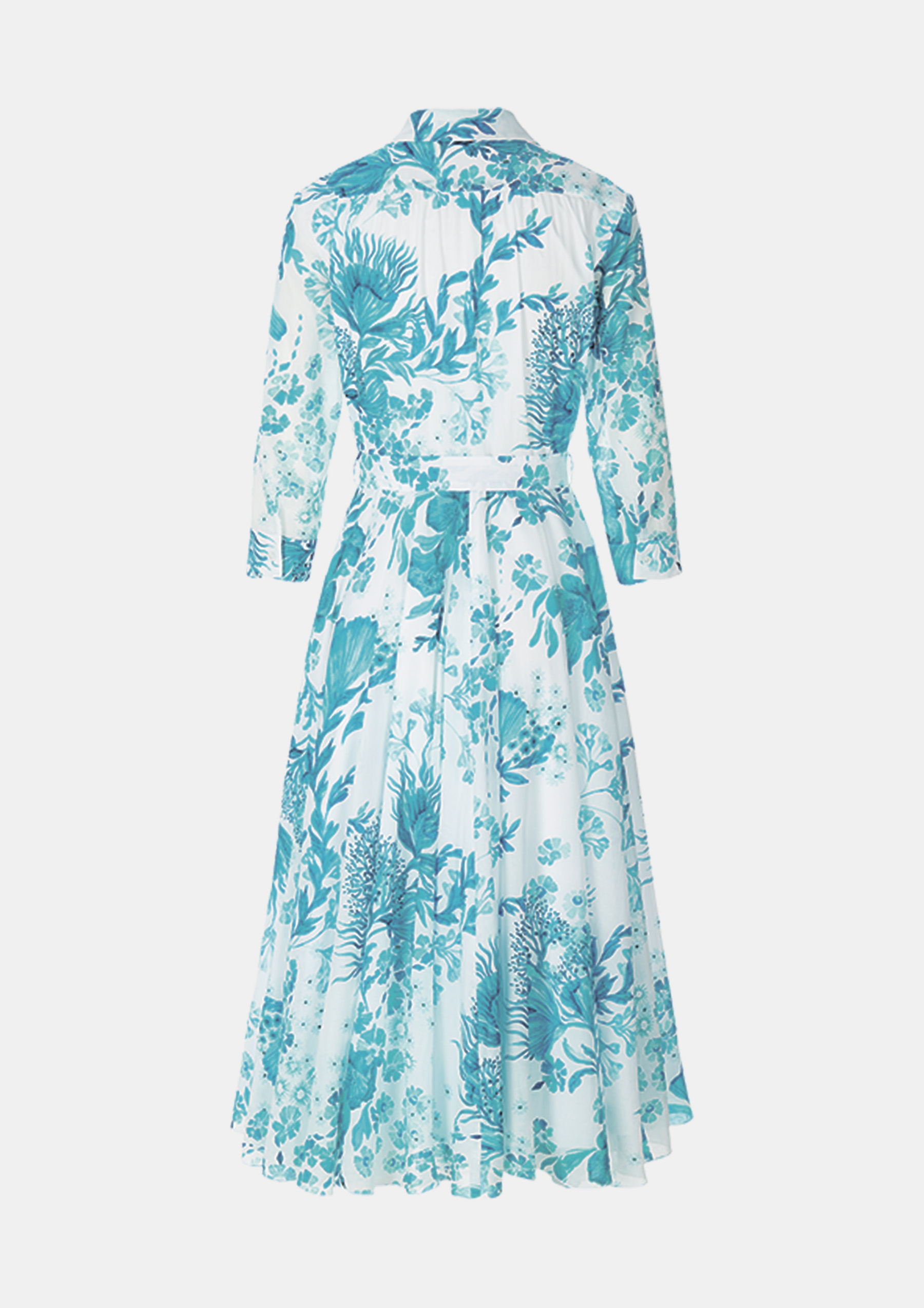 Платье из хлопкового батиста с эксклюзивным подводным принтом, блузкой-рубашкой, развевающейся юбкой и поясом выглядит современно.