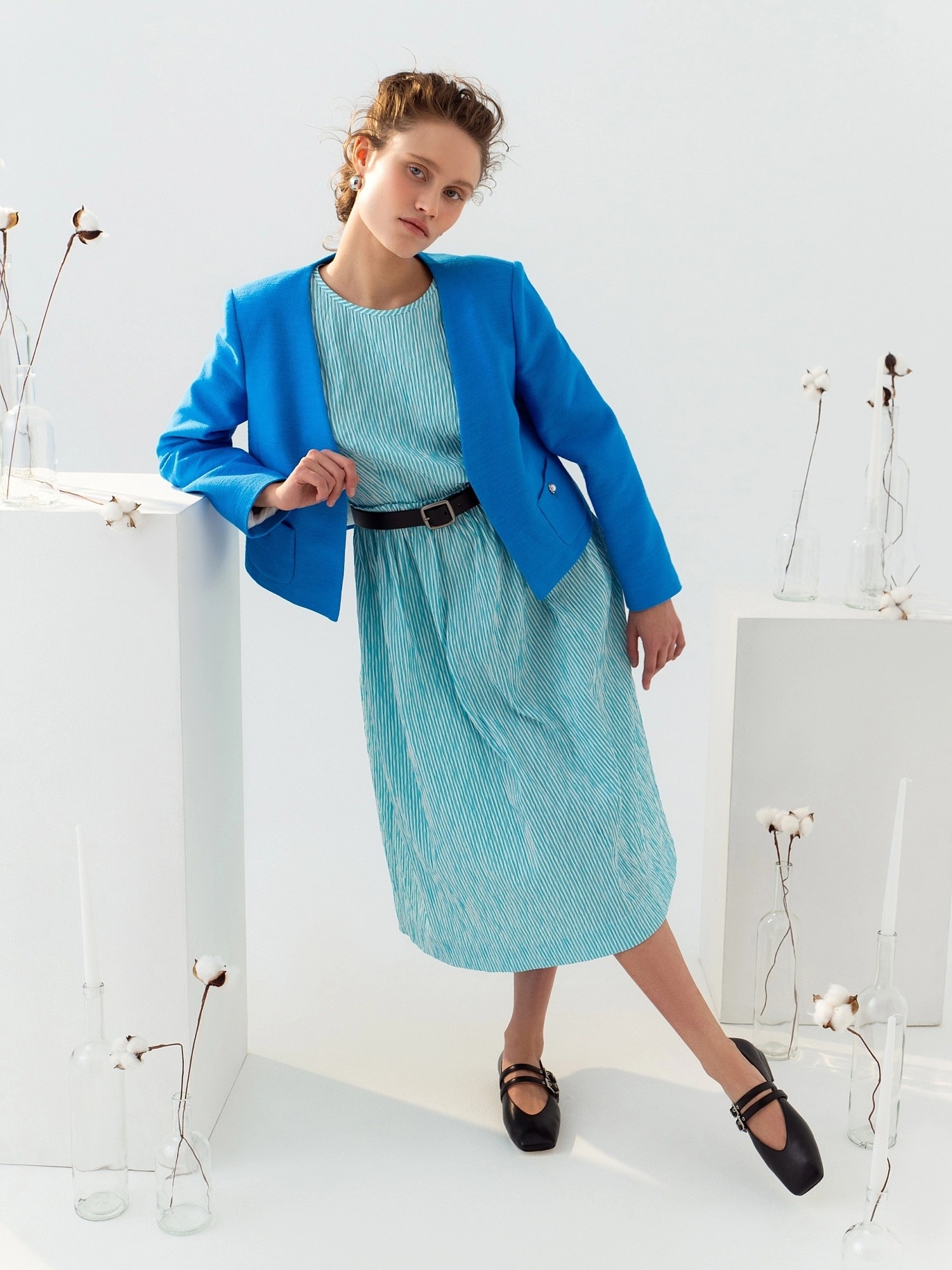 Романтичное приталенное платье без рукавов, из фактурной плательной ткани с бирюзовой полоской. С расширенной юбкой на резинке и рюшем на талии.