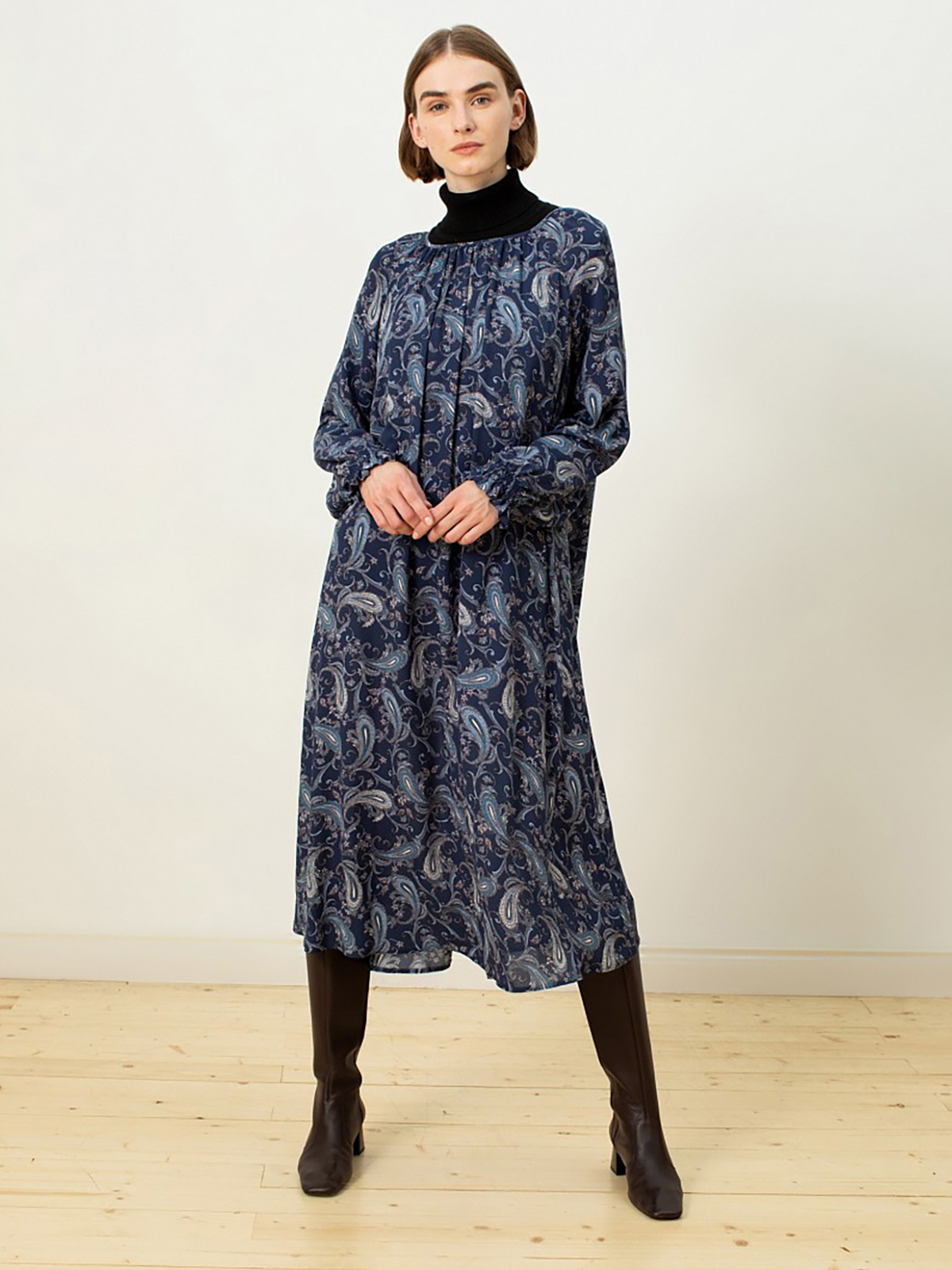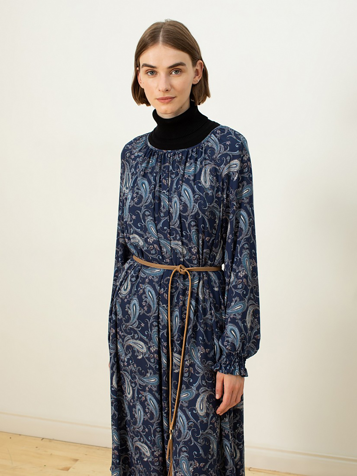 Романтичное платье миди с орнаментом пейсли по всей поверхности. Широкий овальный вырез горловины со сборкой. Длинные рукава реглан. В комплекте идет притачной пояс из экокожи.