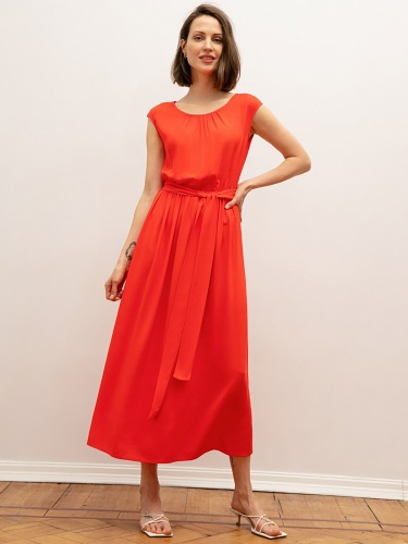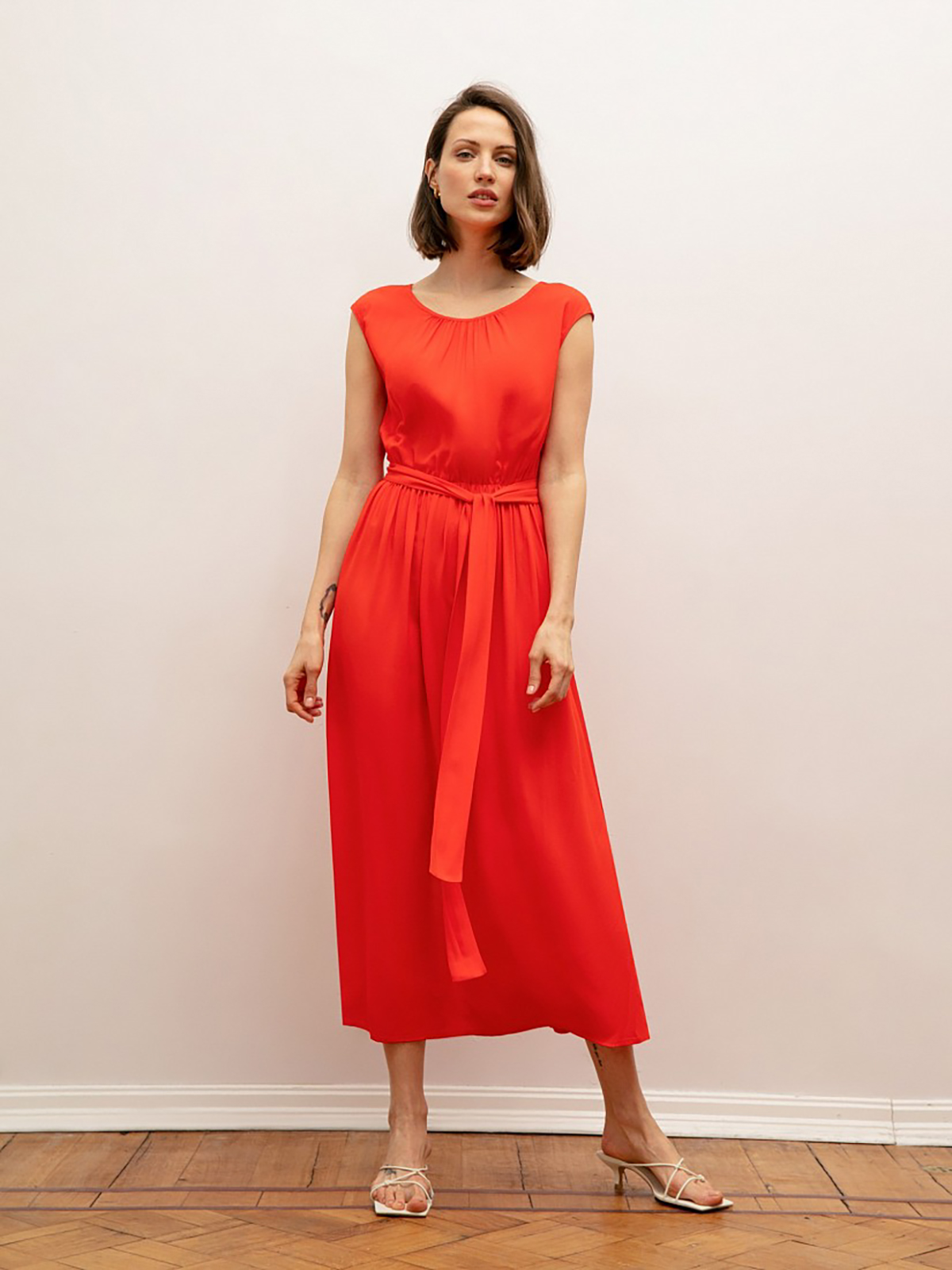 Платье без рукавов длины миди выполнено в сочной расцветке. Круглый вырез горловины украшен складками. Платье прямого силуэта с тканевым поясом в комплекте. Платье хорошо сочетается как с каблуком, так и с кроссовками.