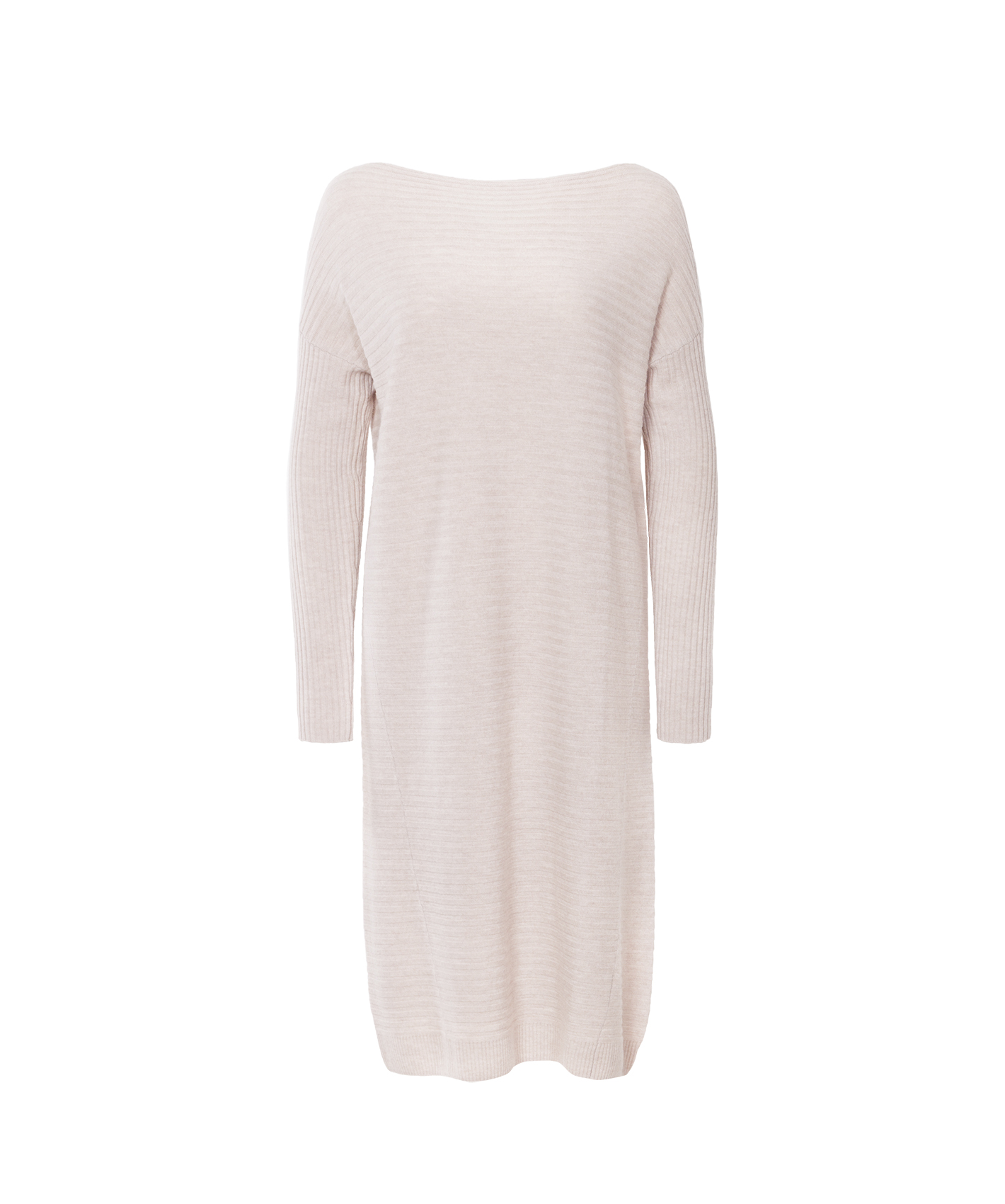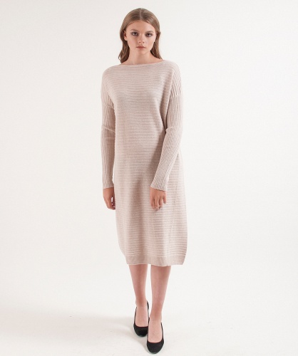 Однотонное трикотажное платье в рубчик. Актуальная длина миди.Свободный силуэт подходит для любого типа фигуры. Вырез горловины лодочка выгодно подчеркивает линию шеи. Спущенная линия плеч делает образ расслабленным. Платье хорошо сочетается с высокими сапогами.