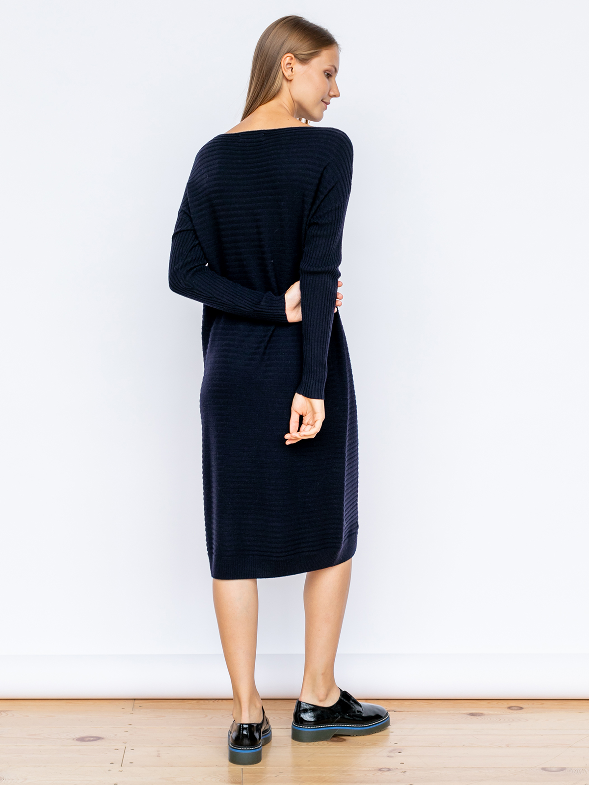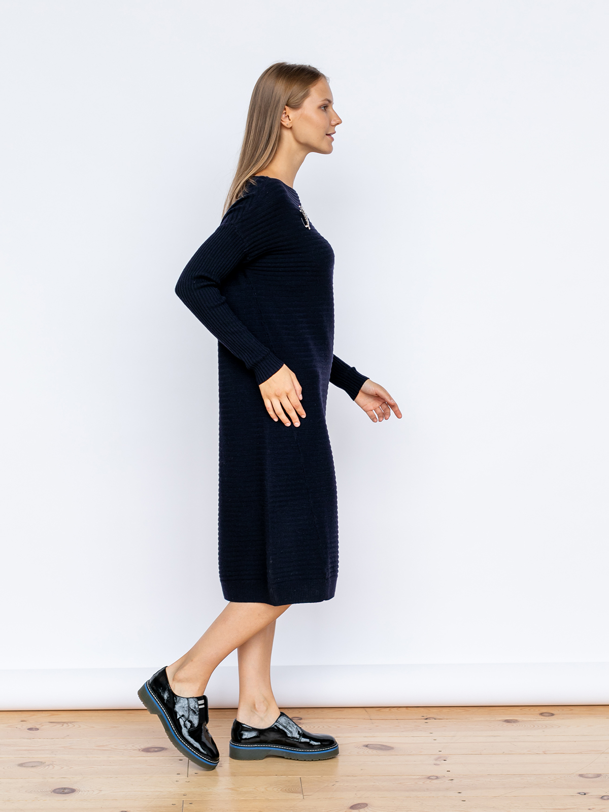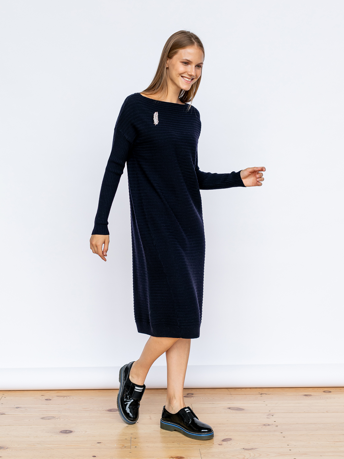 Теплое шерстяное платье свободного покроя. Длинный рукав со спущенным плечом. Воротник-хомут. Сочетание различных типов машинной вязки по переду изделия вносит разнообразие в минималистичный дизайн.