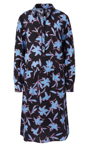 Платье-рубашка с трендовым цветочным принтом. Прямой покрой, сборка на талии, воротник-стойка, застежка на пуговицы спереди, втачные рукава полной длины с манжетами. Закругленный низ изделия. Приятный к телу шелковый материал.