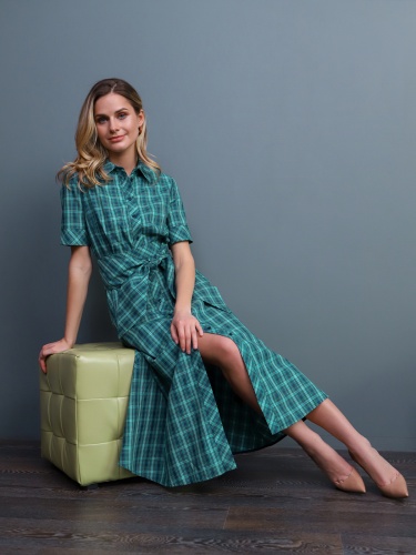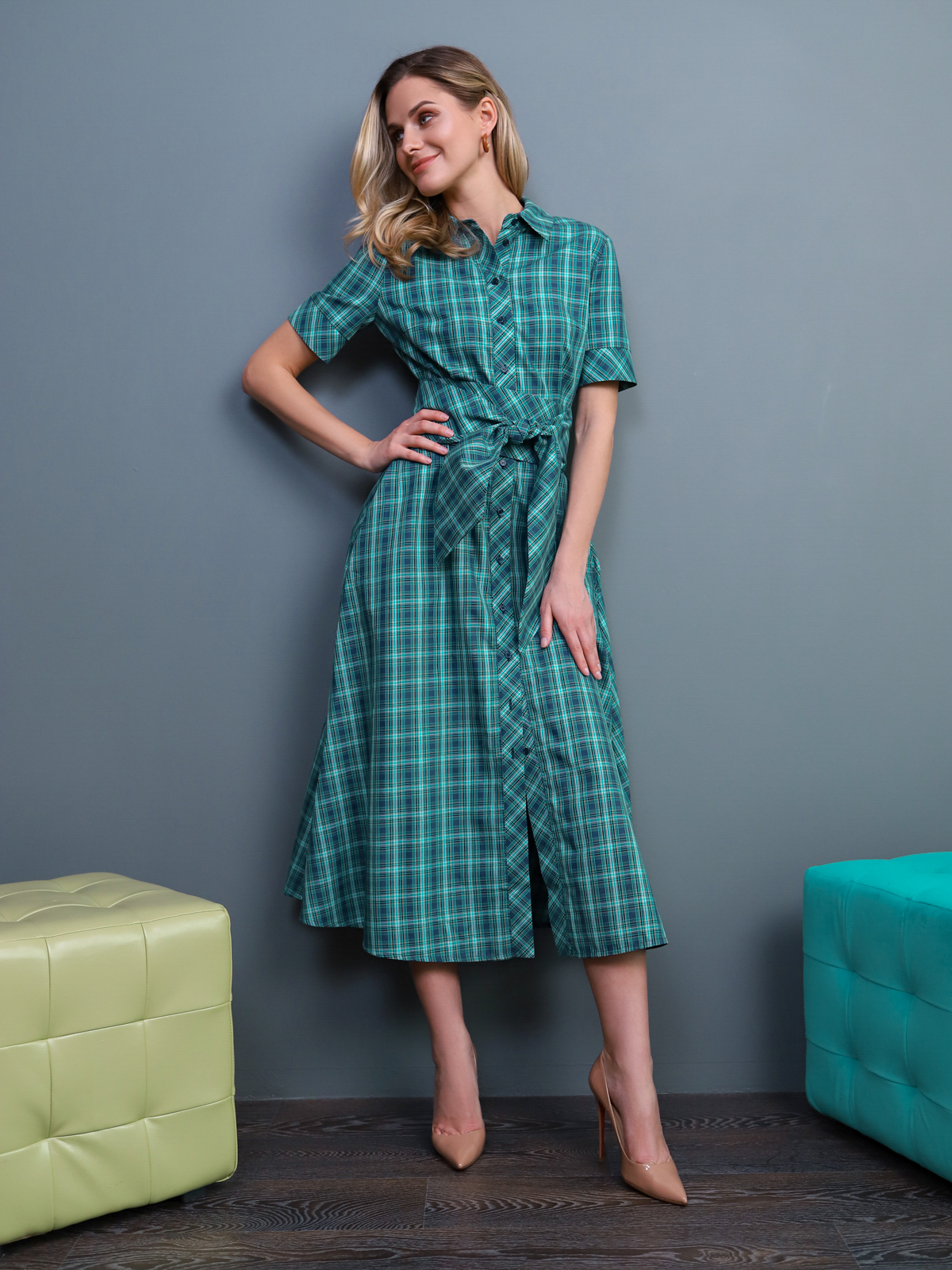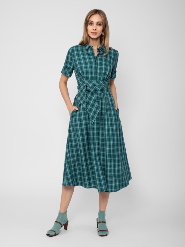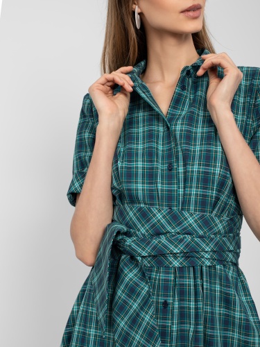 Платье из костюмной ткани в клетку приталенного силуэта с широкой юбкой А-силуэта, классическим отложным воротником, коротким рукавом кимоно и застежкой спереди на пуговицы. На талии широкий завязывающийся съемный пояс из основной ткани.