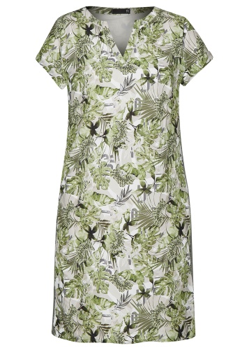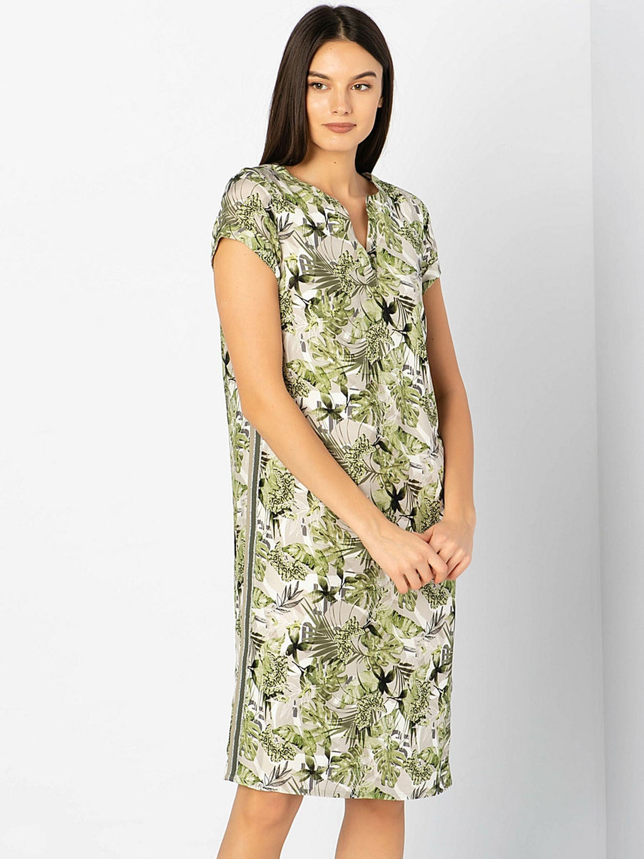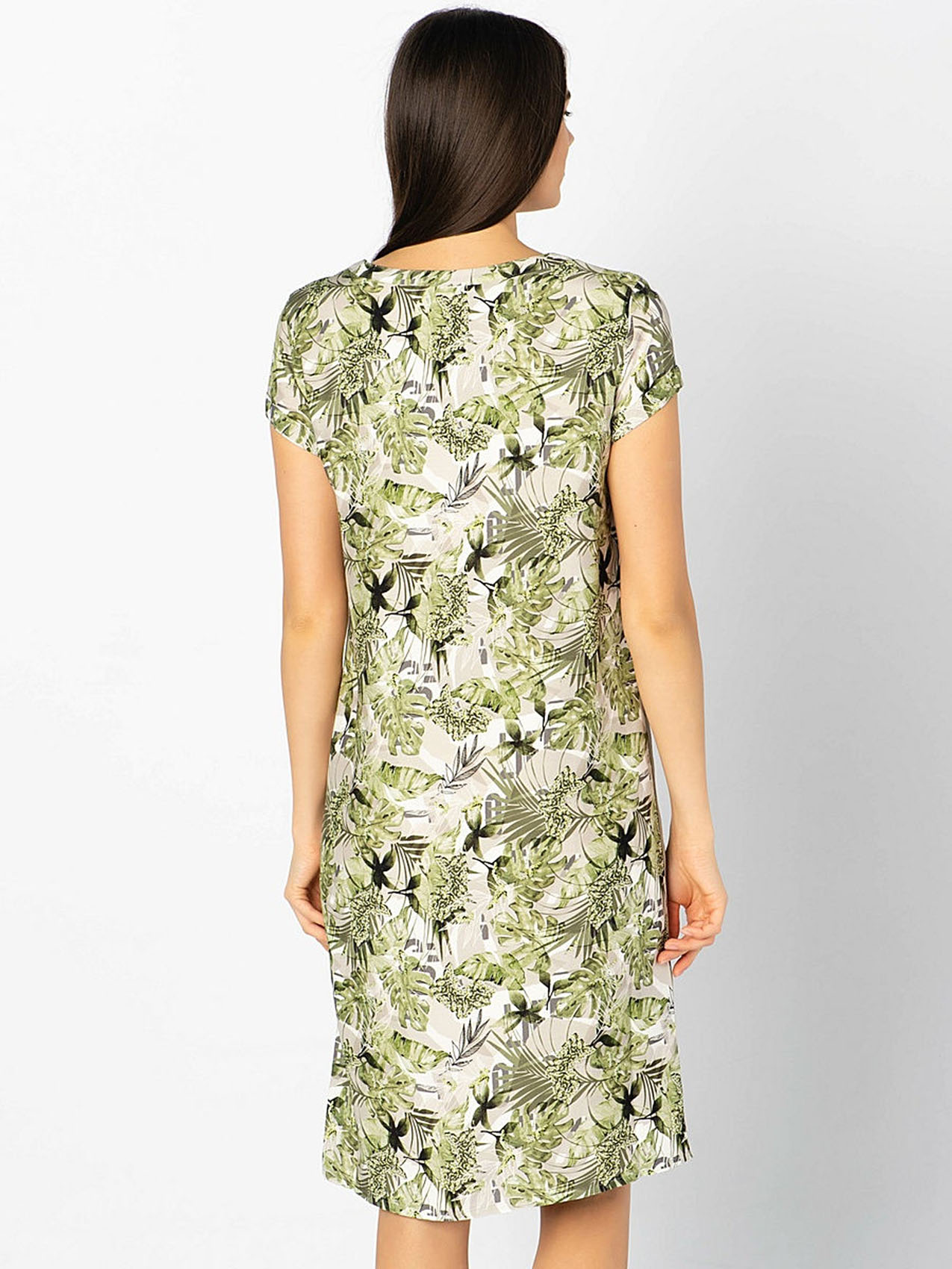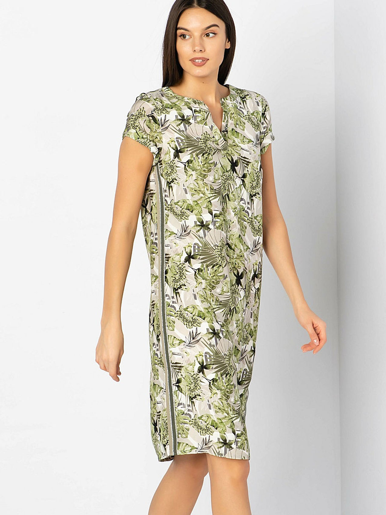 • слегка приталенный силуэт • короткие рукава • трендовый принт с тропическими мотивами • декоративная лента по боковым швам • приятный к телу вискозный материал • длина изделия по спинке: 80 см.