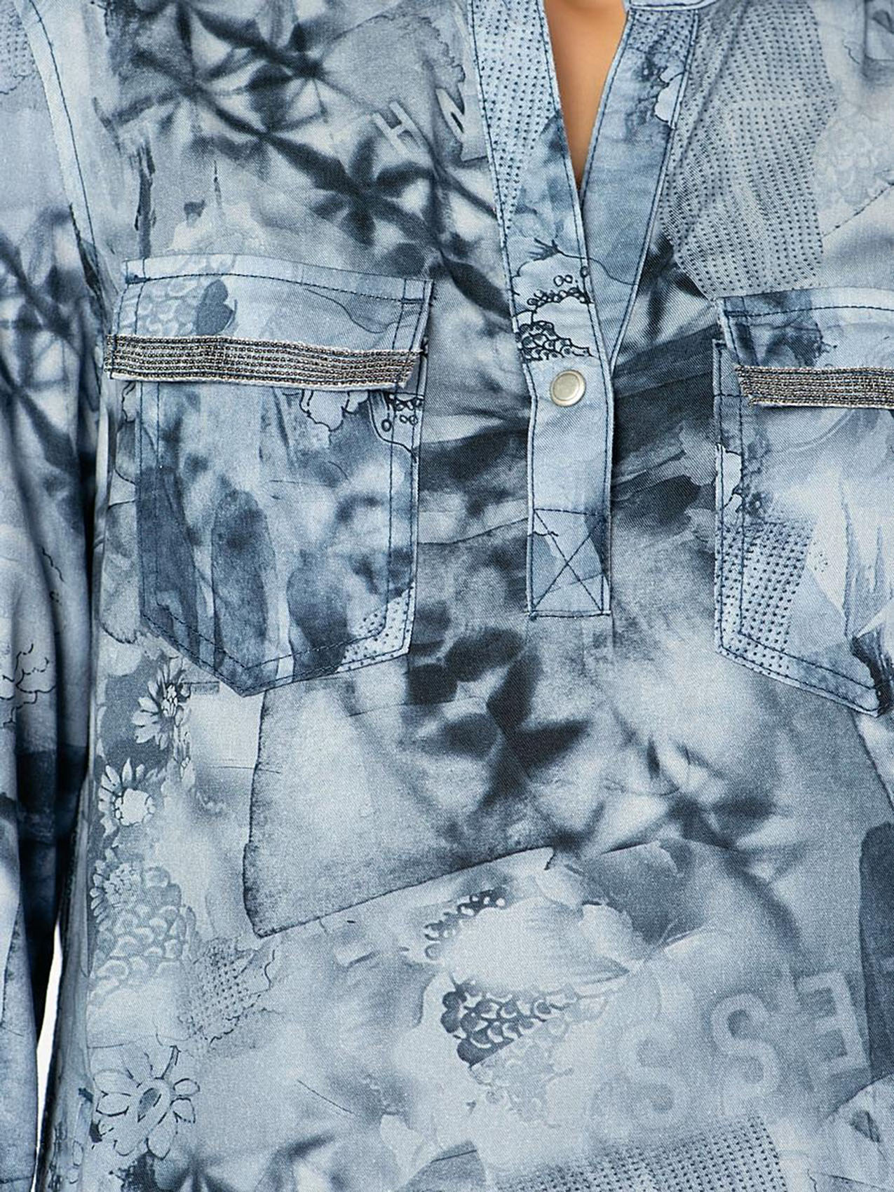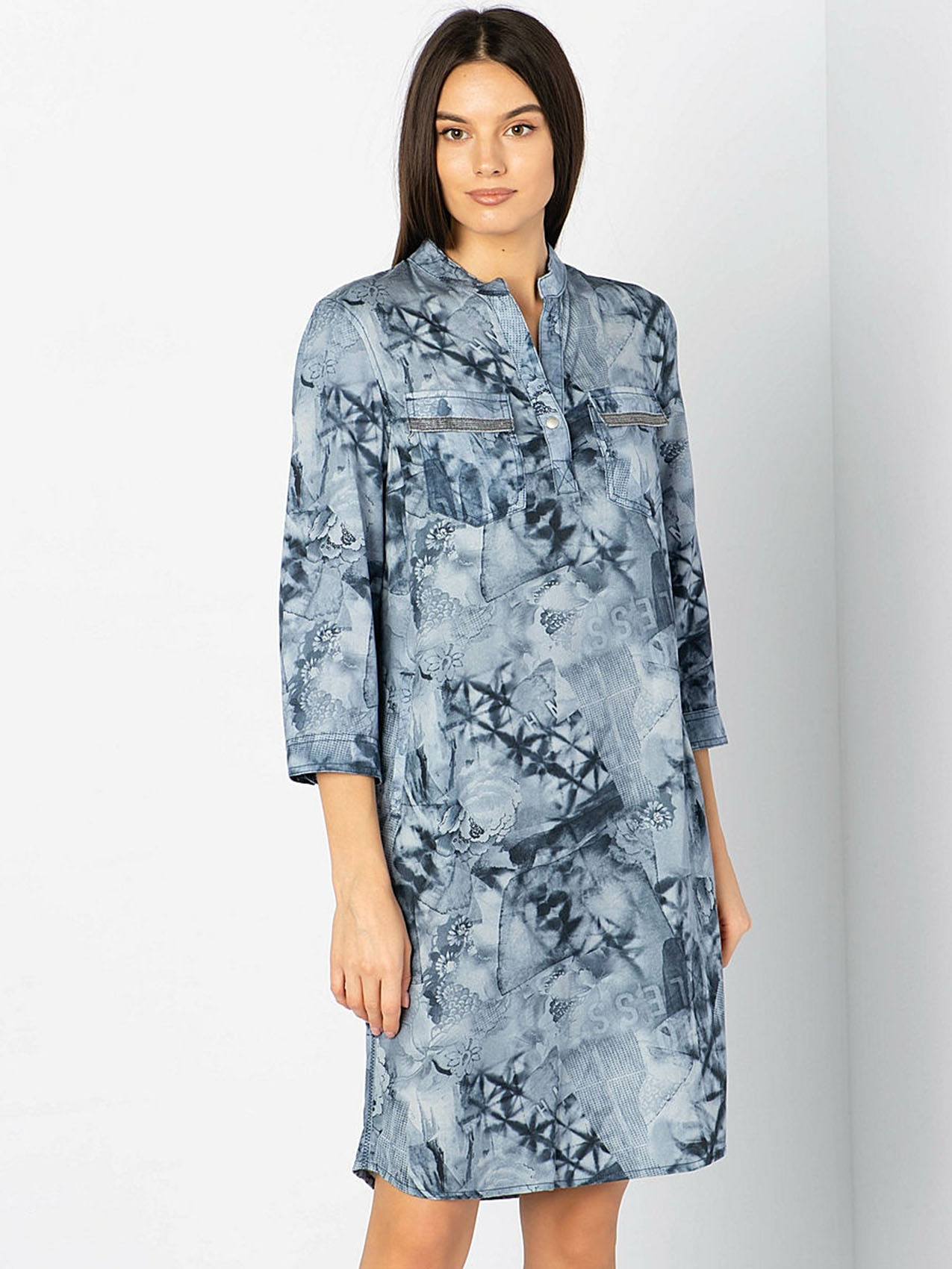 Платье из тенсела. Длина миди. V-образный вырез горловины, рукава 3/4, накладные карманы. Принт с изображением цветов и легким эффектом батика. Длина изделия по спинке: 70 см.