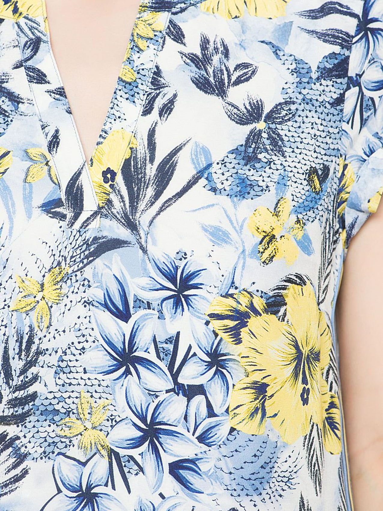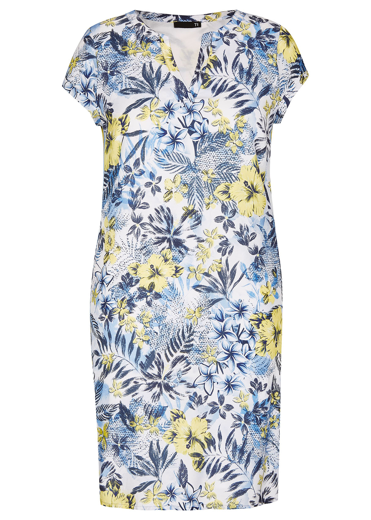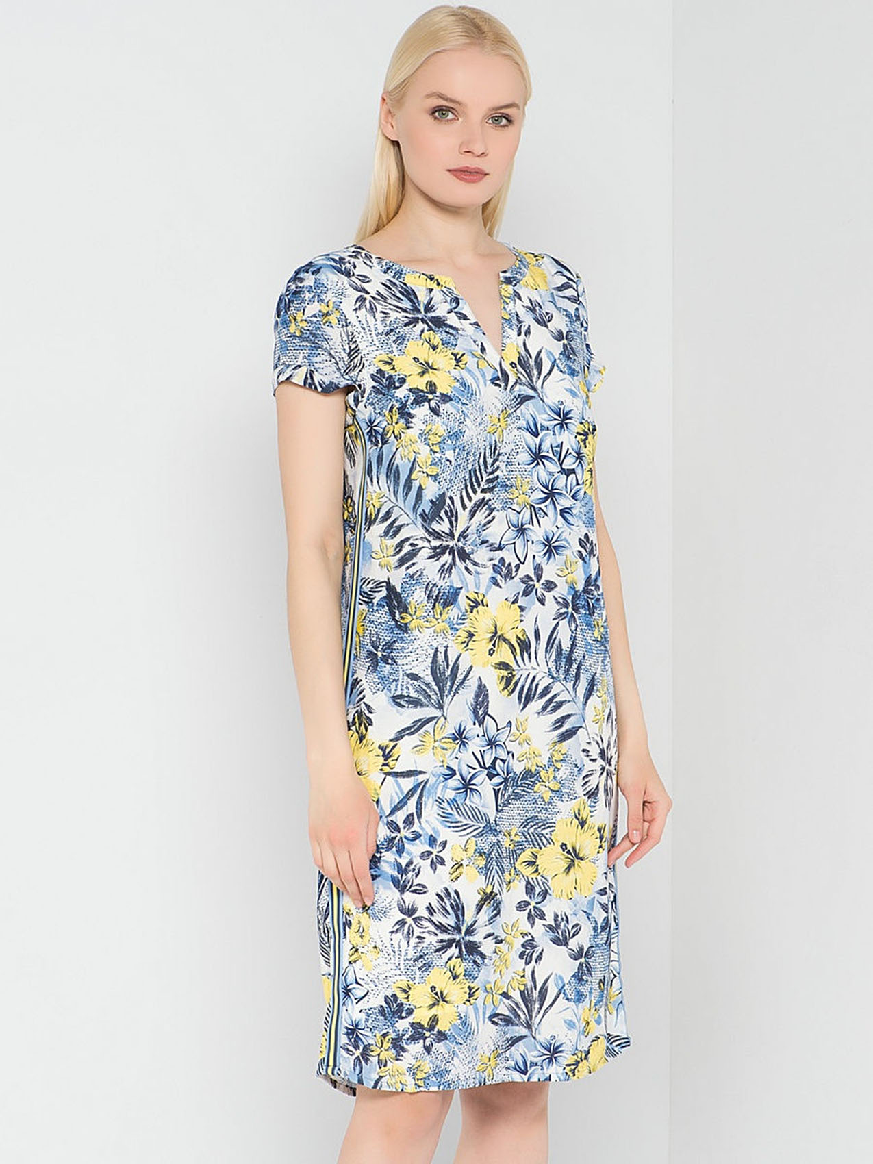 Платье с изображением тропических цветов - хит весенне-летнего сезона. Вискозный материал очень приятен к телу и обеспечивает максимальный комфорт. Слегка приталенный покрой подчеркивает женственность. Платье можно носить как с туфлями, так и с кроссовками, а в сочетании с джинсовой курткой у вас получится современный стильный образ.
