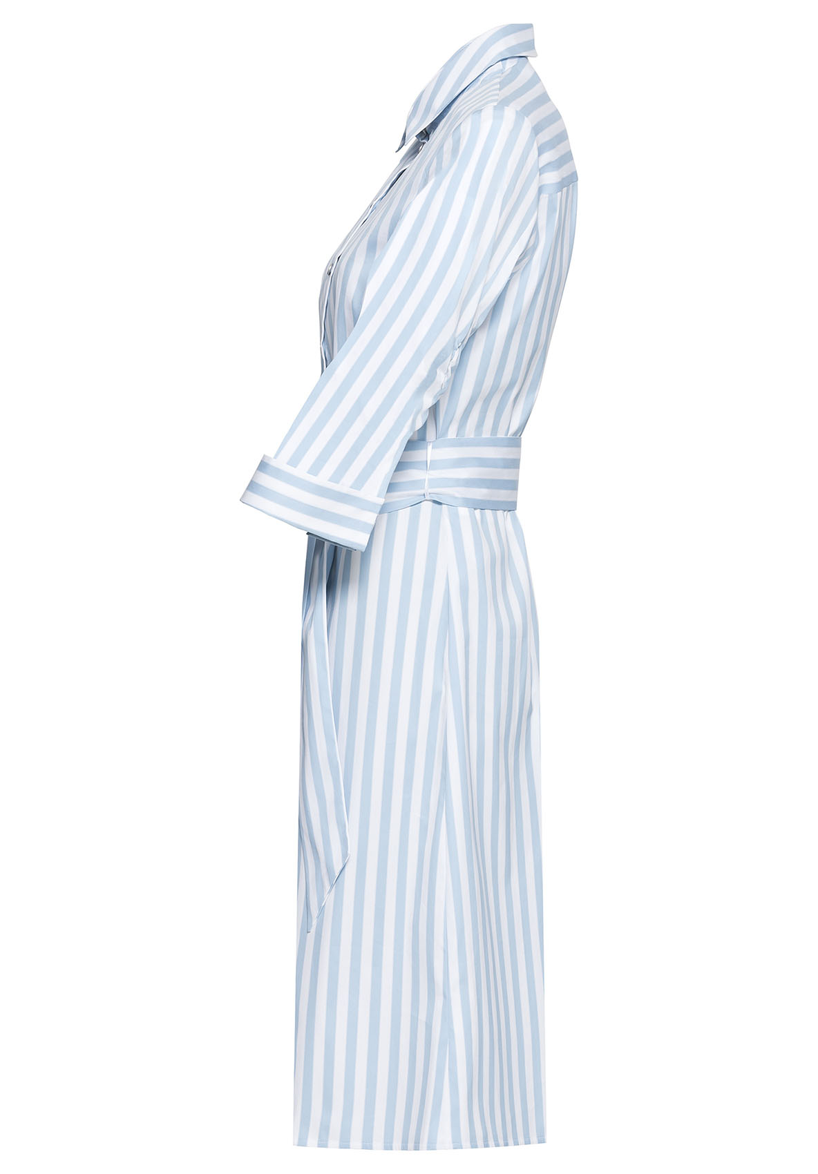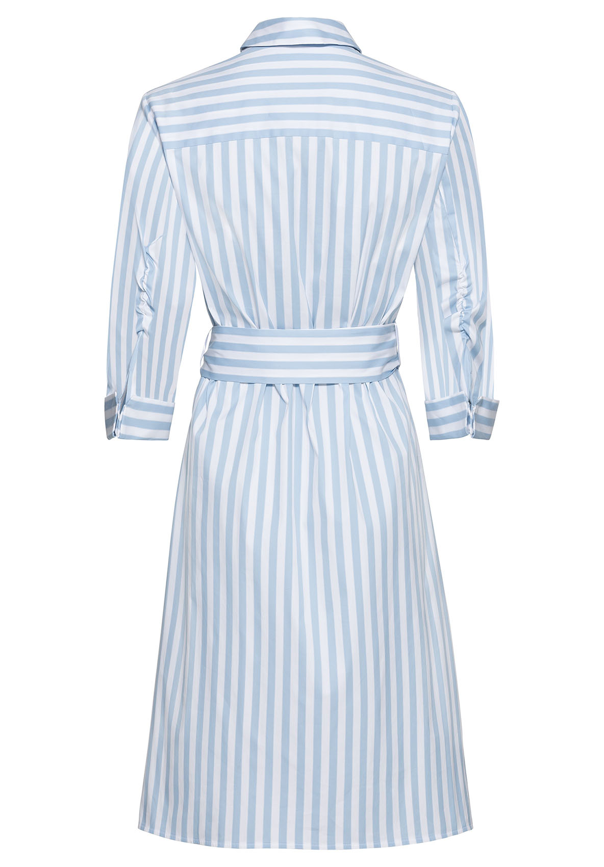 Современное и всегда актуальное. Повседневное платье-рубашка Dilana из приятной хлопково-эластановой ткани в полоску - абсолютный модный универсал. Современный дизайн с рубашечным воротником, непрерывной пуговичной планкой и рукавом 3/4. Галстук-пояс на талии подчеркивает достоинства фигуры. Платье в полоску - универсальный предмет гардероба, его можно носить даже с кроссовками. Платье выглядит благородно как с кожаной, так и с джинсовой курткой. • платье-рубашка • планка с пуговицами • пояс • смесь хлопка с эластаном • рубашечный воротник, рукава 3/4, прямой крой • длина юбки около 68 см; рост модели около 180 см • при росте 168 см платье будет закрывать колени
