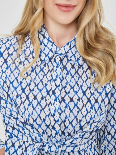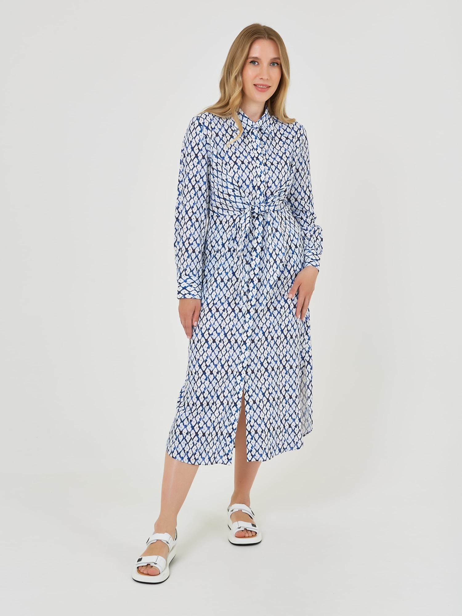 Платье с длинными рукавами и воротником выполнено из легкой ткани с геометрическим узором в синем и белом цветах, что придает ему свежий и стильный вид. Акцент на талии с помощью завязки создает женственный силуэт, идеально подходящий для теплой погоды. Коллекция Весна-Лето 2025. Капсула "Санторини". Параметры модели: 89-70-92, рост 167, размер 44-46