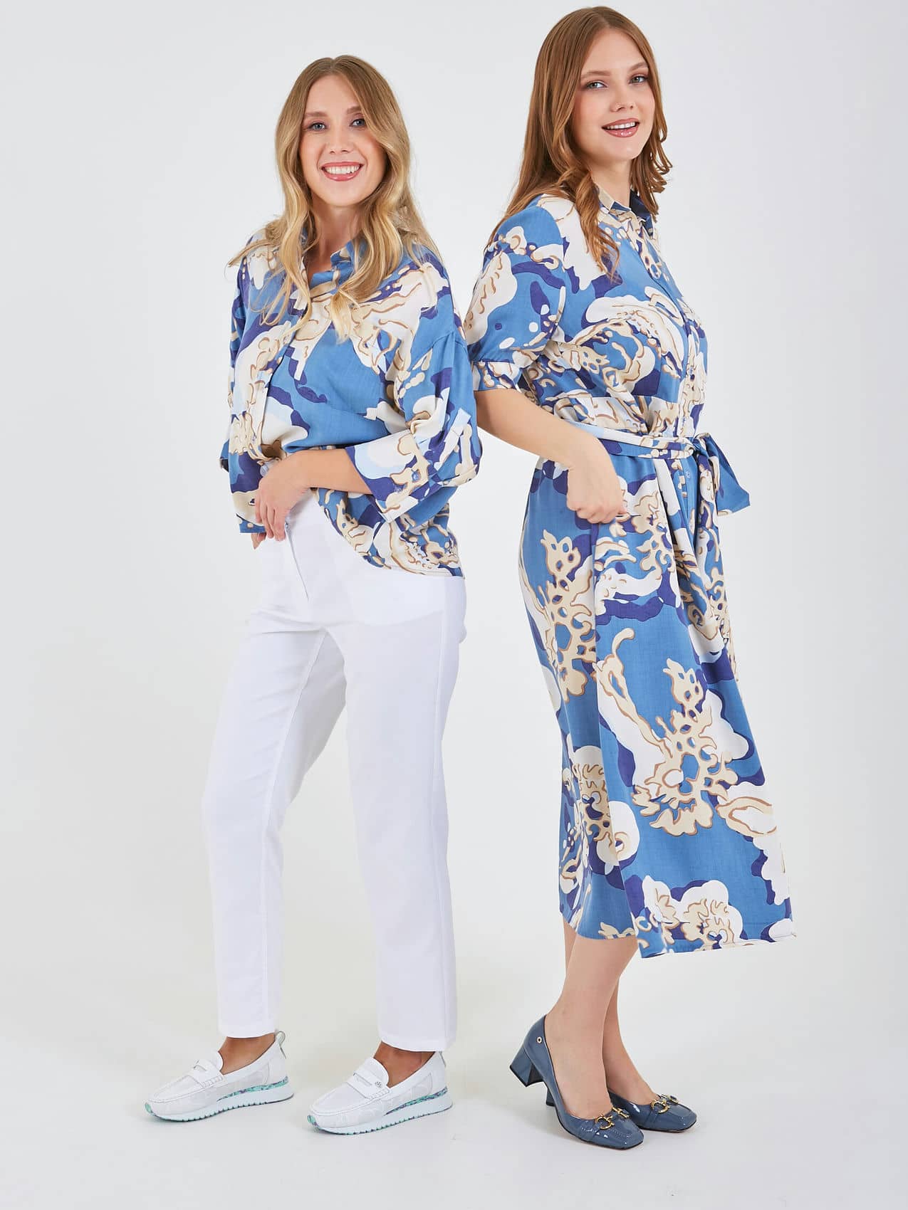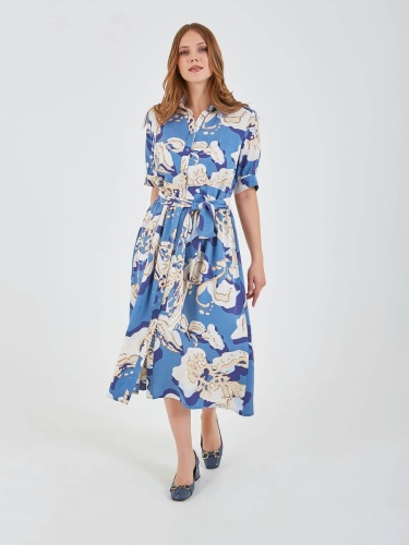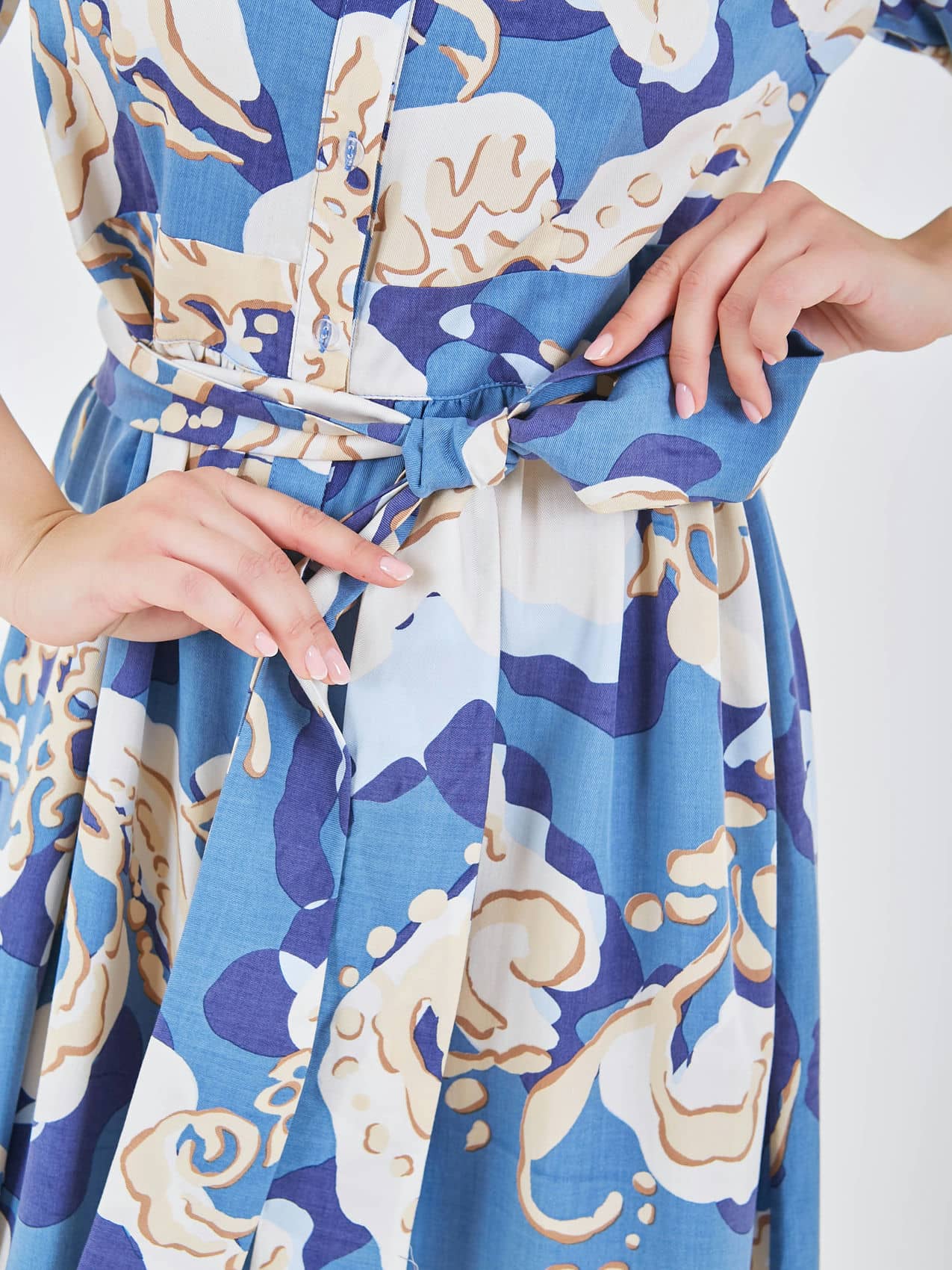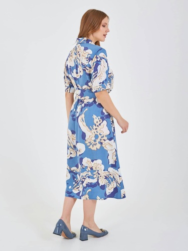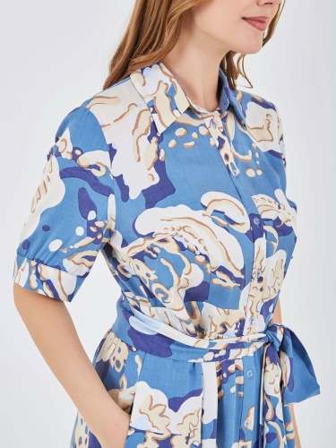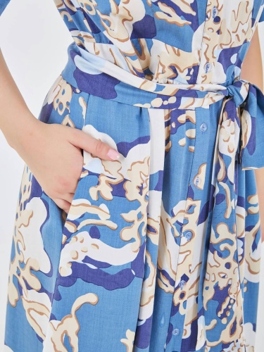 Платье выполнено в ярком синем оттенке с крупным цветочным принтом в бежевых и голубых тонах. Дизайн с пуговицами и поясом подчеркивает фигуру и подходит для повседневной носки или особых случаев. Коллекция Весна-Лето 2025. Капсула "Рио де Жанейро". Параметры модели: 95-64-101, рост 175, размер 44-46