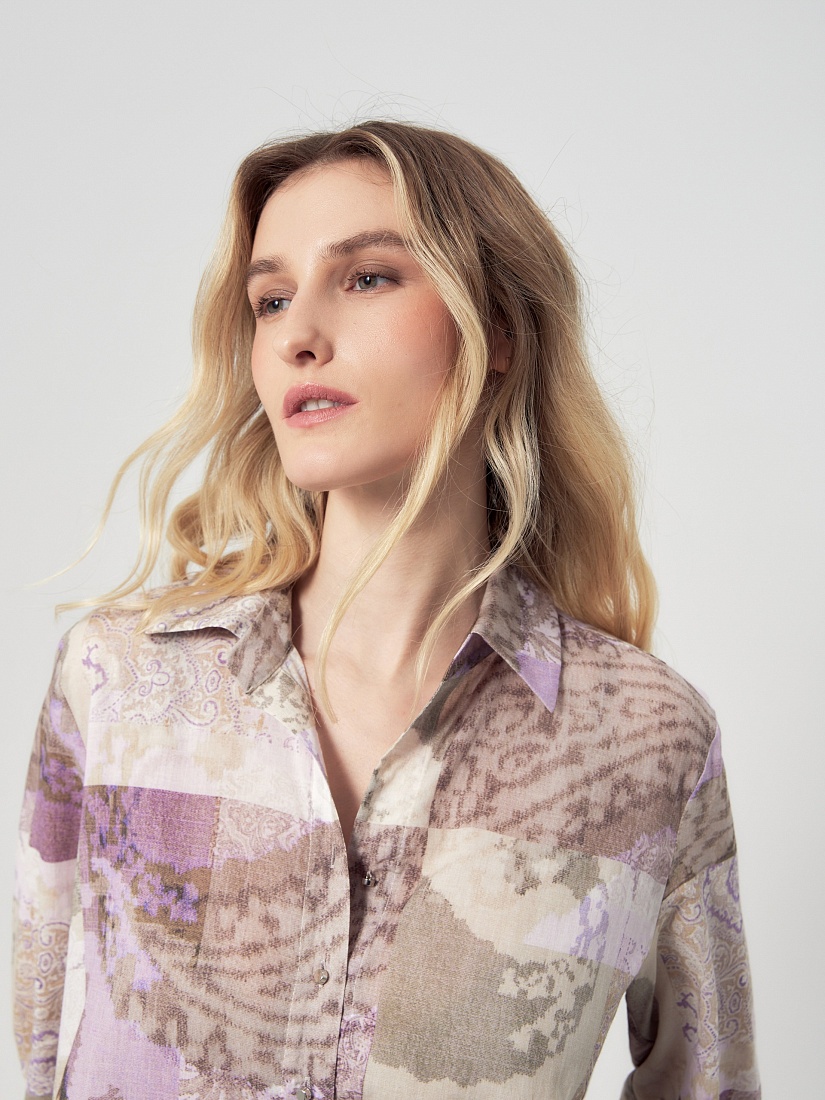 Прямое платье блузочного силуэта с отложным воротником и укороченной планкой на пуговицах. Платье выполнено из тонкой хлопковой ткани с этническим принтом в технике пэчворк. Классический втачной рукав длиной 3/4 на манжете с декоративной тесьмой мониль. Платье с разрезами по бокам.