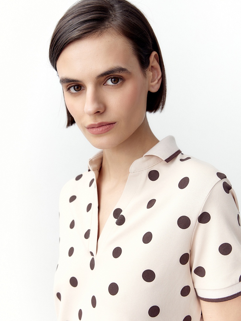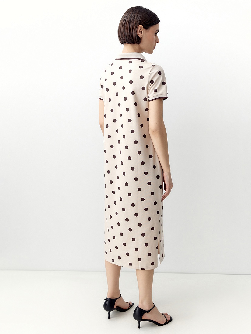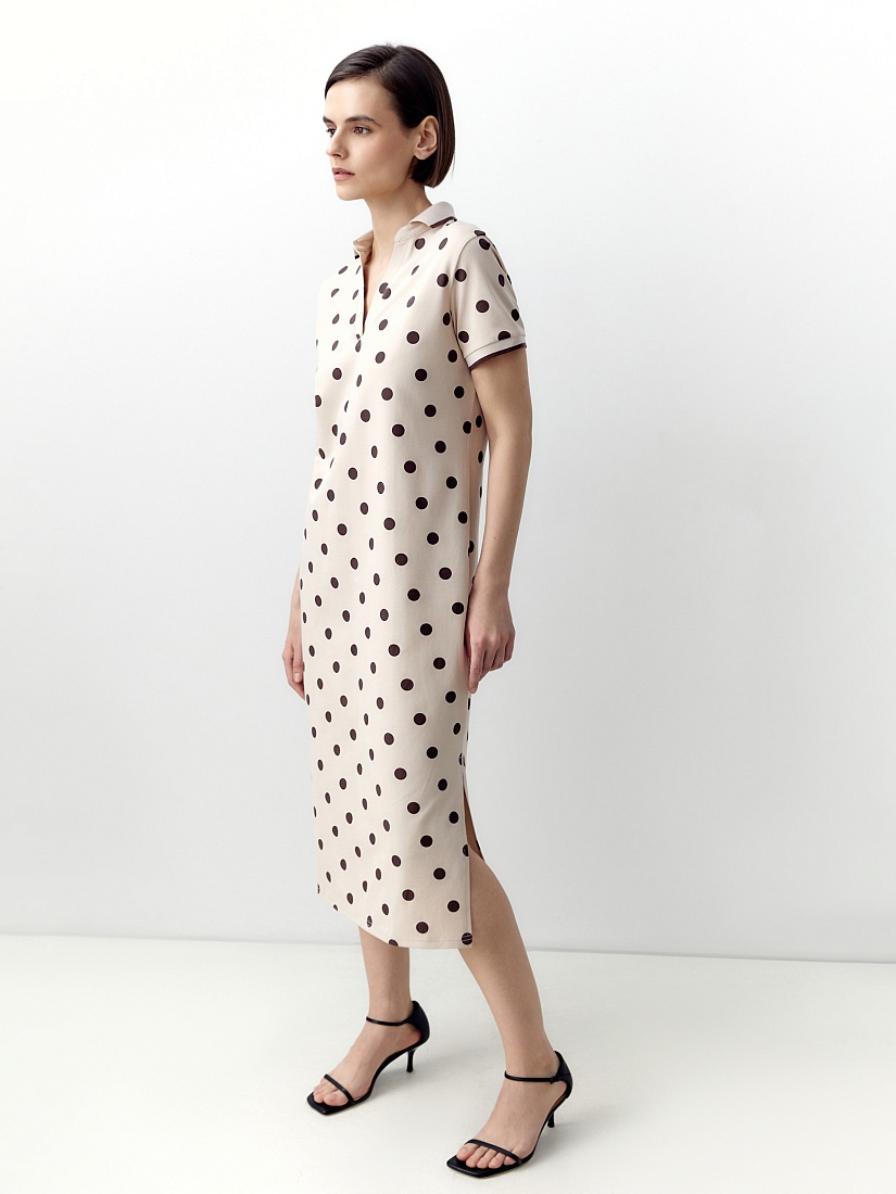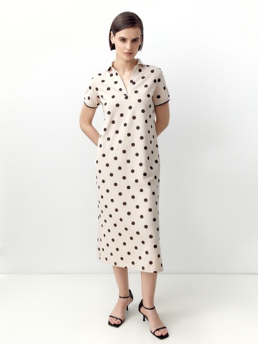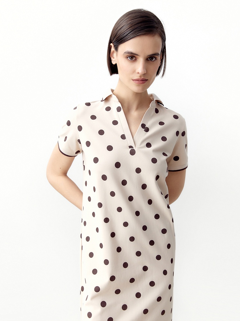 Свободное платье из хлопковой пряжи с воротником поло и коротким рукавом. Платье нежного бежевого цвета с коричневым горохом.