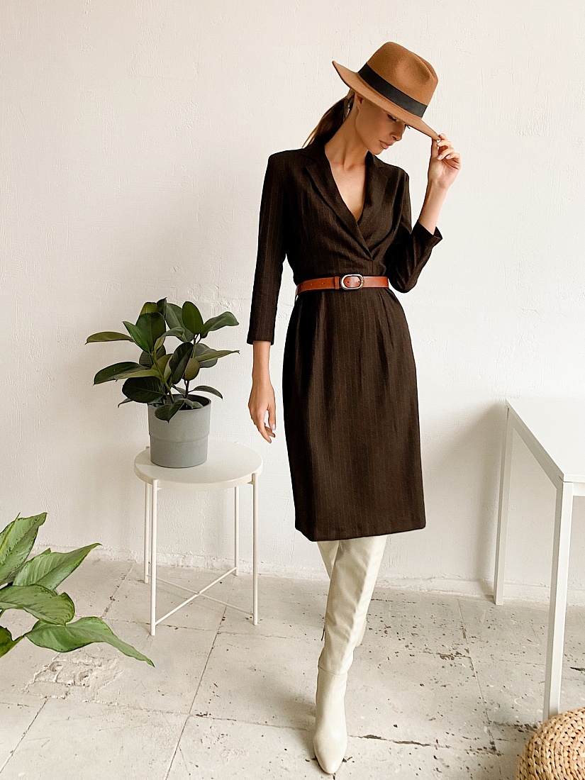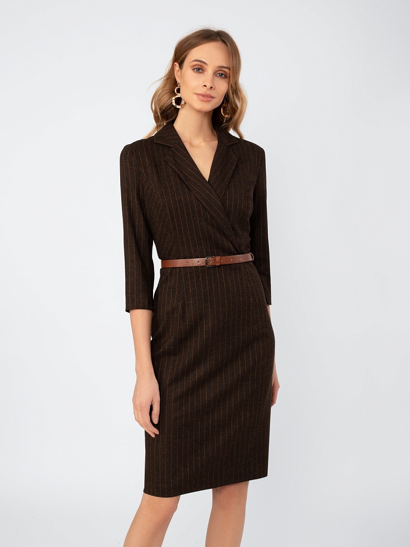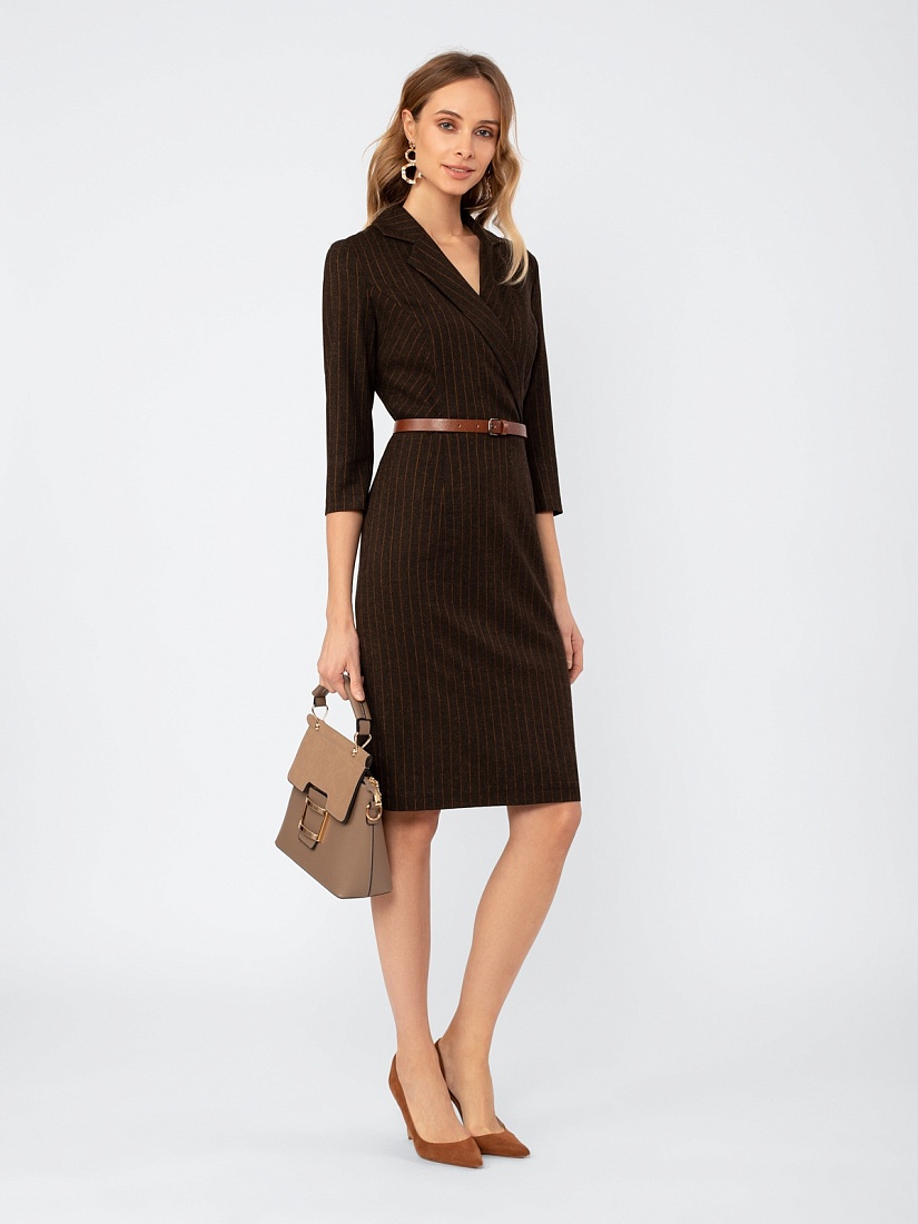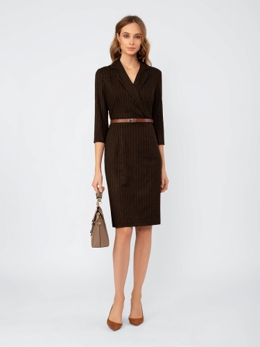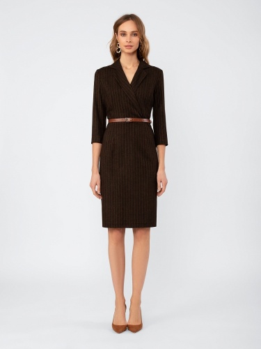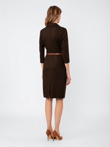 Платье в стиле кэжуал, полуприлегающего силуэта силуэта, длина до середины колена, на подкладке. Воротник английский. Рукав втачной, длина 7/8. Ремень из экокожи с пряжкой.