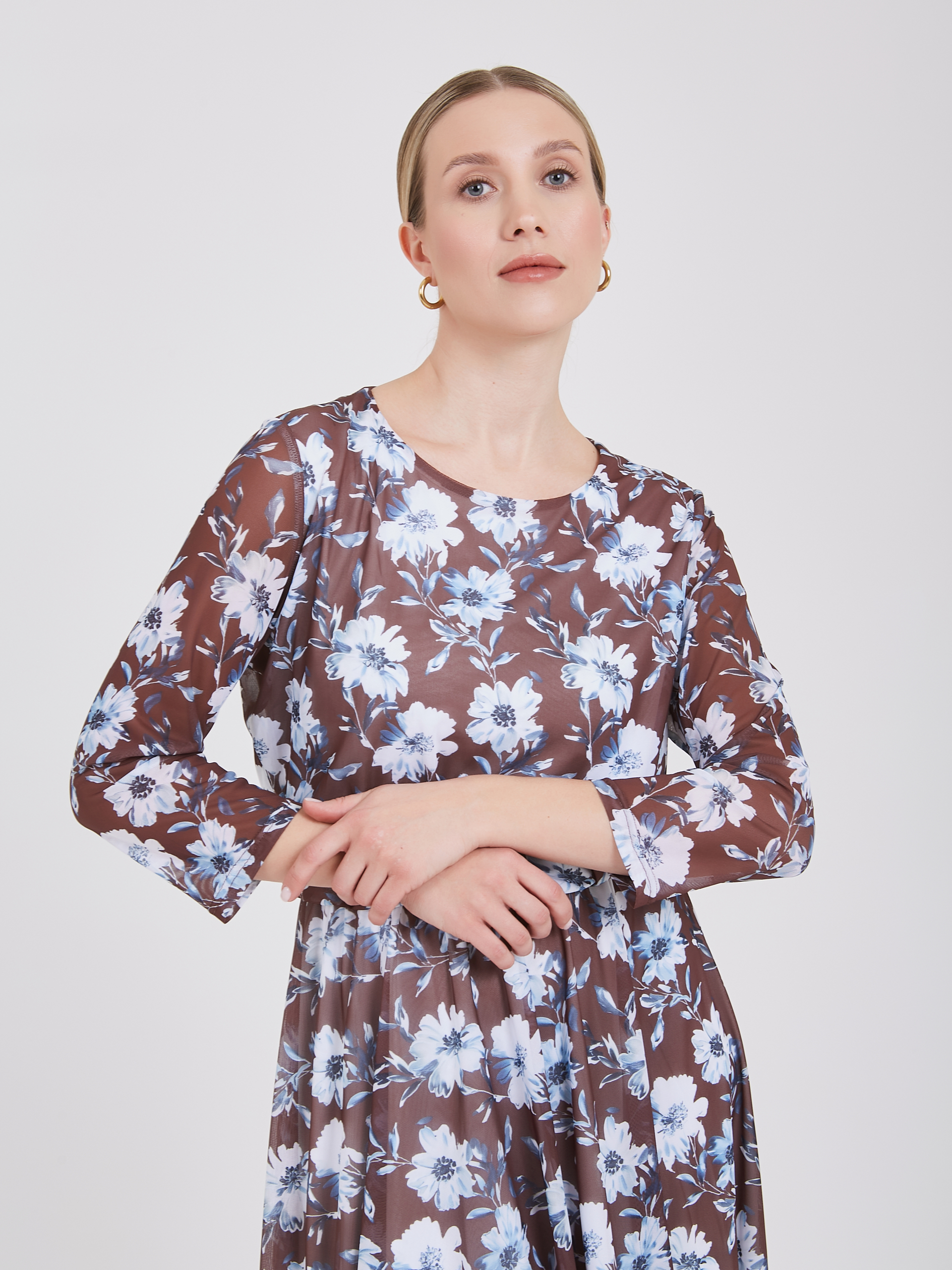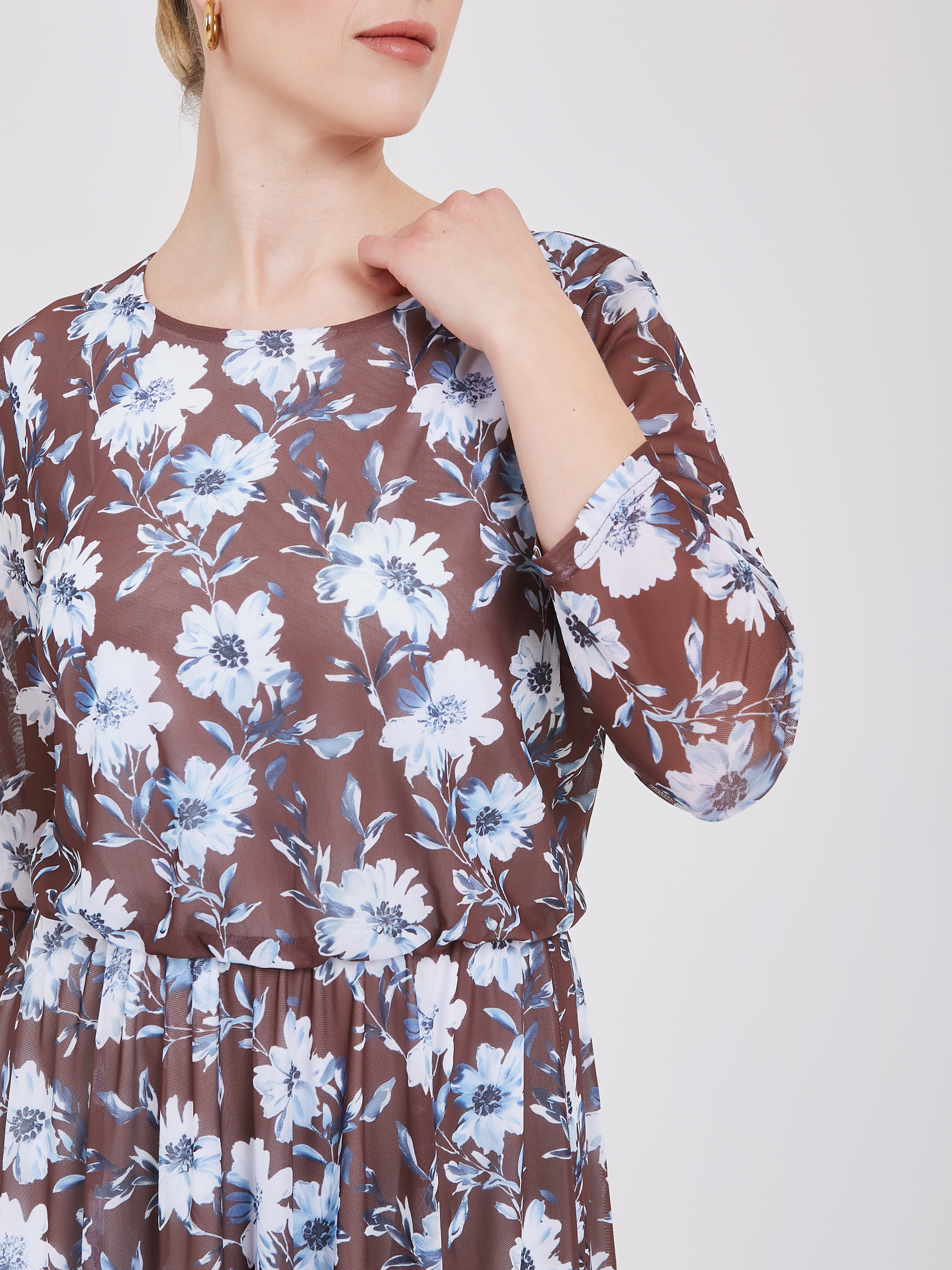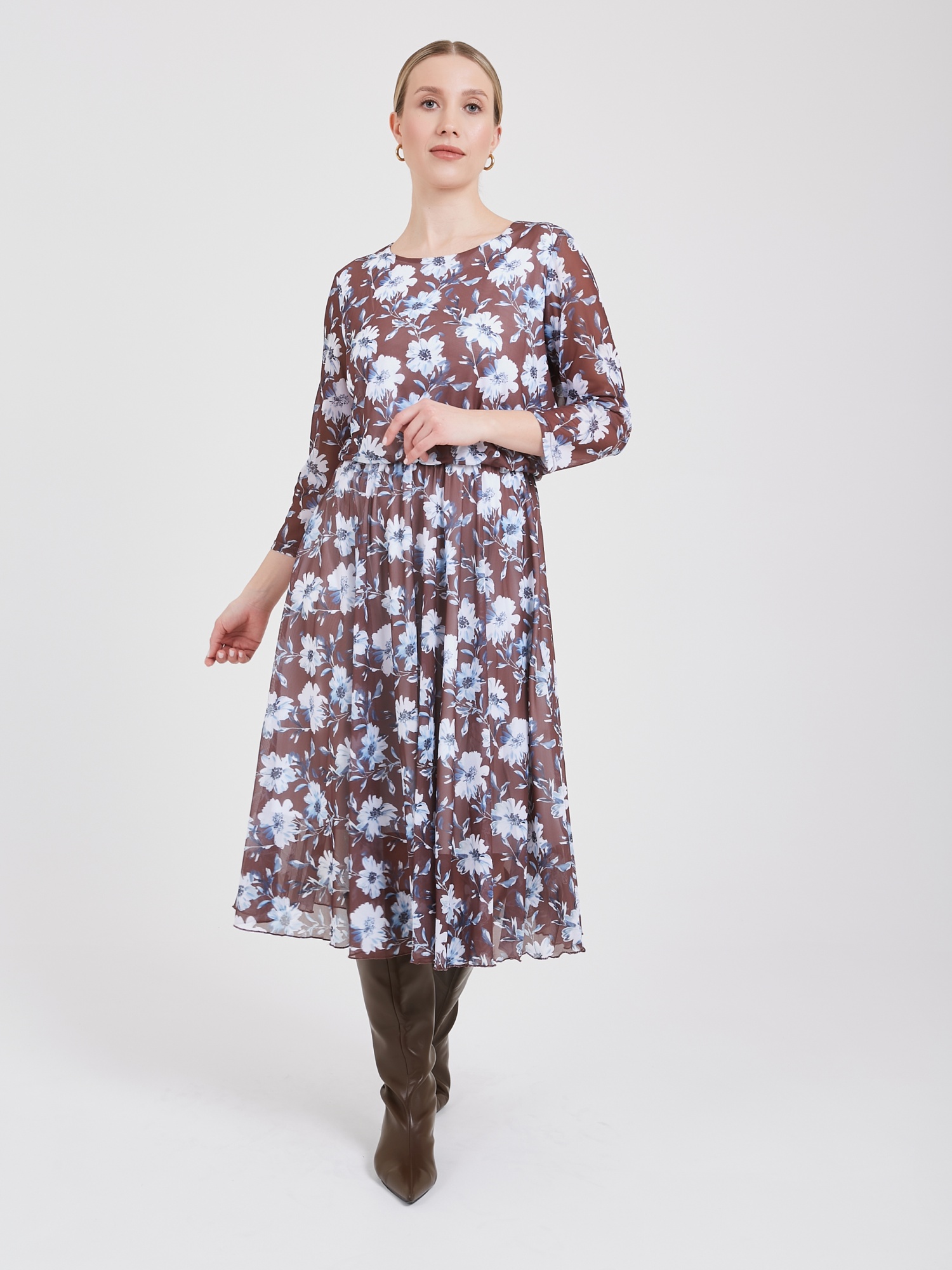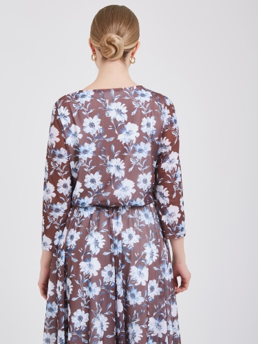 Нежное платье выполнено из мягкого, струящегося материала, подчеркивающего природную красоту обладательницы. Свободный покрой позволяет платью идеально сидеть на любой фигуре, даря комфорт и уверенность. Тонкая резинка деликатно обозначает талию, создавая легкий намек на женственную линию тела, сохраняя при этом чувство легкости и непринужденности. Нежный флористический голубой узор на насыщенном коричневом фоне добавляет романтичности и очарования, превращая каждый выход в праздник. Осень-Зима'25/26 Капсула "Вино из одуванчиков"