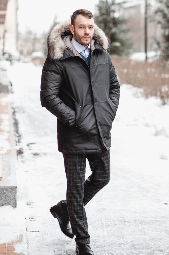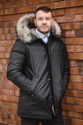 Куртка из натуральной кожи с утеплителем. Наполнитель 90 % пух, 10 % перо. Капюшон куртки оторочен мехом. Молния спереди закрыта ветрозащитной планкой на кнопках. Нашивка на рукаве. Рукава куртки оформлены манжетами. Прорезные карманы на передней части изделия. Лямки с внутренней стороны куртки.