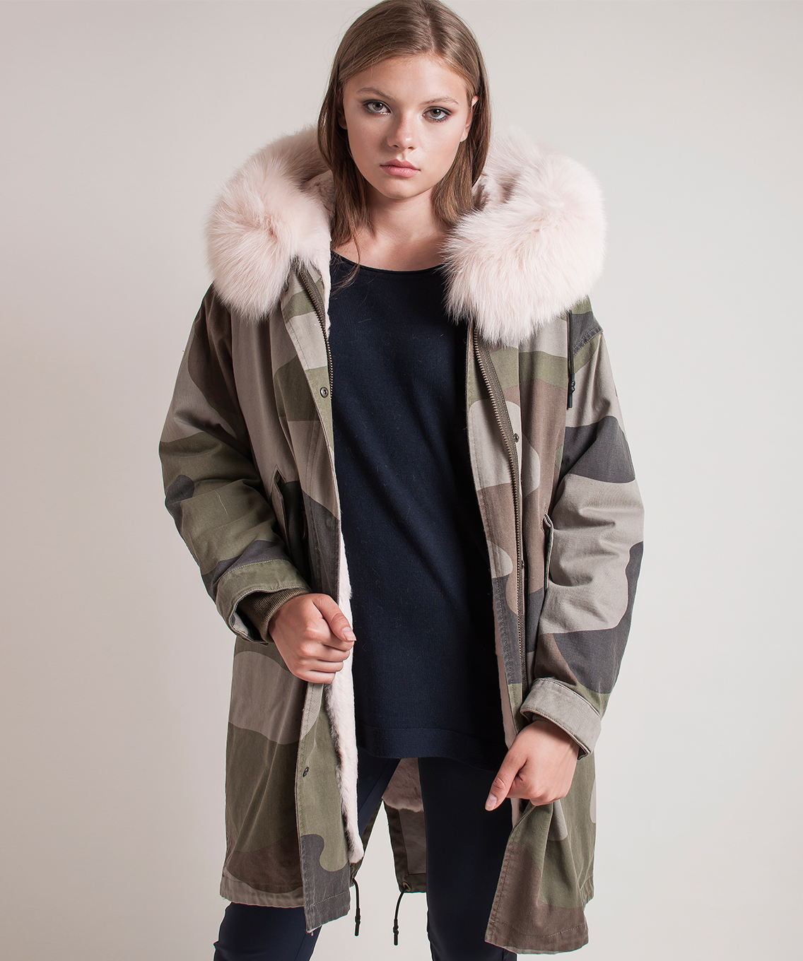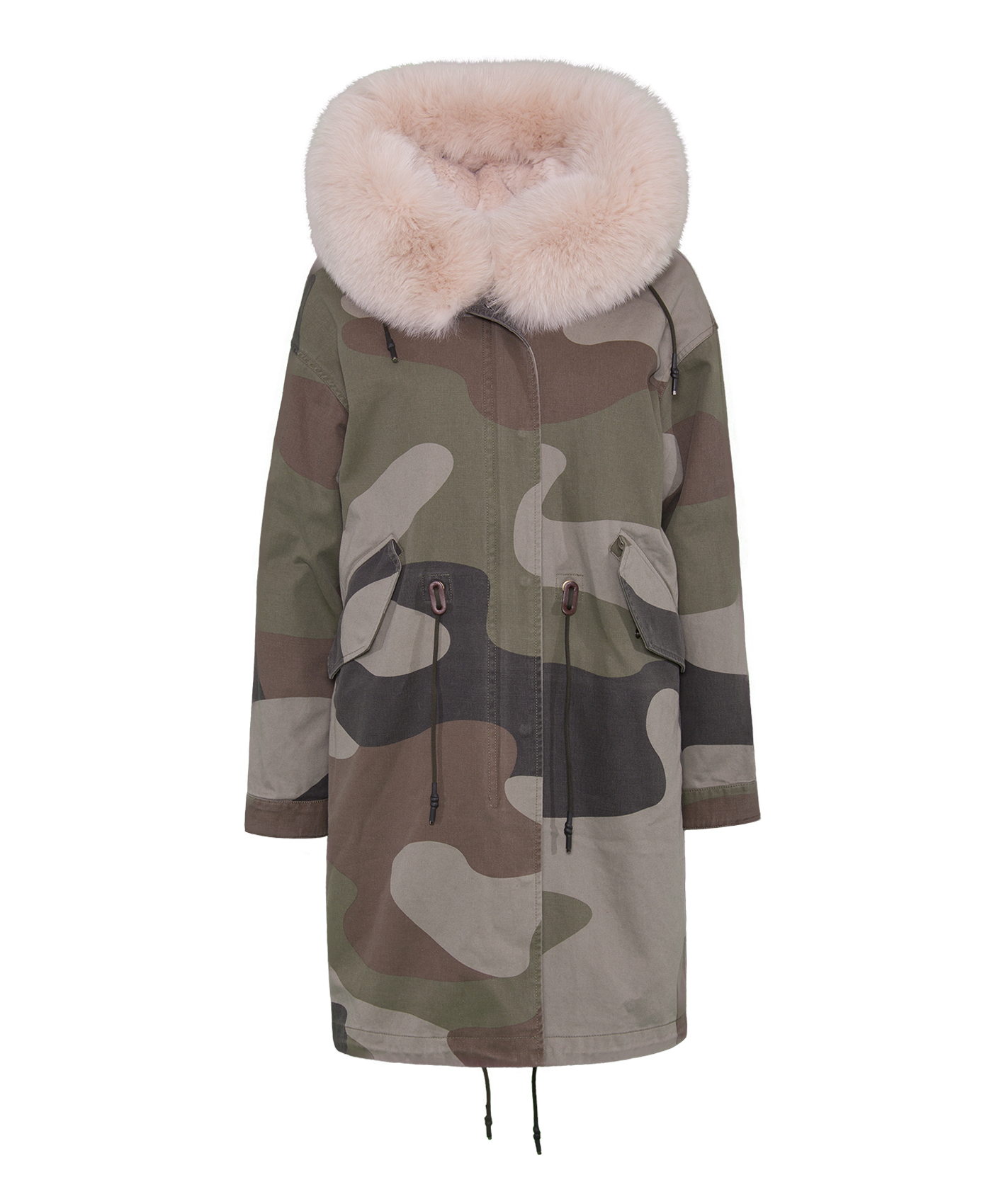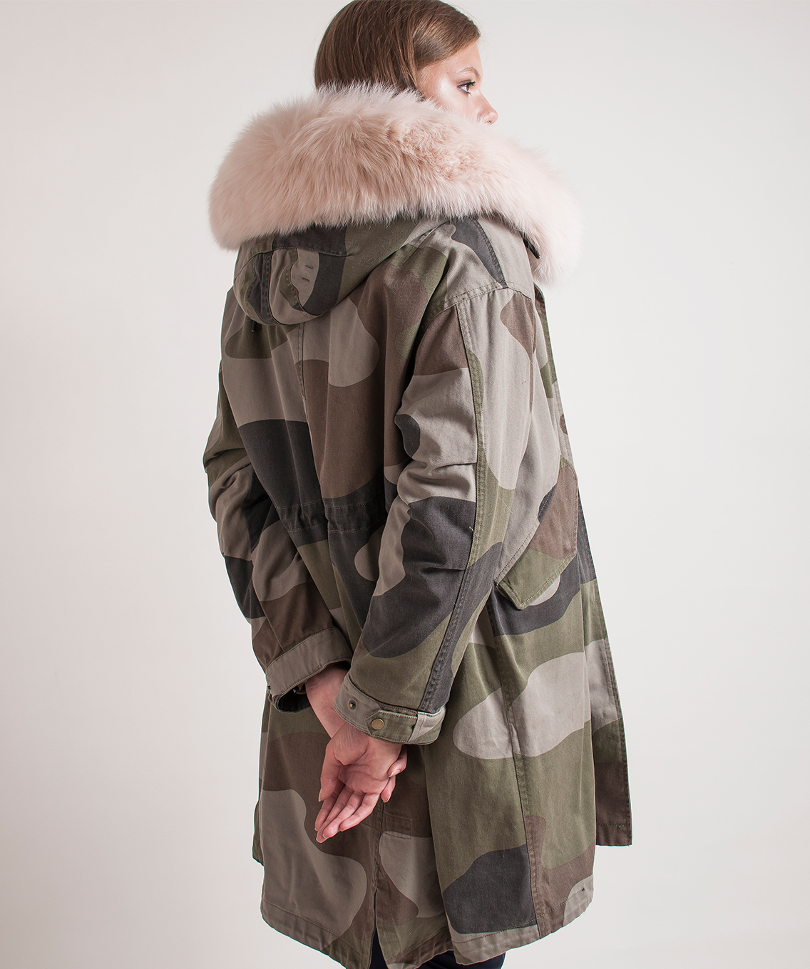 Теплая пихора с принтом под камуфляж. Плотная ткань верха. Прямой покрой, кулиска на талии. Удлиненная спинка. Разрез с задней части изделия, кулиска по низу. Отстегивающаяся подкладка из натурального меха кролика. Прорезные карманы на клапанах. Оторочка капюшона из натурального лисьего меха.