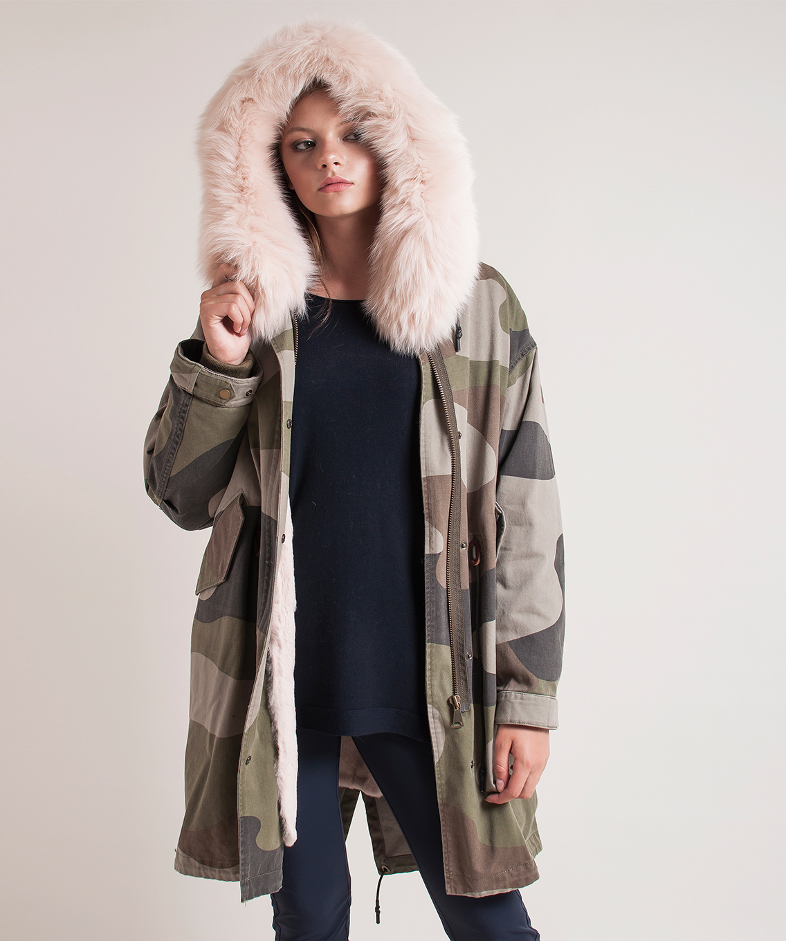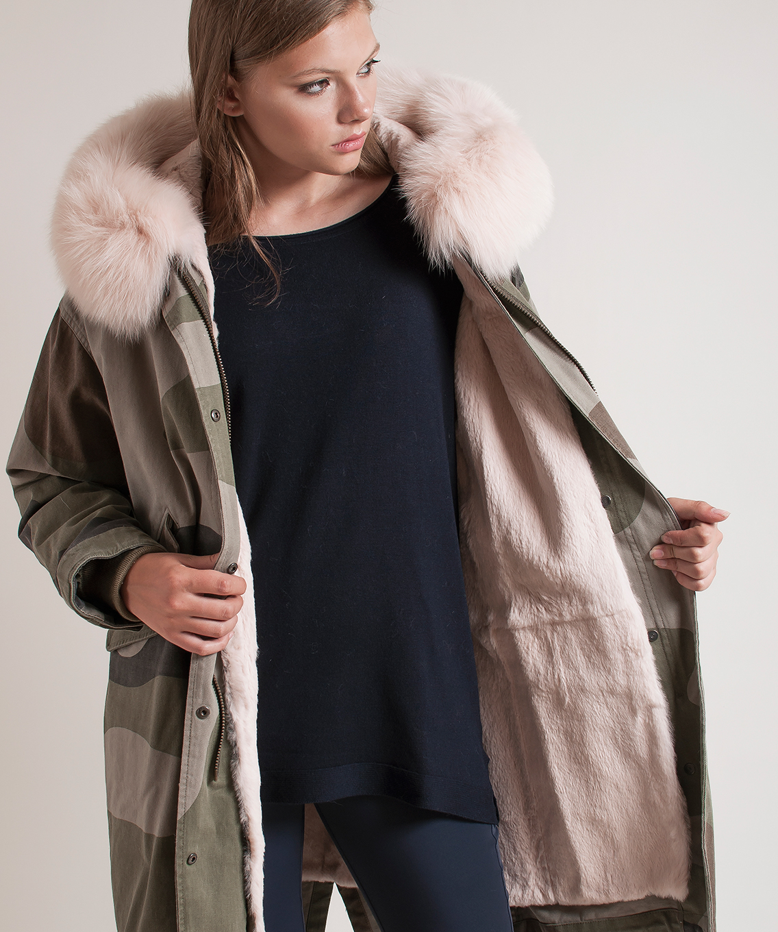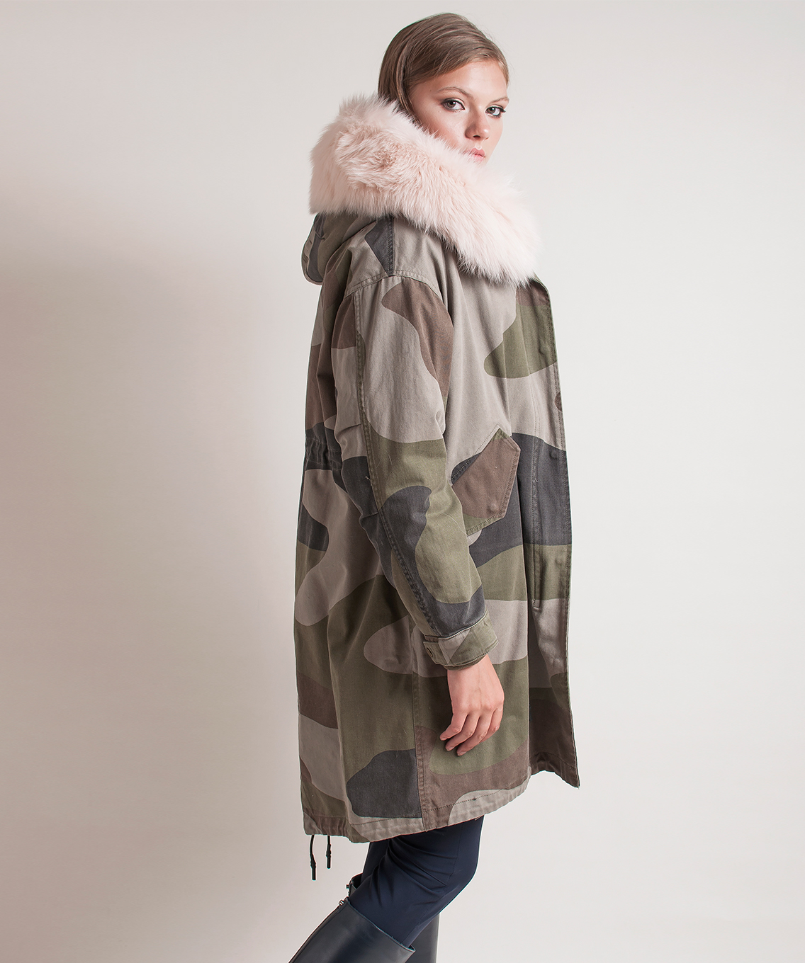 Теплая пихора с принтом под камуфляж. Плотная ткань верха. Прямой покрой, кулиска на талии. Удлиненная спинка. Разрез с задней части изделия, кулиска по низу. Отстегивающаяся подкладка из натурального меха кролика. Прорезные карманы на клапанах. Оторочка капюшона из натурального лисьего меха.