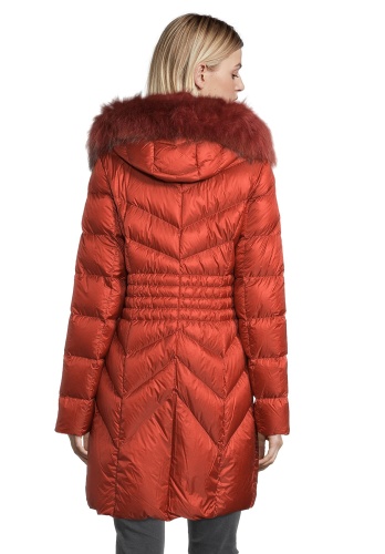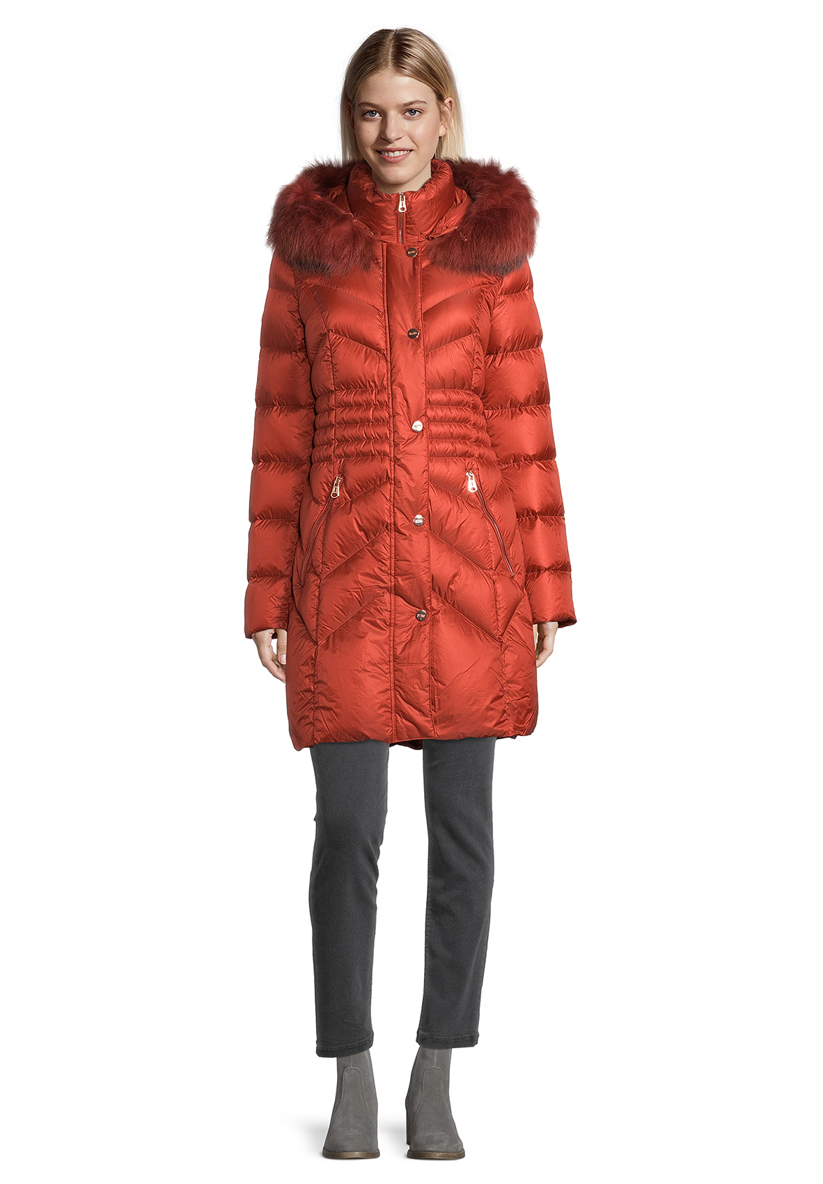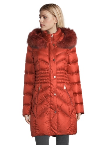 Пуховое пальто слегка приталенного силуэта. Удобная длина до середины бедра, практичный воротник-стойка, капюшон на кулиске, застежка-молния закрыта ветрозащитной планкой на кнопках, карманы на молниях. Материал верха отлично защищает от ветра и влаги. Отделка капюшона из натурального меха енота придает образу истинный шик.