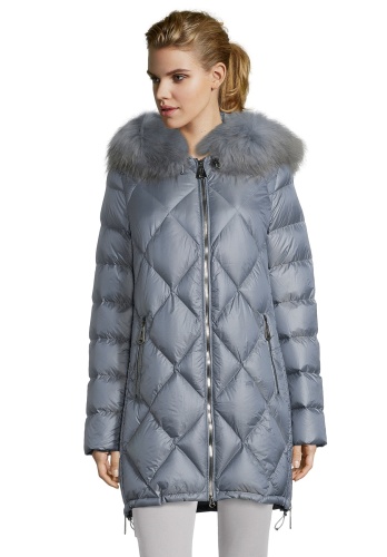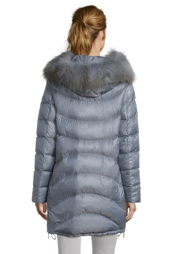 Пуховое пальто прямого покроя. Длина до середины бедра, капюшон на кулиске, двойная застежка-молния, карманы на молниях. Низ изделия на кулиске, что позволяет регулировать прилегание пуховика. Материал верха отлично защищает от ветра и влаги. Отделка капюшона из натурального меха енота придает образу истинный шик.