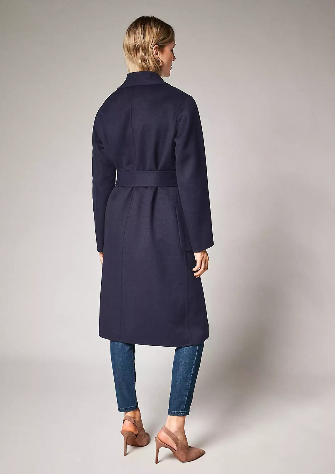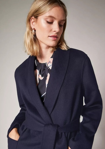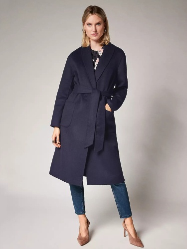 Драповое пальто-халат с отложным воротником с лацканами. В комплекте идет пояс из основного материала изделия. Накладные карманы.