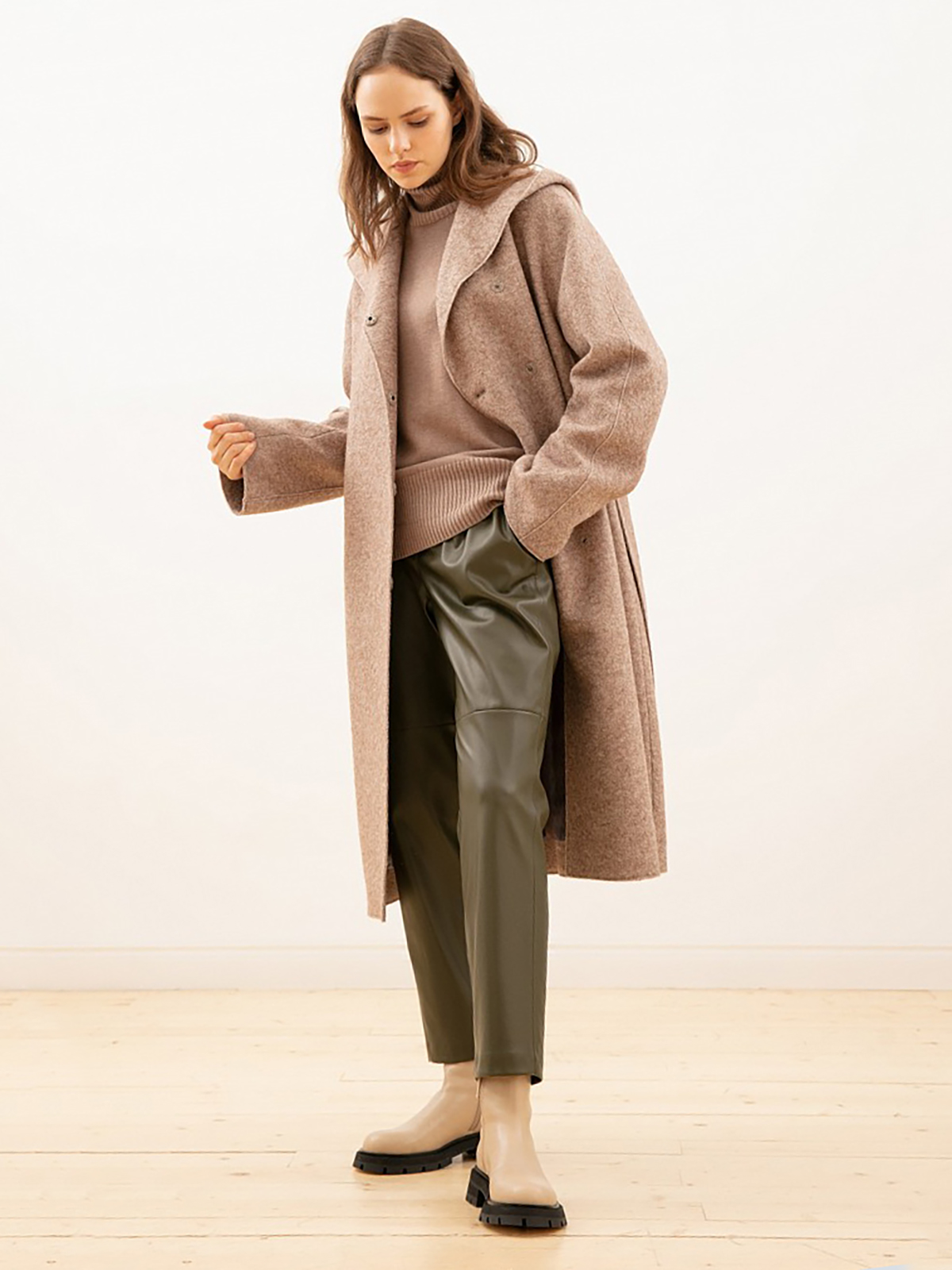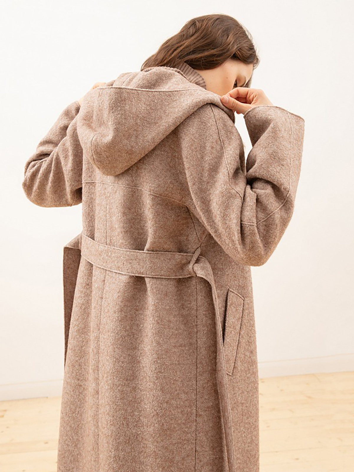 Пальто-халат с объемным капюшоном. Базовый коричневый оттенок, свободный крой подходит для любого типа фигуры. Застежка на пуговицы, в комплекте идет пояс из основного материала изделия. Шерсть в составе делает материал мягким, приятным на ощупь и хорошо сохраняющим тепло.