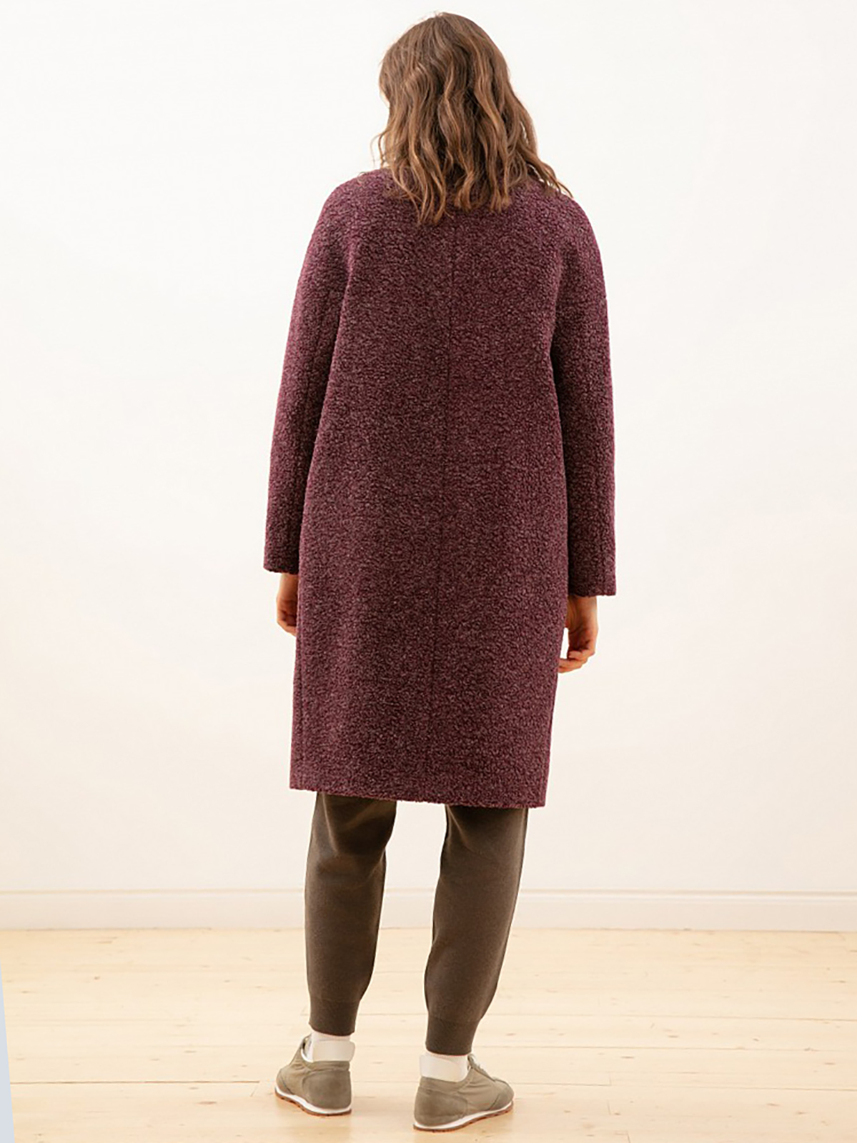 Однотонное повседневное пальто с крупным ворсом. Насыщенный ежевичный задаст тон всего образа. Силуэт кокон, длина ниже колена, застежка на пуговицу и кнопку.