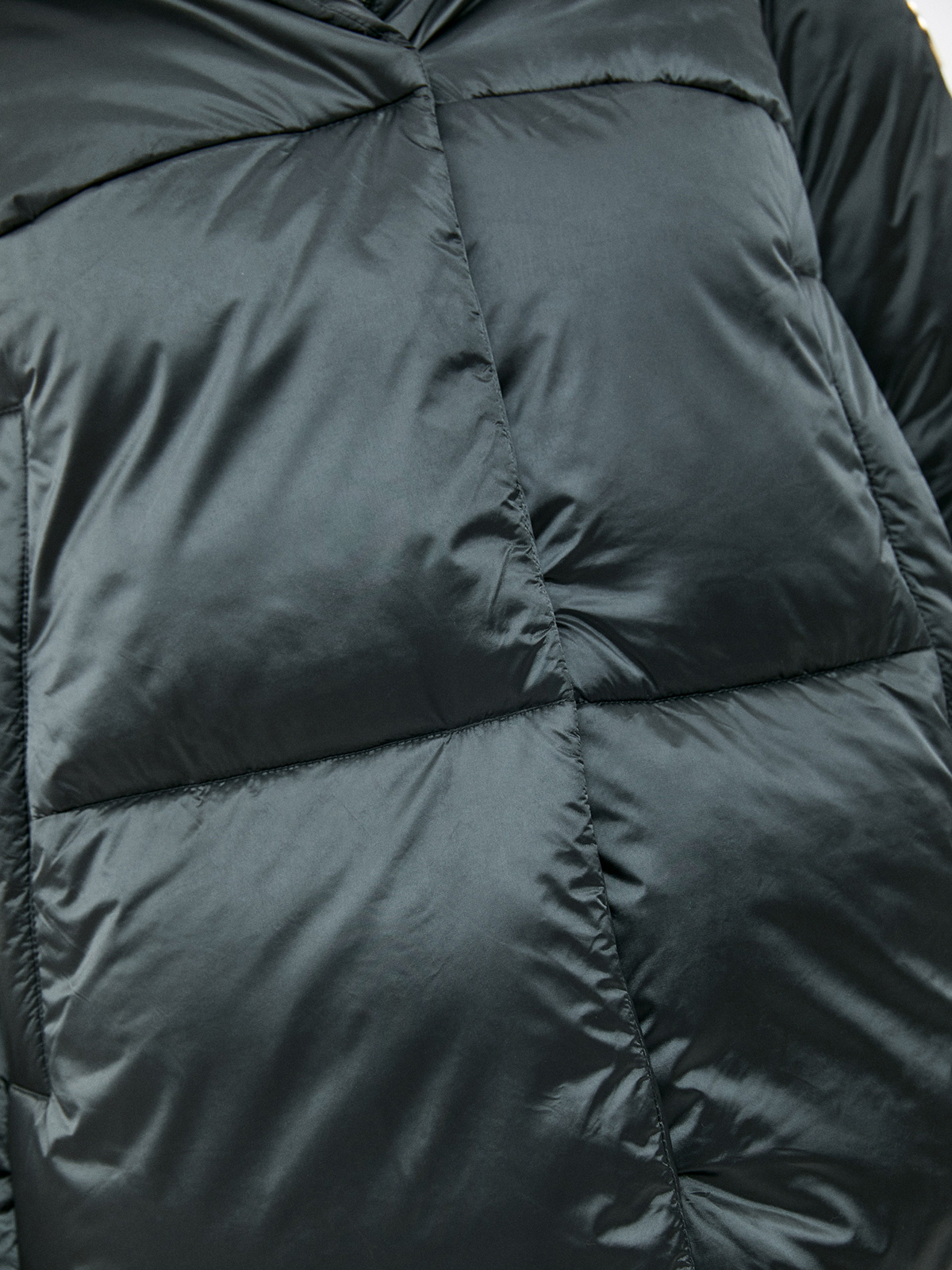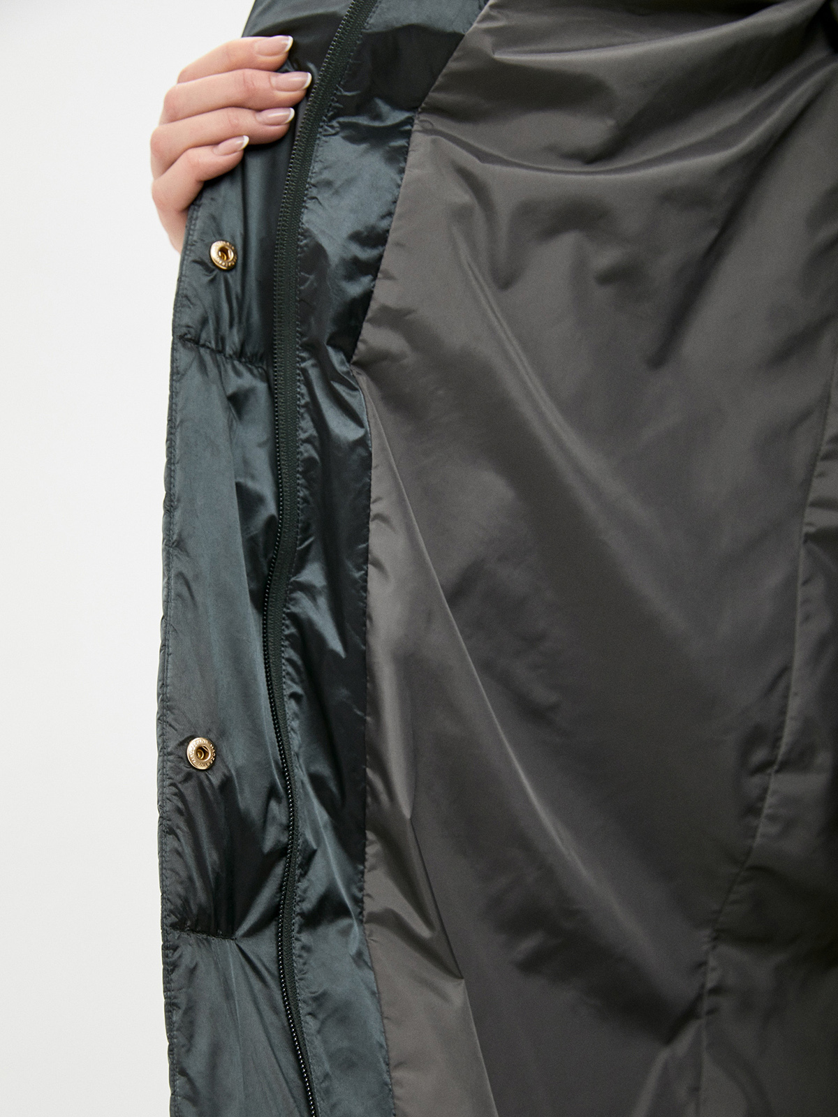 Стеганое пальто с наполнителем пух-перо. Застежка на молнии, ветрозащитный планка на кнопках, несъемный капюшон, боковые прорезные карманы с листочкой. Пальто хорошо защитит от холода и дополнит образ в городском стиле.
