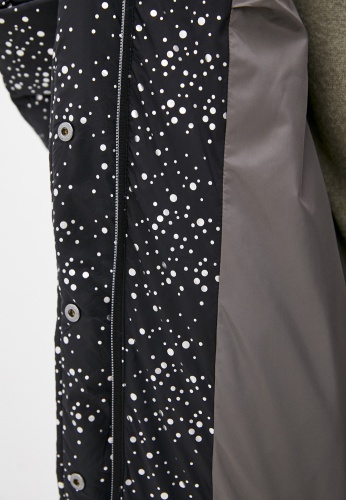 Стеганая куртка без капюшона с синтепоновым наполнителем. Стильный принт по всей поверхности изделия. Прямой силуэт универсален для любого типа фигуры. Воротник-стойка отделан искуственным мутоном. Застежка на скрытую молнию и кнопки. По бокам проперзные карманы с листочкой на кнопке.