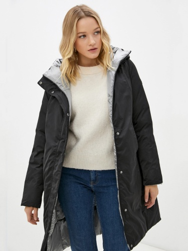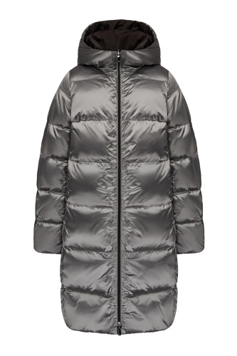 Двустороннее пальто прямого силуэта на натуральном пуху. Универсальная модель для любого образа, можно носить черной или серебристой стороной. Воротник-стойка, застежка на потайную молнию и кнопки.