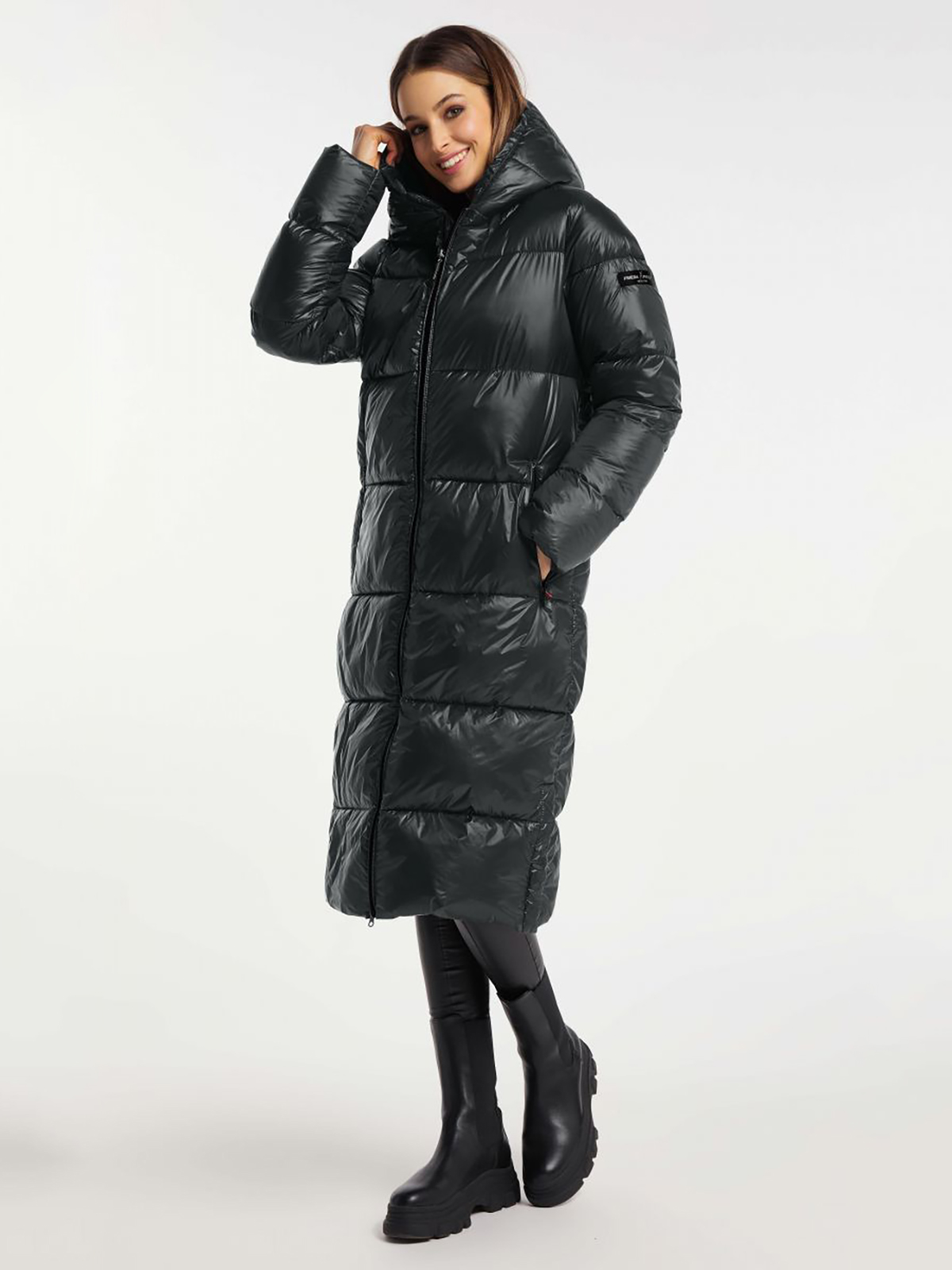 Однотонные зимнее пальто длиной ниже колена. Синтепоновый наполнитель. Застежка на молнию, воротник стойка, объемный капюшон. Два боковых кармана с листочкой, плюс внутренний карман.