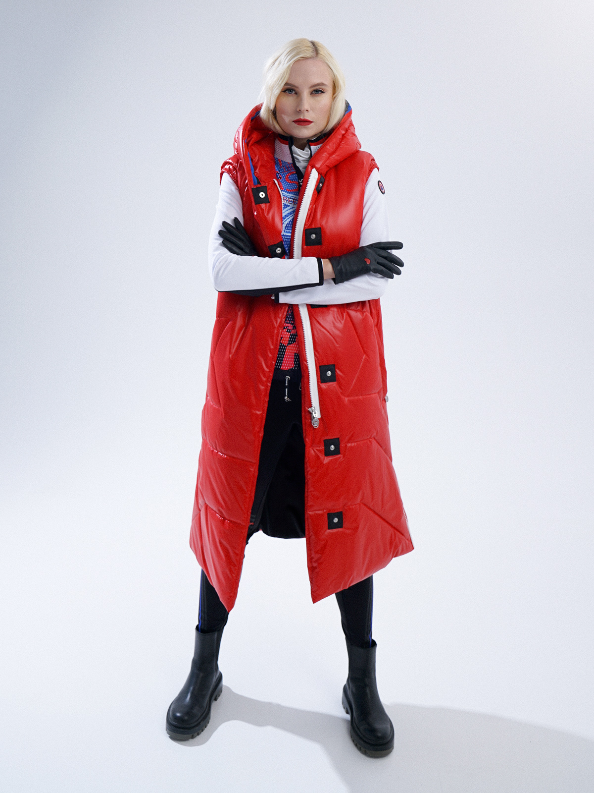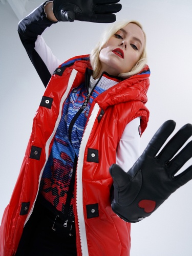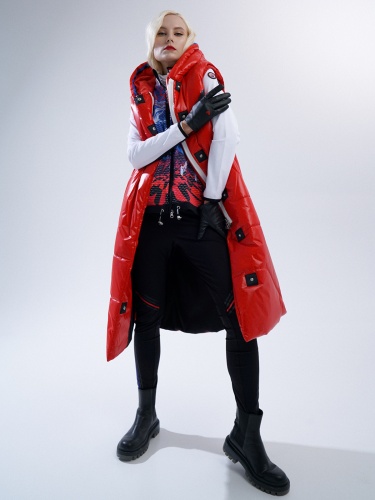 Удлиненный стеганый жилет ярко-красного цвета – теплый и стильный элемент аутфита. Подойдет для образов в спортивном или повседневном стиле, а также для образов спорт-шик. Застежка на контрастную молнию и клепки. Объемный капюшон защищает от ветра.