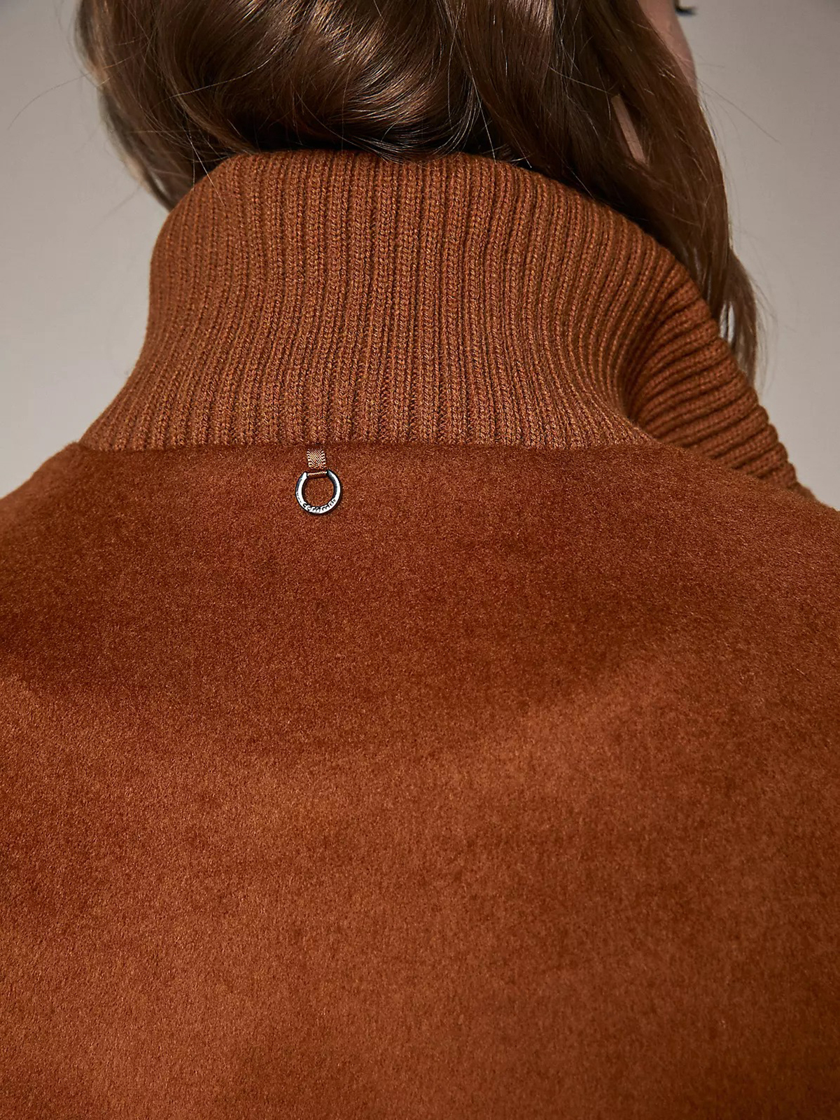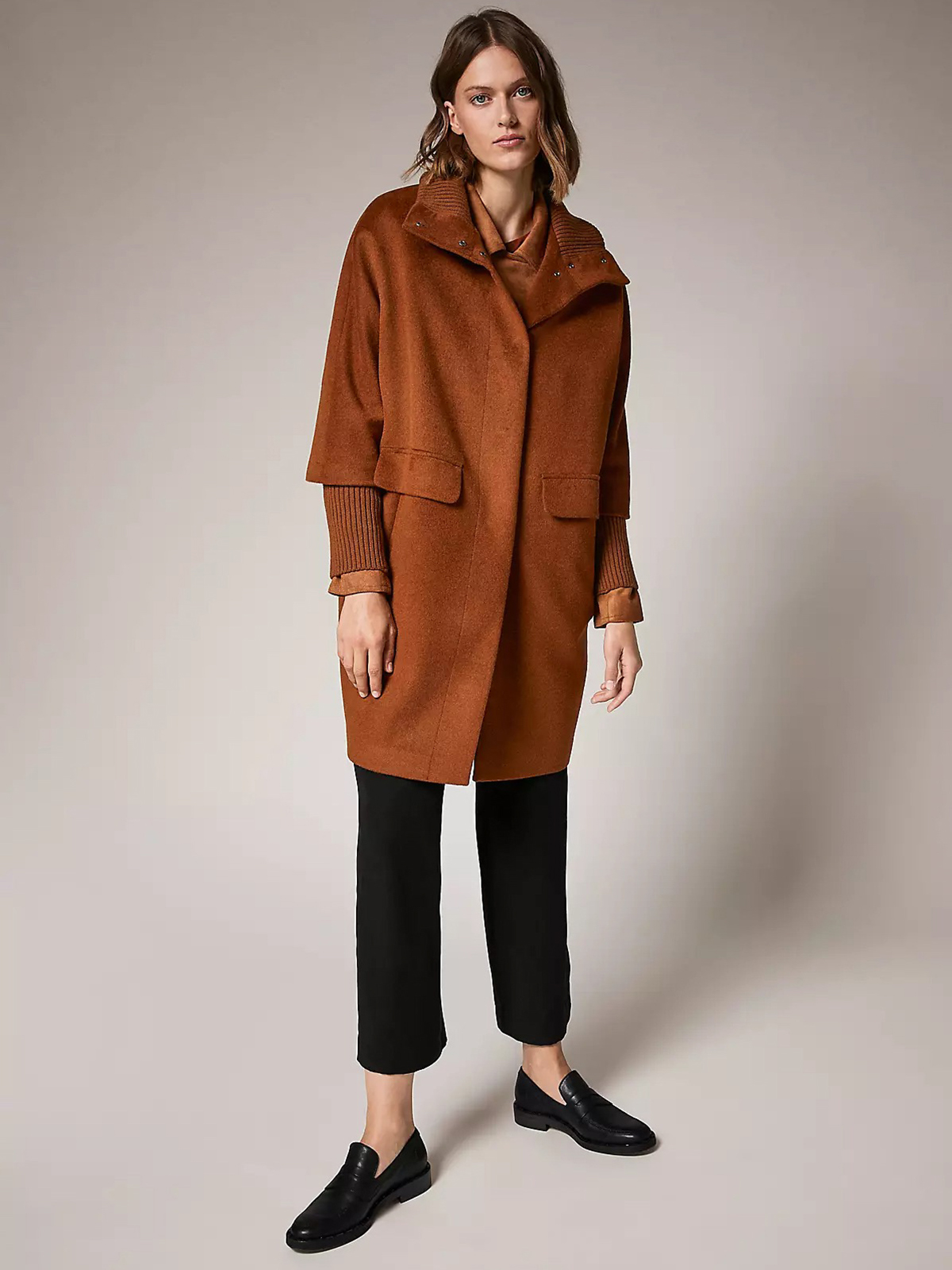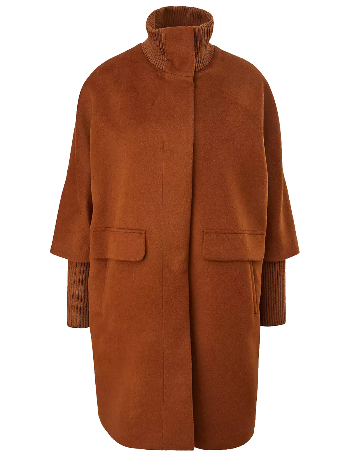 Однотонное драповое демисезонное пальто коричневого оттенка. Материал из смесовой шерсти. Супатная застежка на кнопки. Длинные втачные рукава с широкими трикотажными манжетами в рубчик. Высокий воротник стойка в рубчик. Боковые карманы с клапанами.