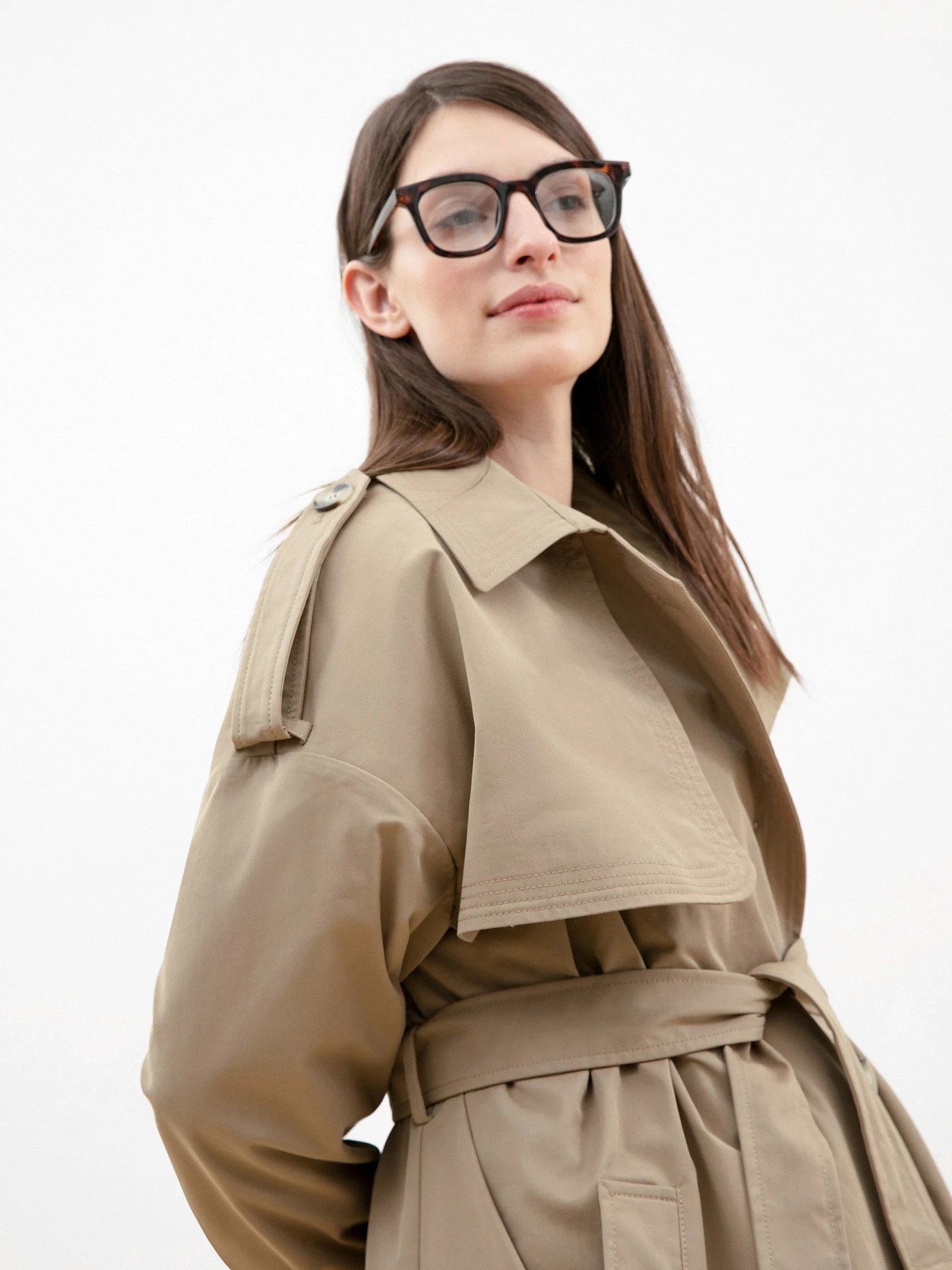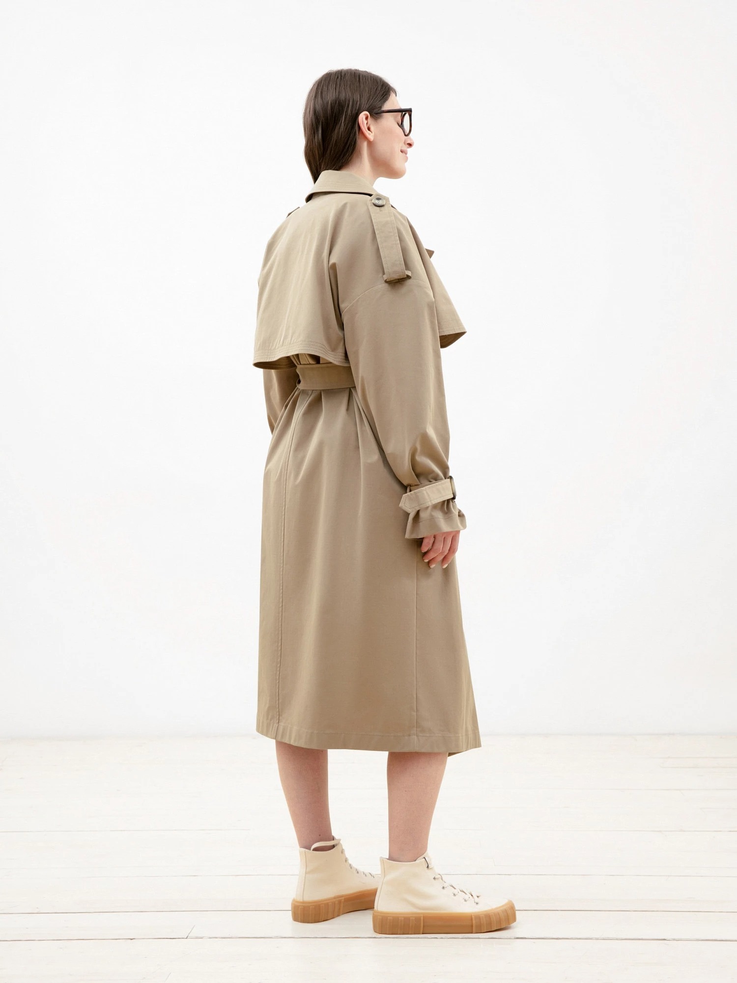 Двубортный тренч прямого силуэта из плащевой ткани бежевого цвета. Классический крой и длина миди делают эту модель универсальным дополнением образов в любом стиле. Рукав рубашечный, английский воротник, с возможностью застегивания на верхнюю пуговицу,чтобы закрыть зону декольте и не только изменить образ, но и предотвратить попадание ветра