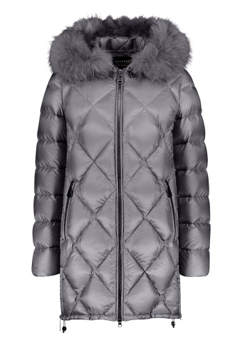 Пуховое пальто прямого покроя. Длина до середины бедра, капюшон на кулиске, двойная застежка-молния, карманы на молниях. Низ изделия на кулиске, что позволяет регулировать прилегание пуховика. Материал верха отлично защищает от ветра и влаги. Отделка капюшона из натурального меха енота придает образу истинный шик.