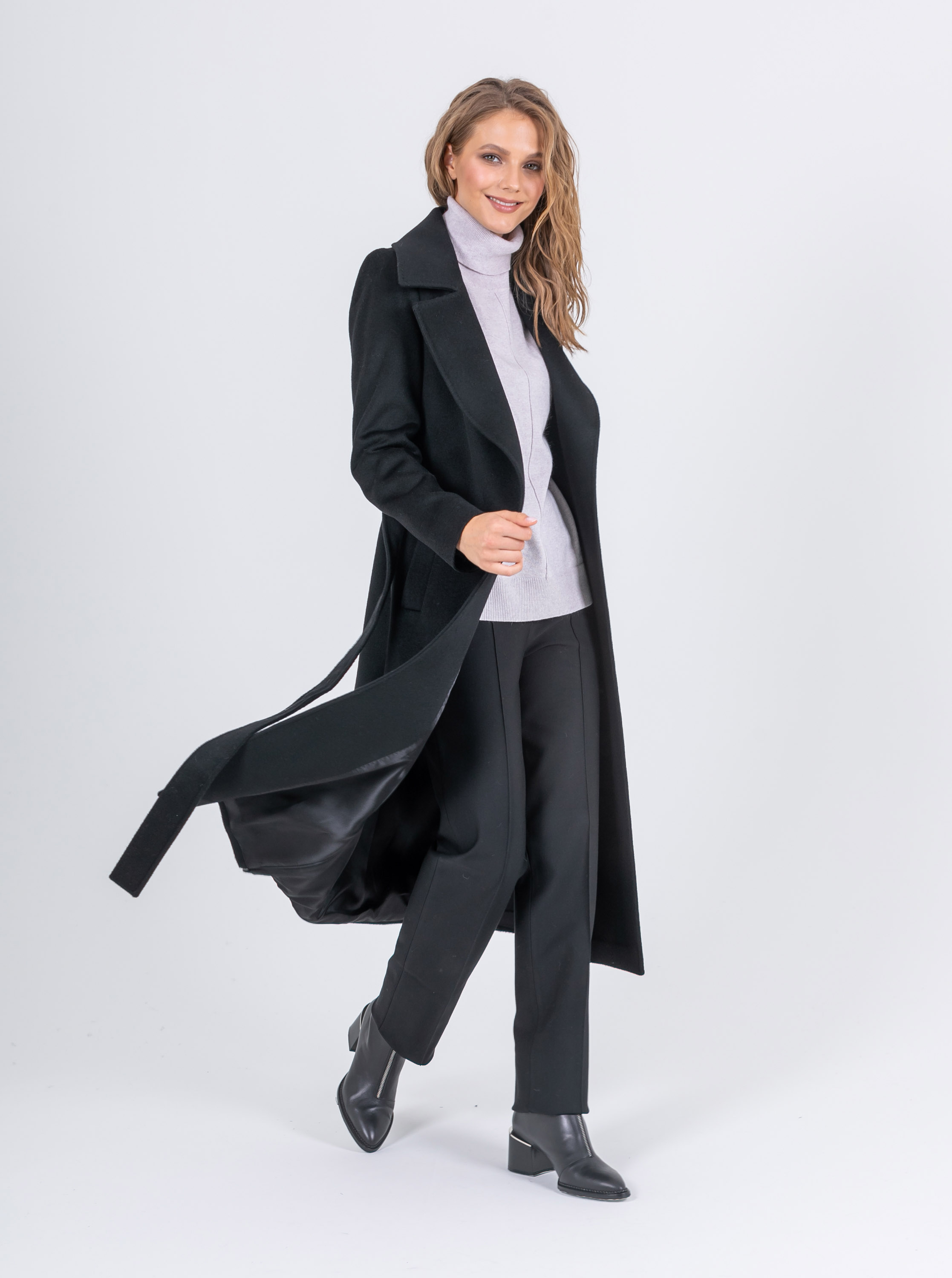 На сайте указаны российские размеры. Офисное строгое пальто из 100% шерсти. Прямой крой, английский воротник, внутренние карманы, на поясе. Вдоль бокового шва с 2-х сторон пальто расположены замки, расстегнув которые можно задать модели изюминку в виде разрезов. Рост модели: 174 см