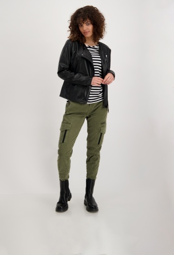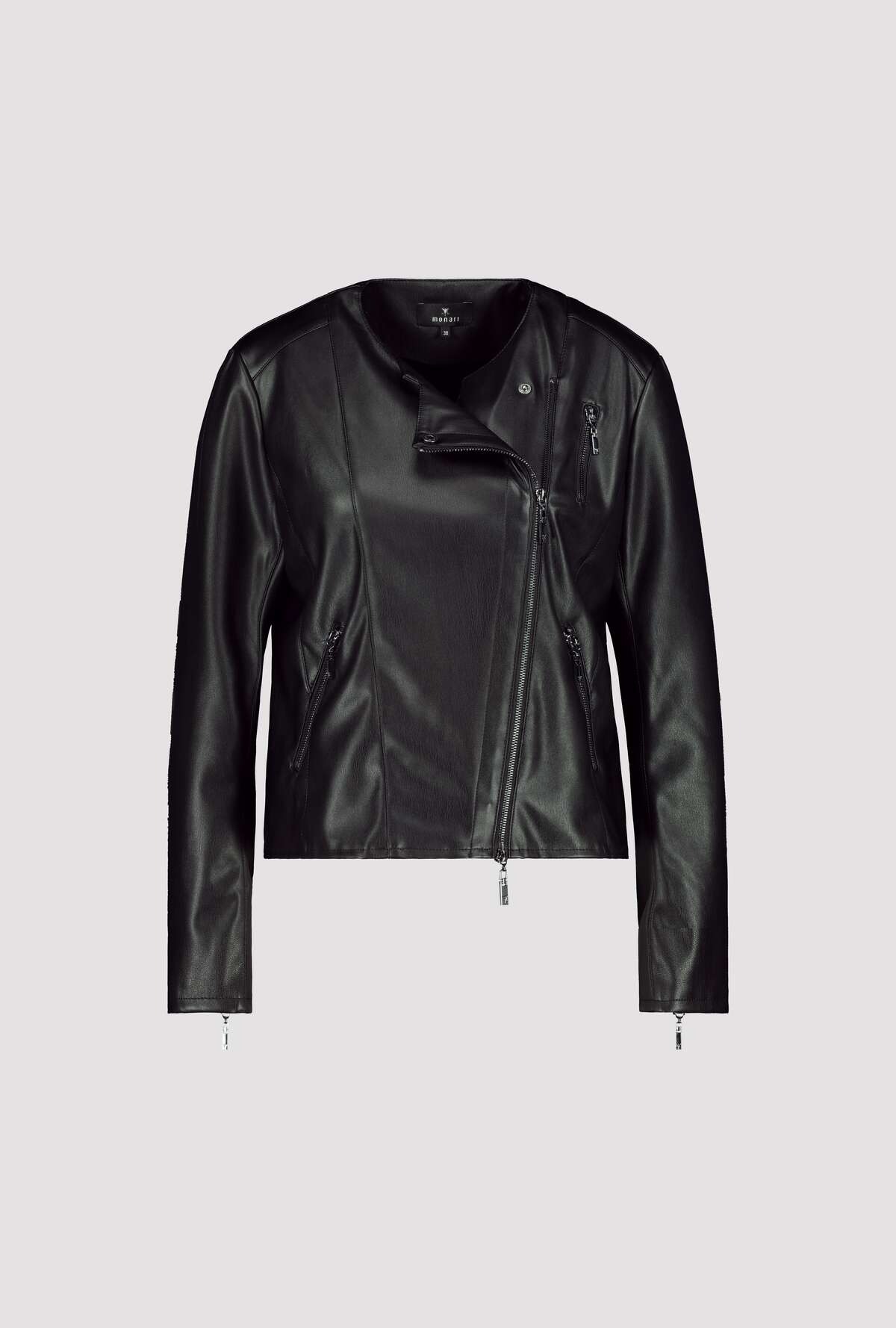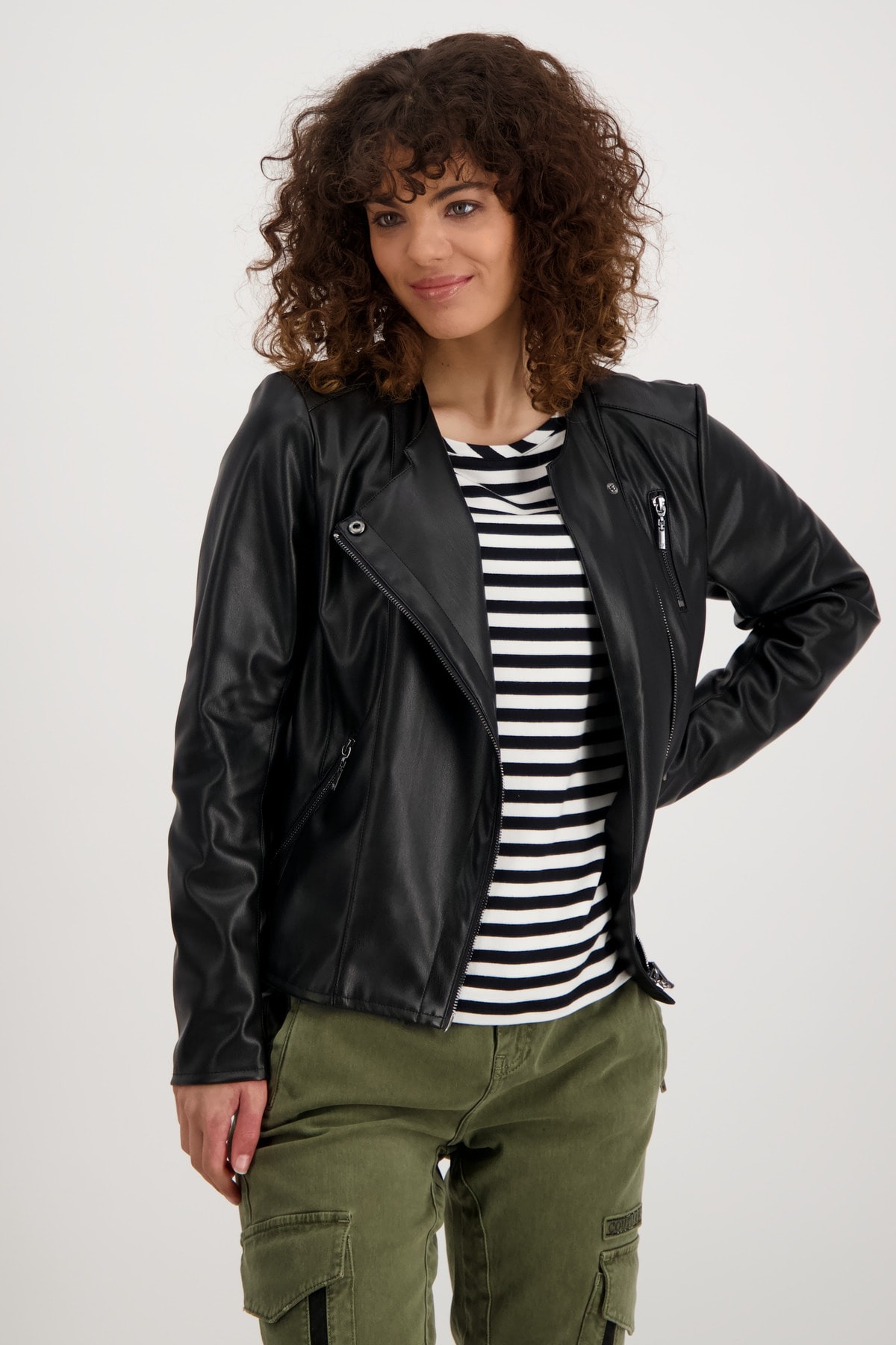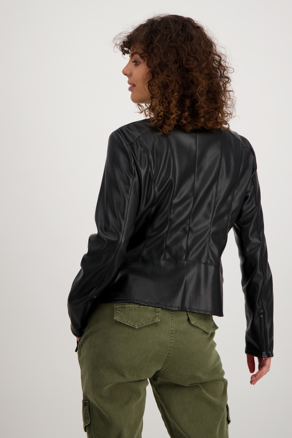 На сайте указаны российские размеры. Куртка в байкерском стиле из мягкой искусственной кожи с длинными рукавами. Прямой крой с круглым вырезом. Куртка украшена продольными разделительными швами на рукавах, переде и спинке, швами «принцесса» и плечевыми кокетками. Концы рукавов отделаны разрезом и молнией, а передняя часть имеет двустороннюю смещенную молнию, боковые прорезные карманы на молнии и дополнительный ложный карман на молнии на уровне груди. Рост модели 174 см Длина по спинке 44 размера составляет 58 см, а по переду – 74 см.
