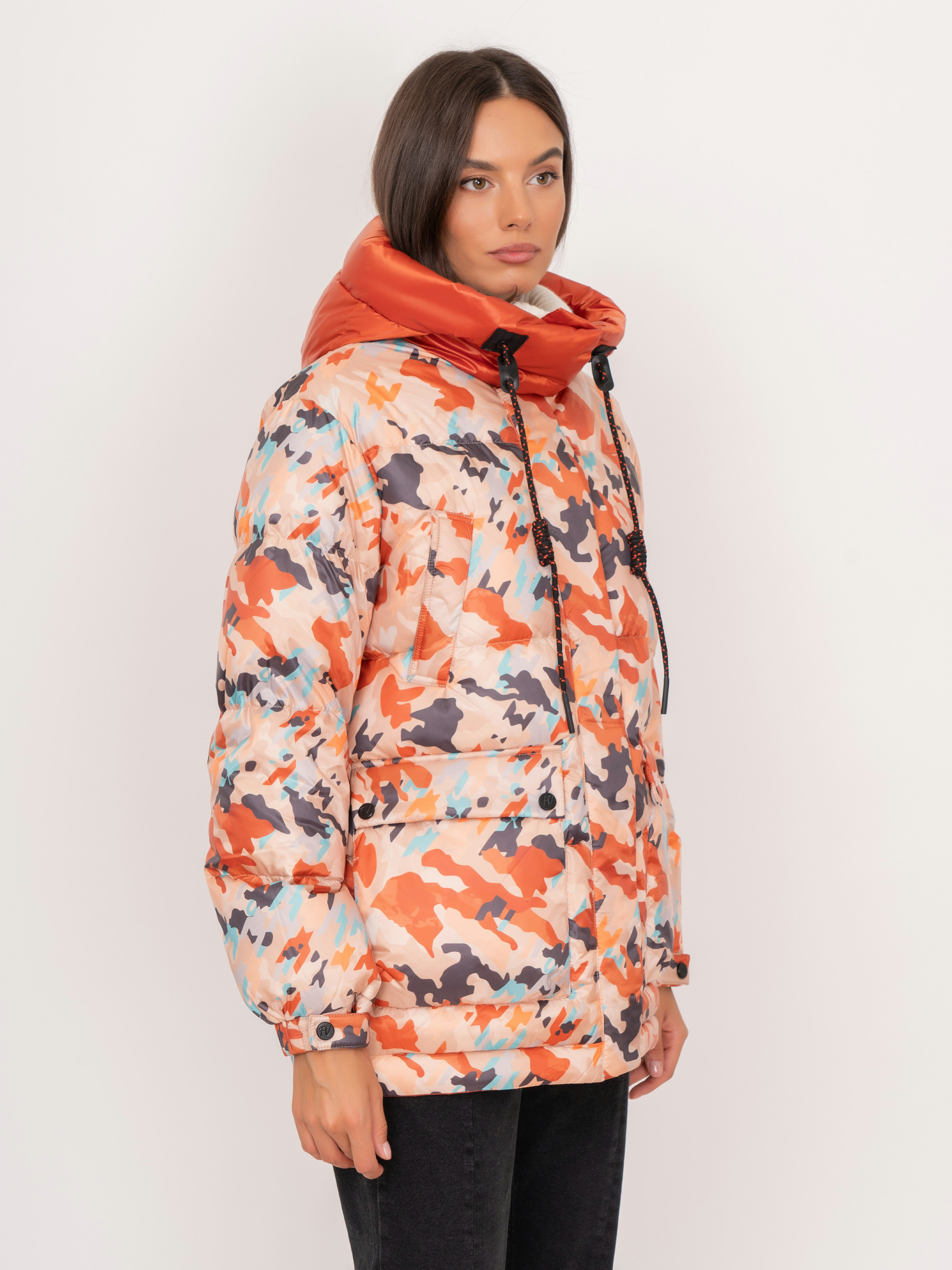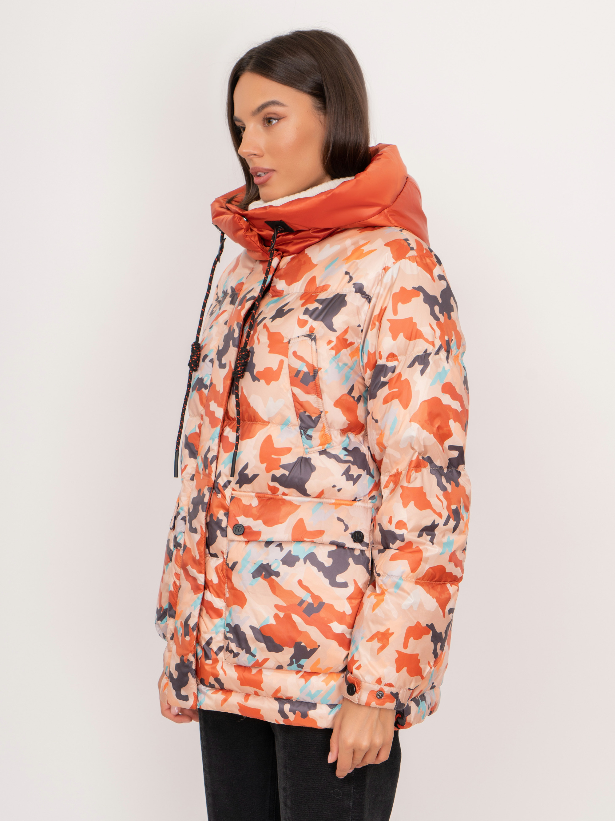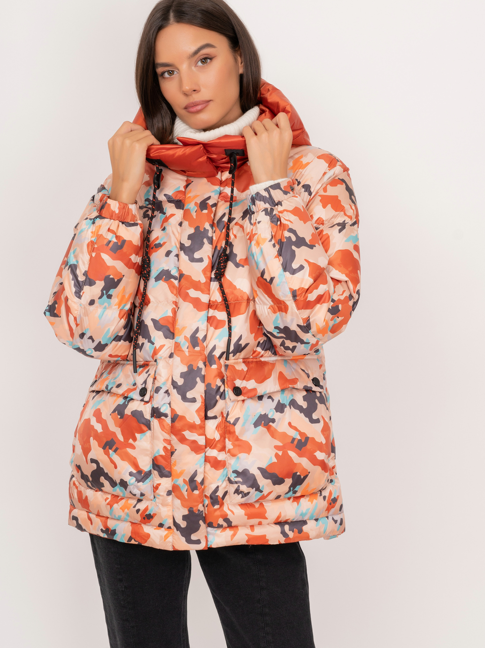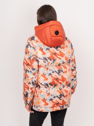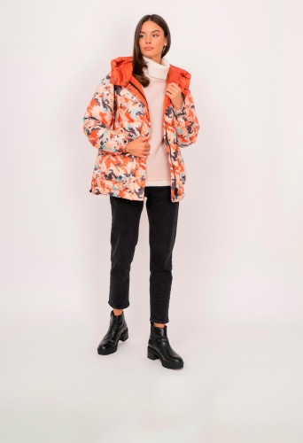 На сайте указаны российские размеры. Утепленная прямая оранжевая куртка на молнии и кнопках , с капюшоном на завязках, с длинным рукавом на кнопке, с прорезными и накладными карманами, с абстрактным рисунком. Рост модели: 175 см. Длина куртки: 69 см.