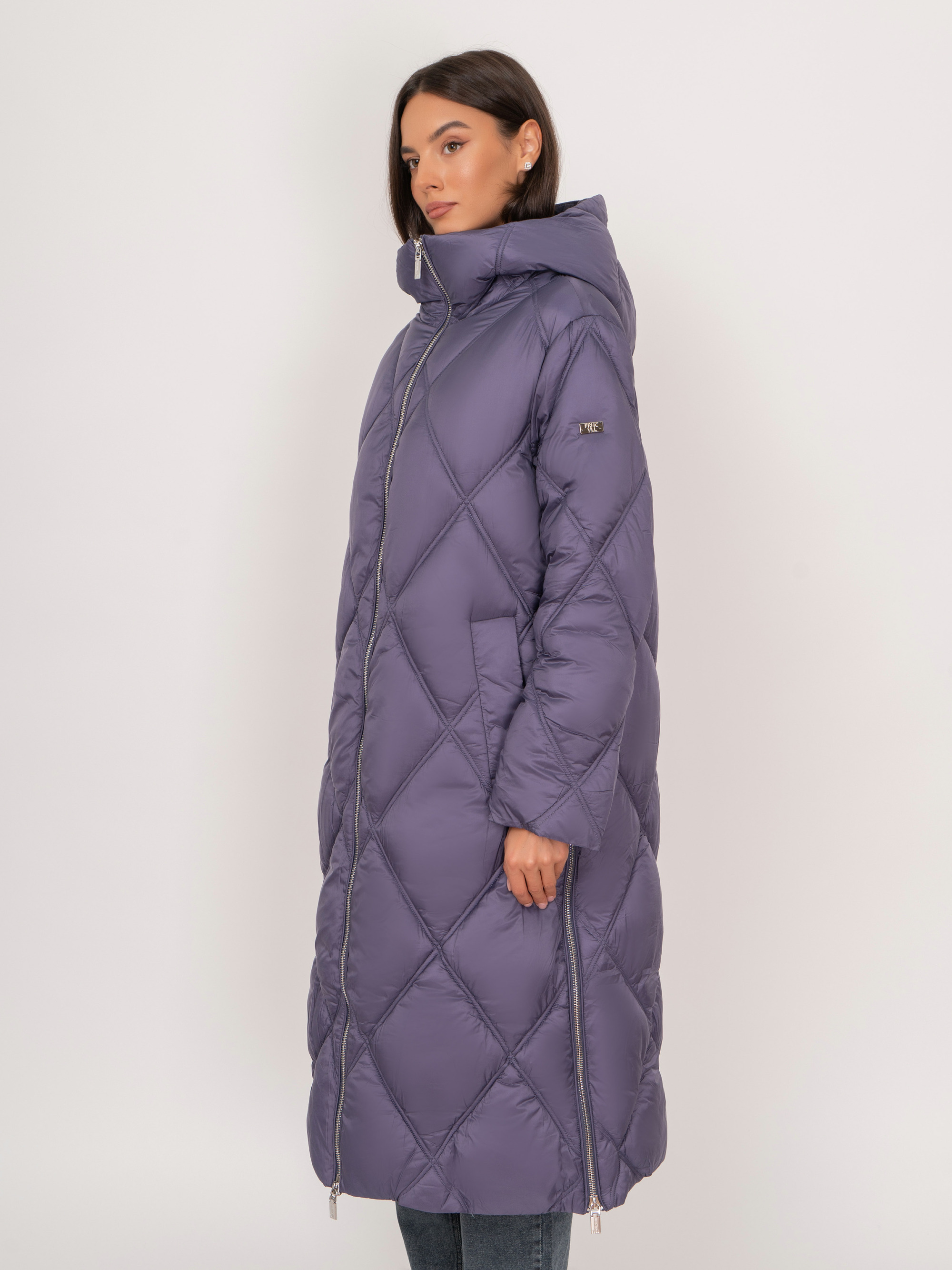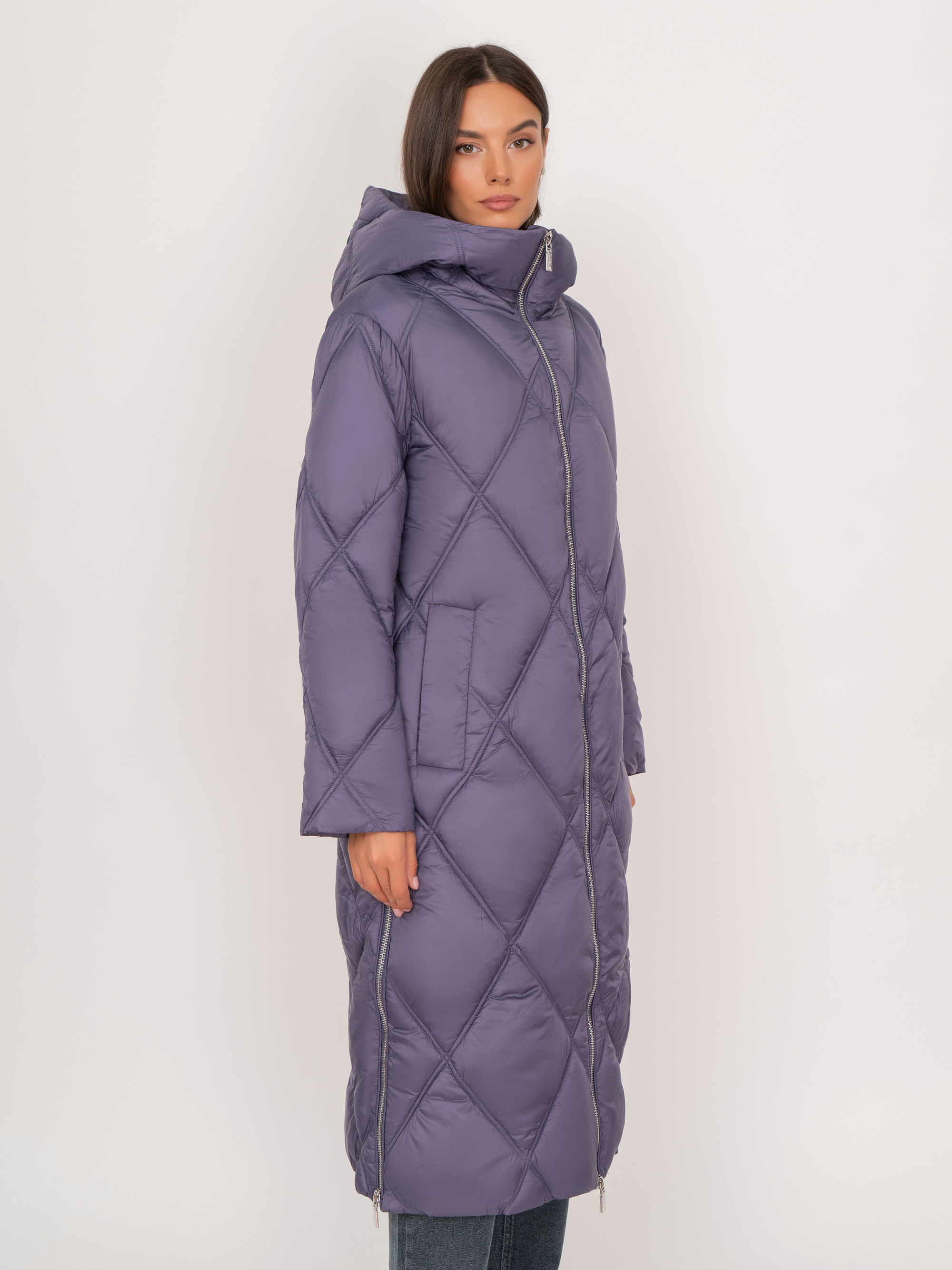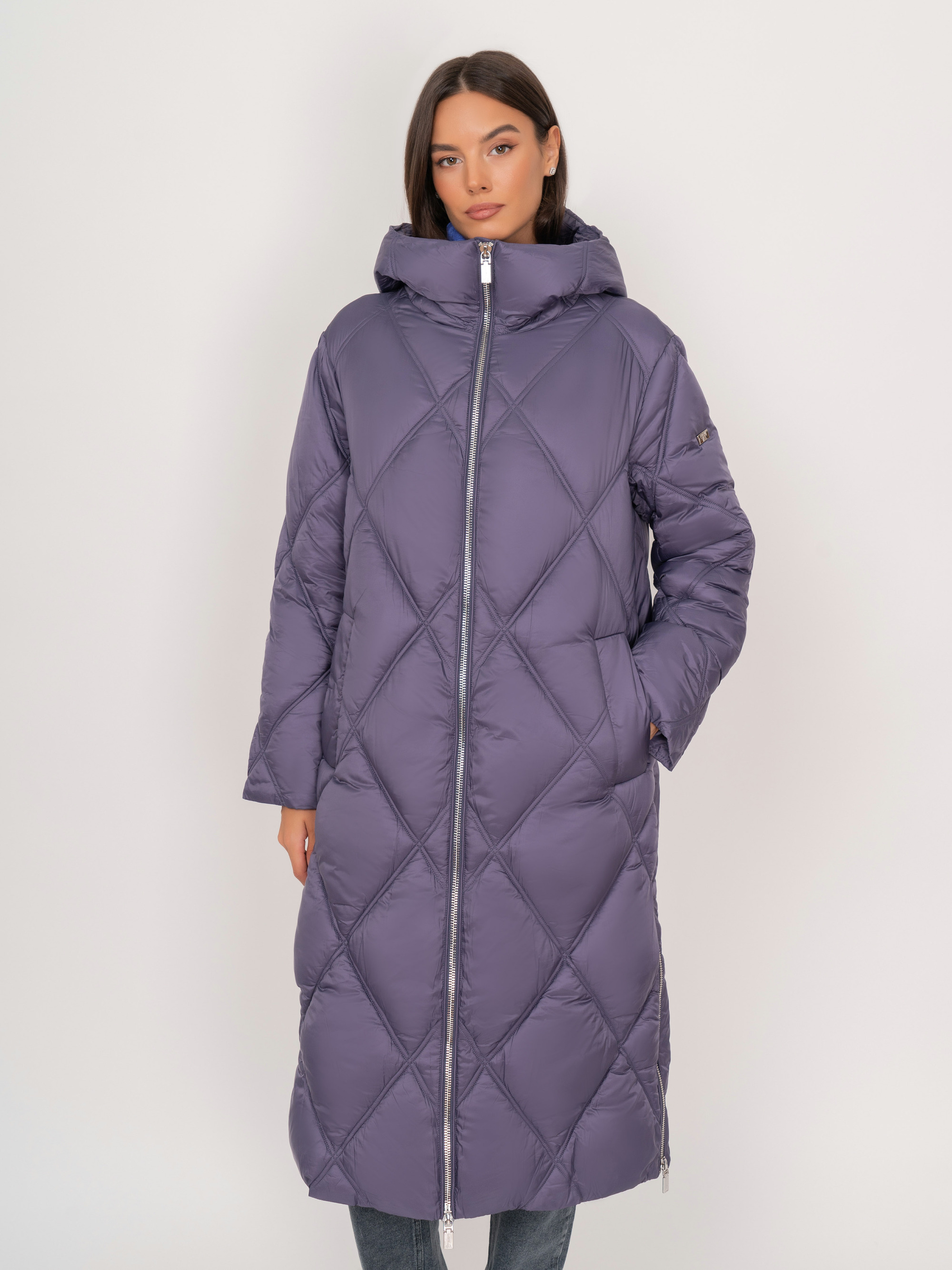 На сайте указаны российские размеры. Прямое стеганое утепленное фиолетовое пальто на молнии, с капюшоном, с длинным рукавом, с прорезными карманами на кнопках. Рост модели: 175 см. Длина куртки: 114 см.