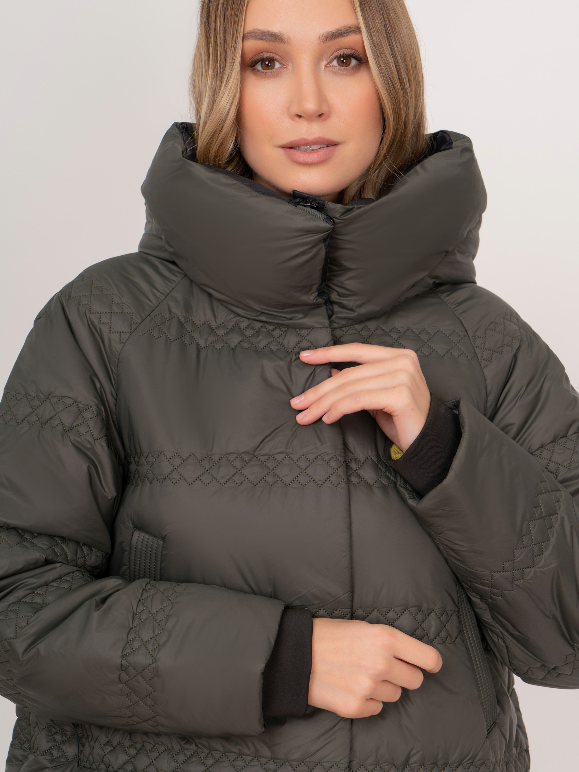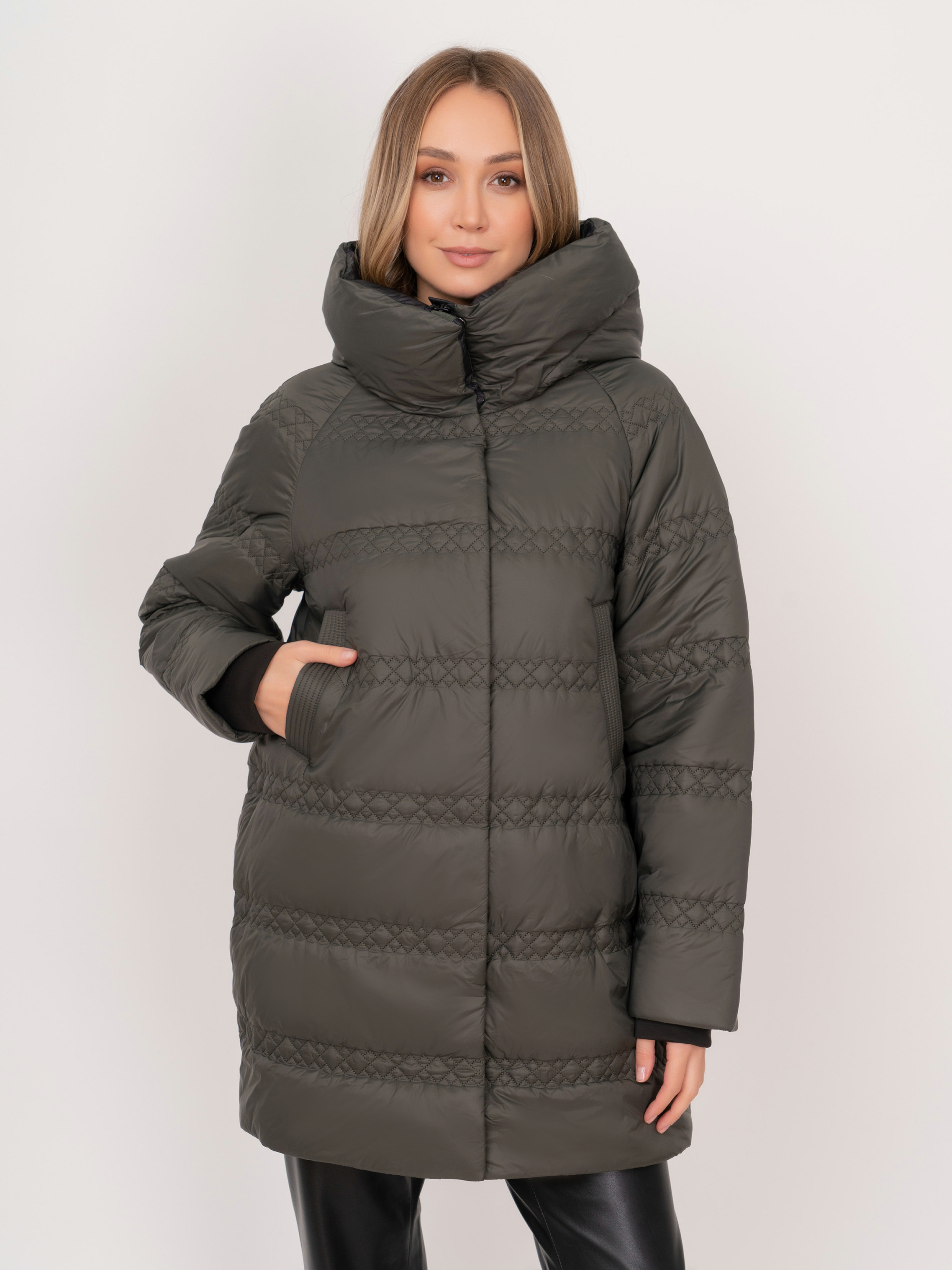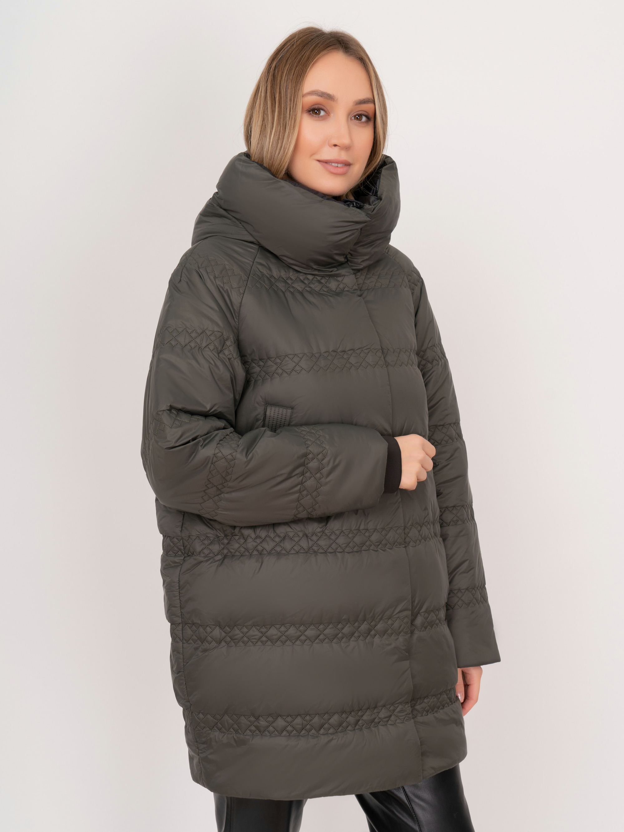 На сайте указаны российские размеры. Утепленная прямая хаки куртка на молнии и кнопках, с капюшоном, с прорезными карманами, с вышивкой. Длина по спинке: 79 см. Рост модели: 175 см.