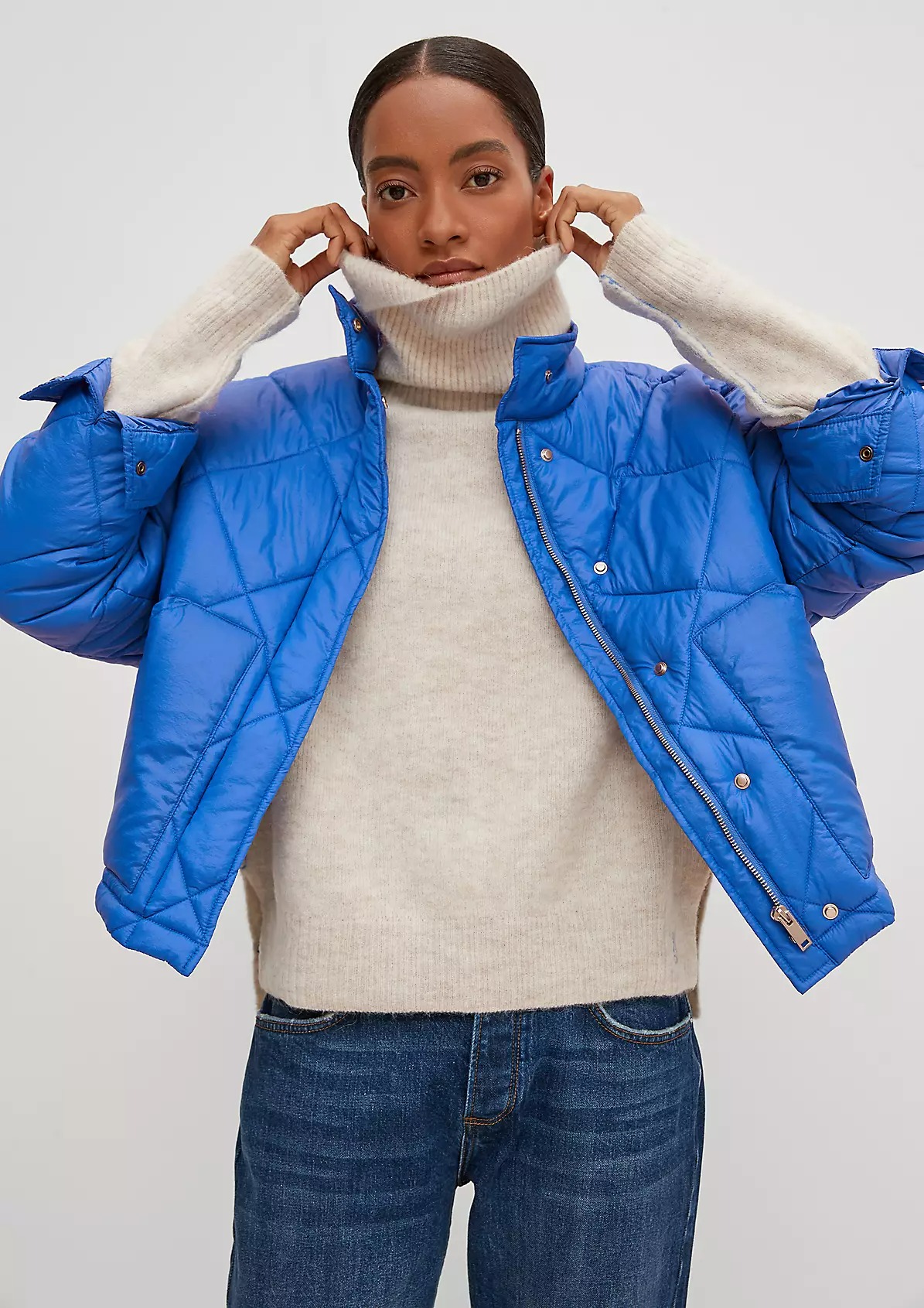 На сайте указаны российские размеры. Утепленная стеганая куртка с потайной молнией. Воротник-стойка. Рукава «летучая мышь», длинные рукава, манжеты. Накладной карман. Длина спины: 57 см в размере 42.