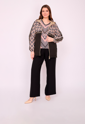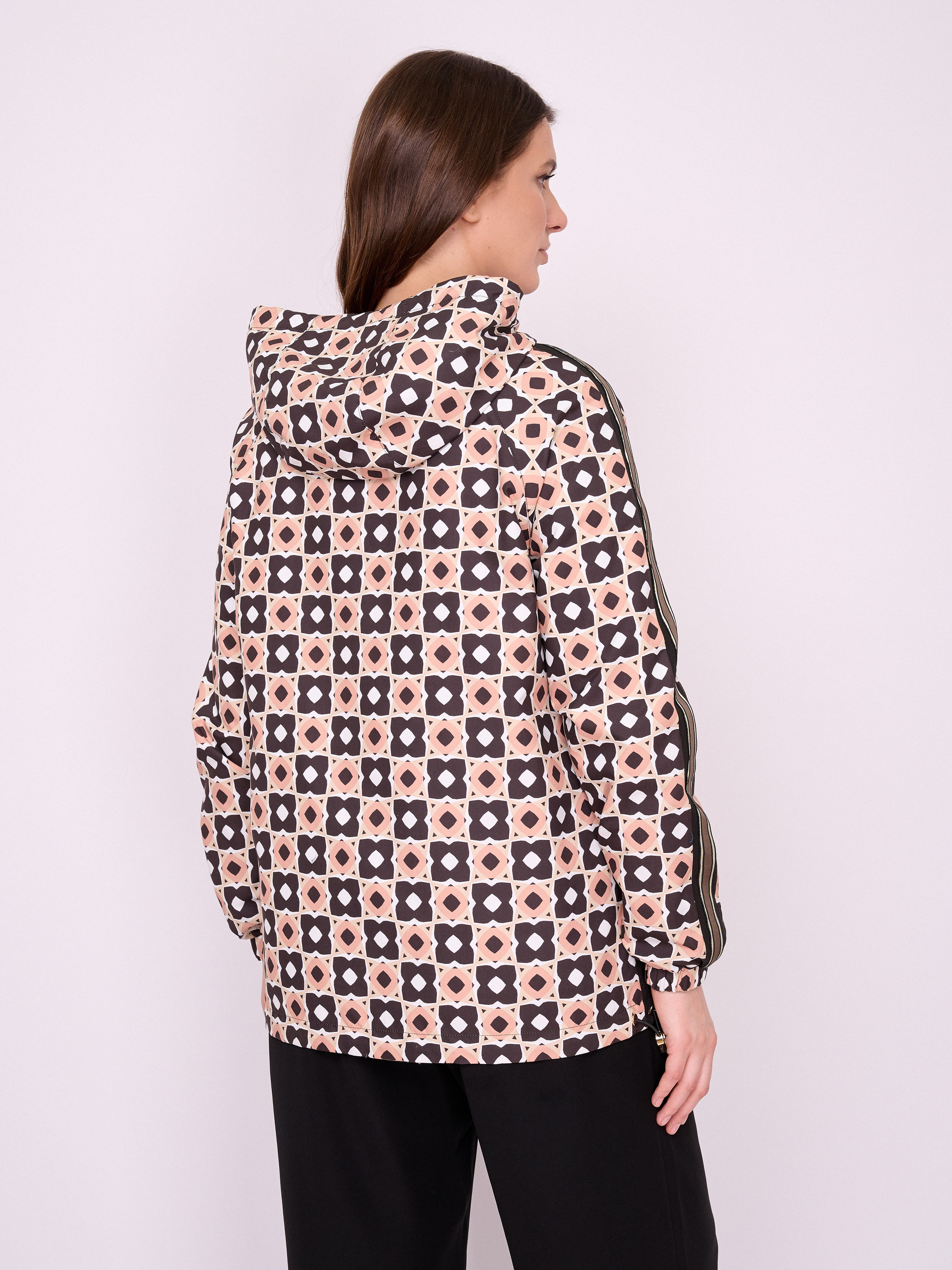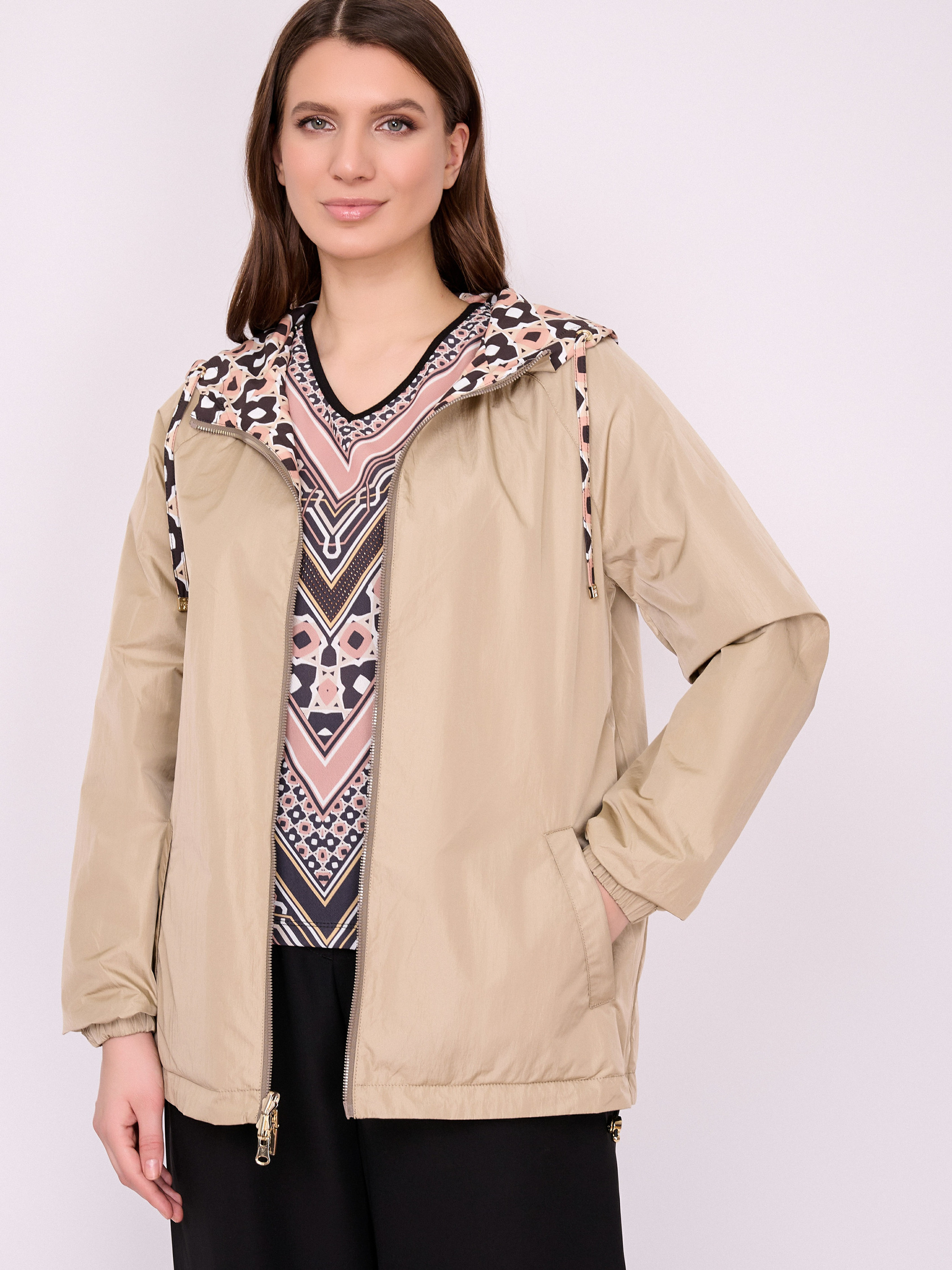 На сайте указаны российские размеры. Прямая двусторонняя куртка на молнии, с воротником капюшоном на завязках, с длинным рукавом-регланом, с прорезными карманами. Одно сторона куртки выполнена в бежевом цвете, вторая сторона куртки выполнена в черном цвете с геометрическим рисунком. Длина по спинке: 69 см. Рост модели: 175 см.