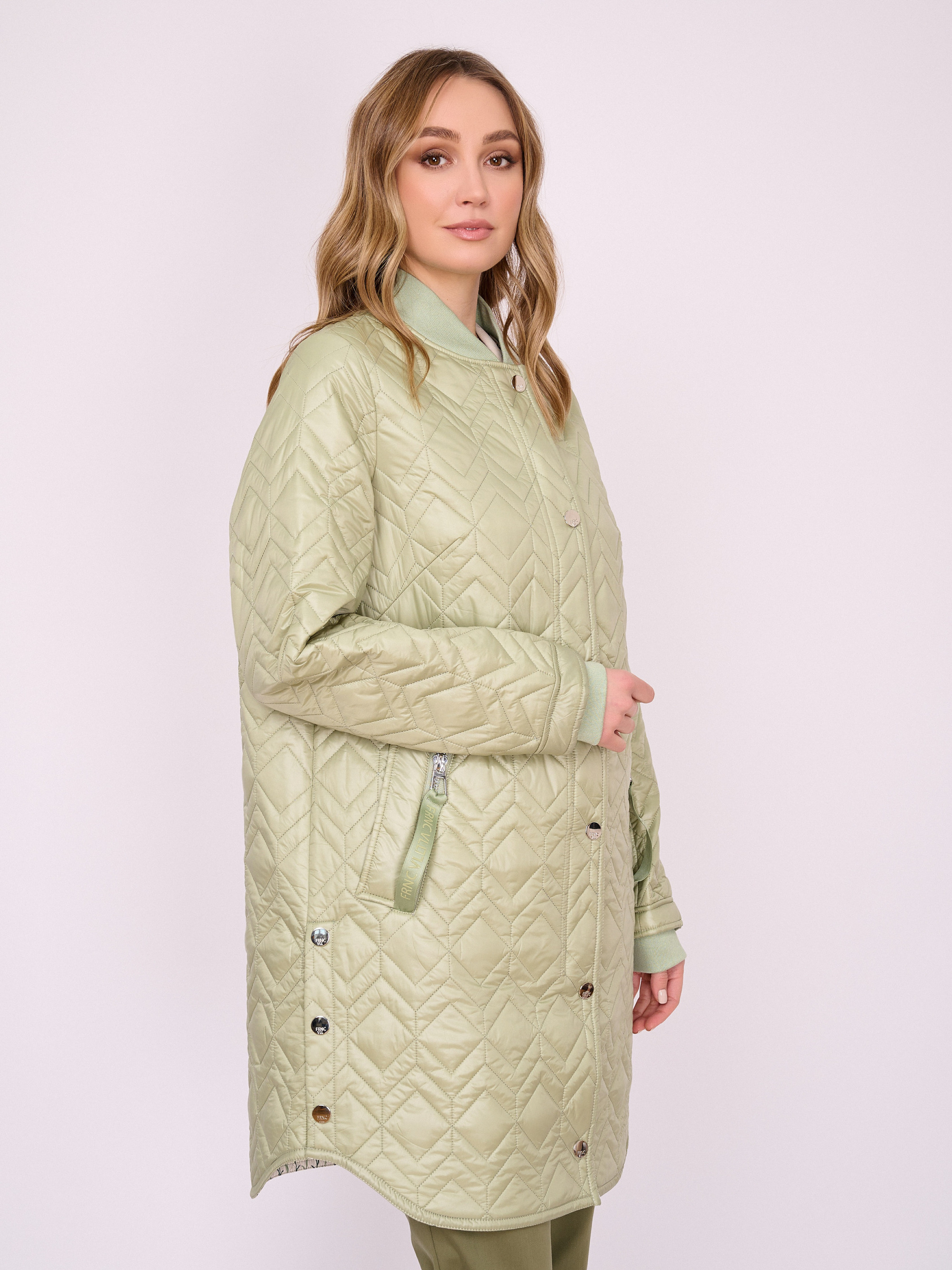 На сайте указаны российские размеры. Стеганное мятное пальто на молнии, с воротником-стойка, с длинным рукавом, с прорезными карманами на молнии, с боковыми разрезами на кнопках. Длина по спинке: 88 см. Рост модели: 175 см.