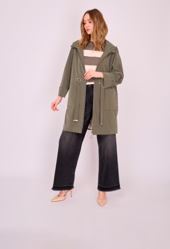 На сайте указаны российские размеры. Укороченный прямой плащ на молнии с капюшоном, длинными рукавами с отворотами, накладными карманами и кулиской по линии талии. Боковые разрезы застегиваются на кнопки. Длина по спинке: 90 см. Рост модели: 175 см.